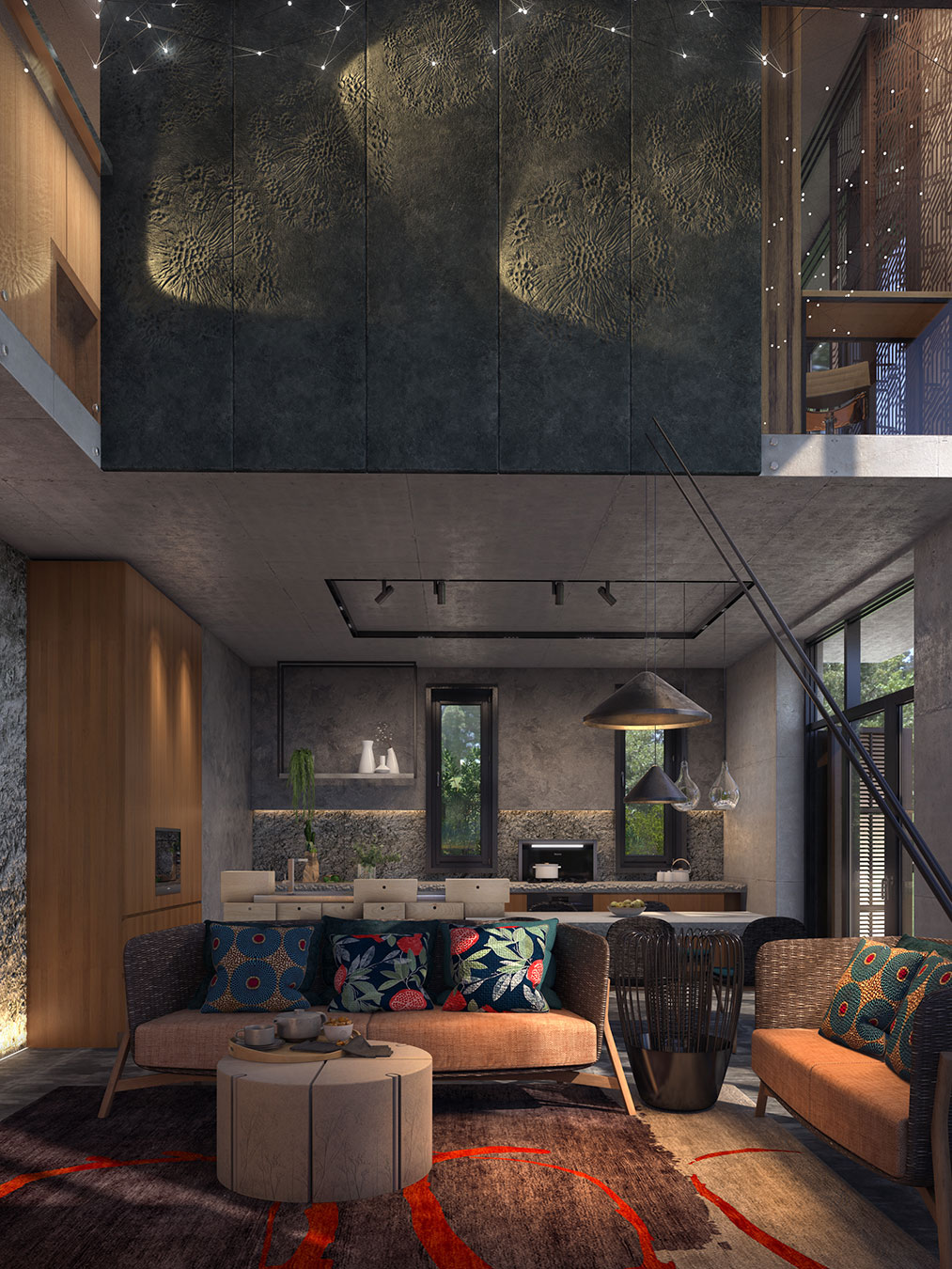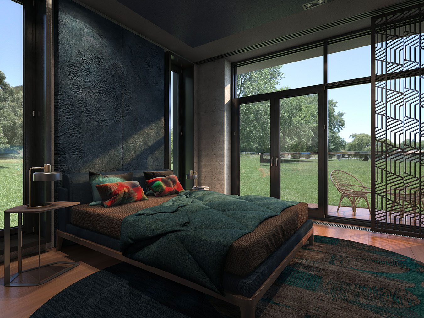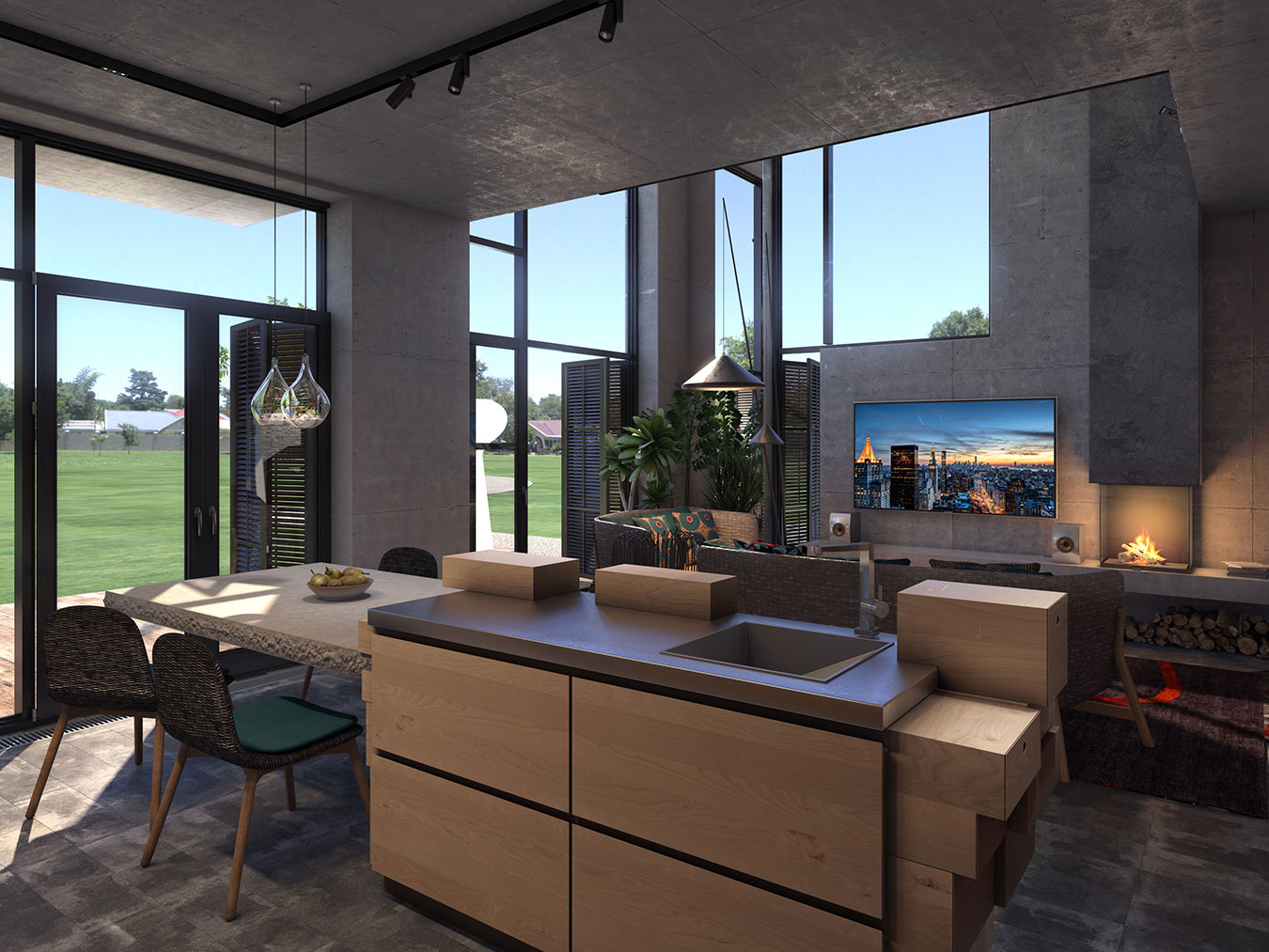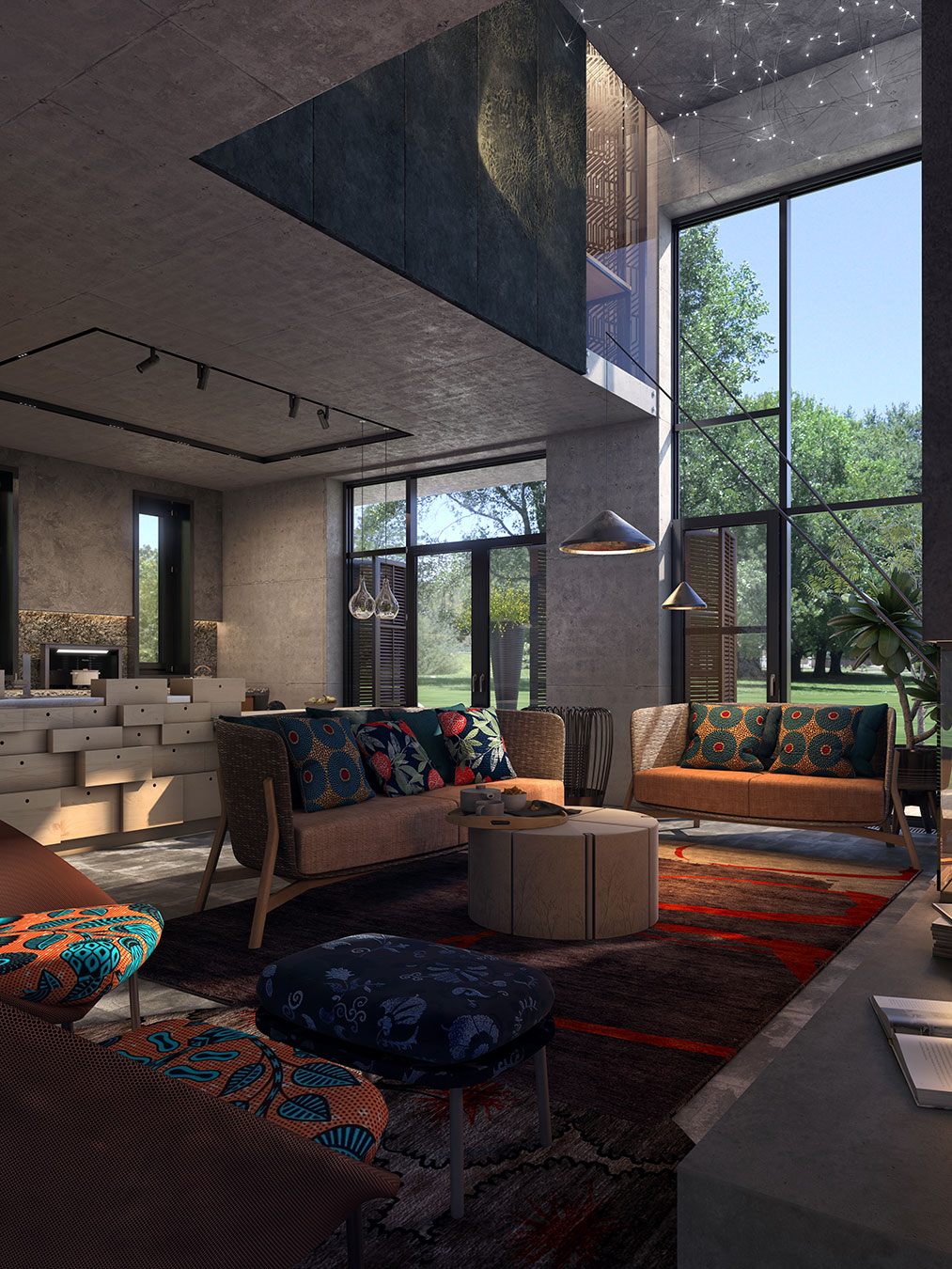 Свет проходит в дом со всех сторон: утром он проникает в спальню и кухню-столовую, а вечером солнце освещает гостиную и две большие террасы.