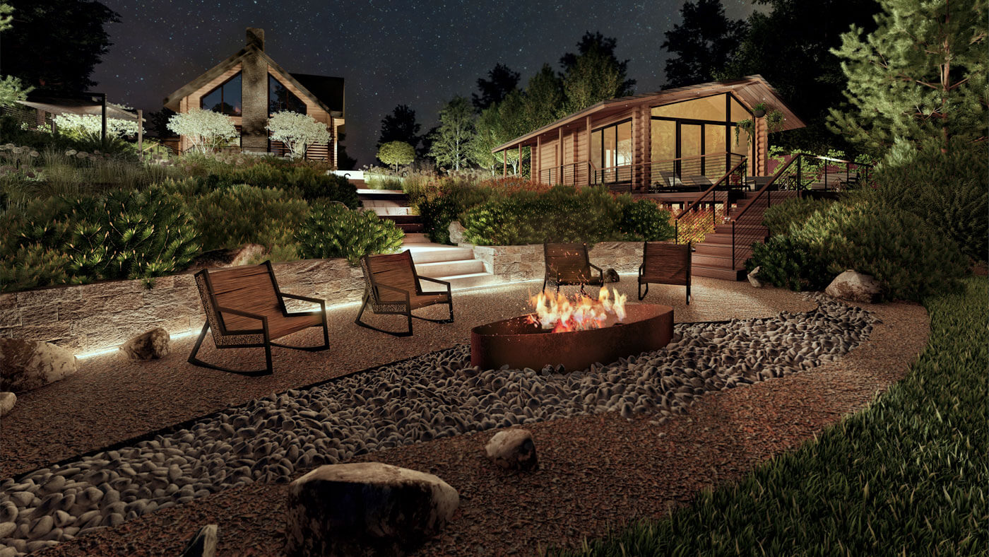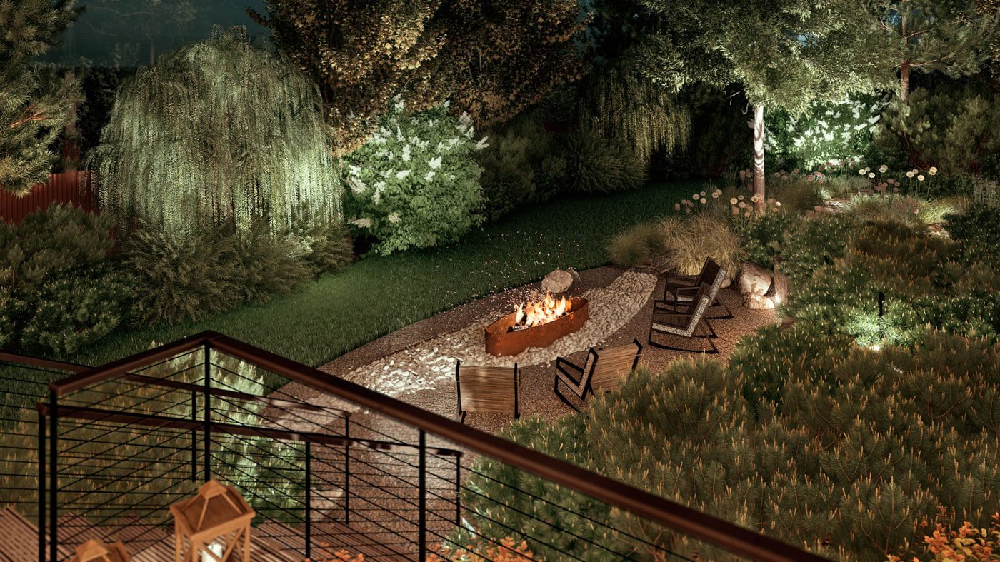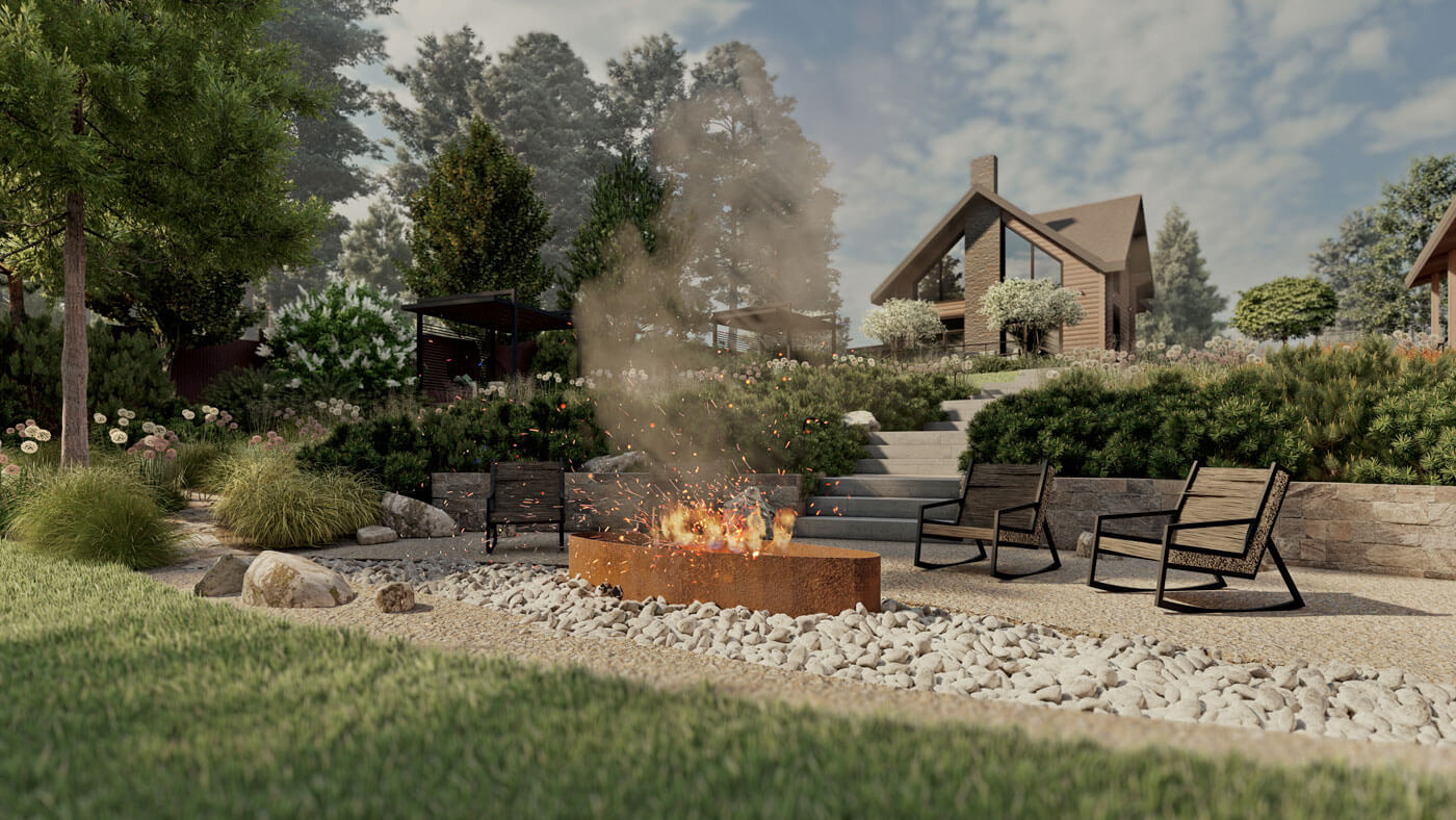 Площадка с костровищем и разные уютные места для отдыха в саду максимально деликатно вписываются в идею природности.