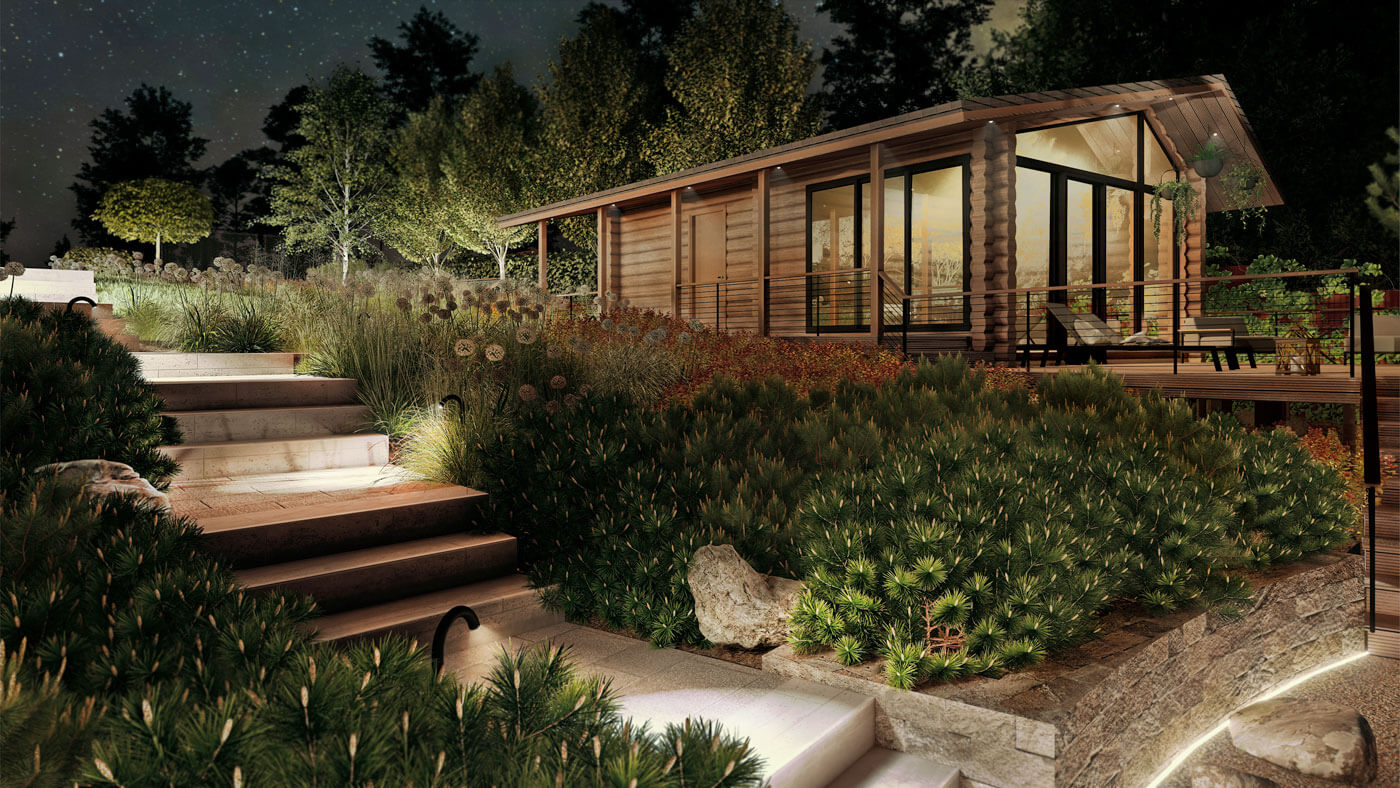 Особенности проектирования задал рельеф участка: большой перепад высот, жилой дом, построенный в верхней части участка.