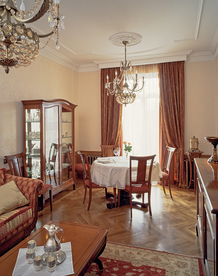 Гостиная решена в традиционном ключе. Пол выложен паркетом с классической раскладкой «елочкой», а стены декорированы бело-золотыми текстильными обоями и дубовыми рельефными буазери. Мягкая зона выдержана в темно-красных и золотистых тонах. «Колониальная» тема отражена в гостиной-столовой при помощи ковра с восточным рисунком в той же золотисто-бордовой цветовой гамме. Ощущение уюта привносит живопись в духе старых мастеров в соответствующем обрамлении.