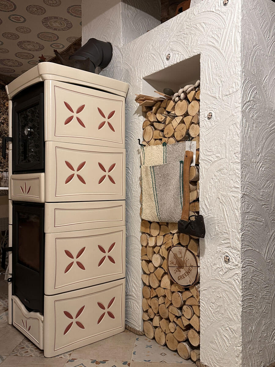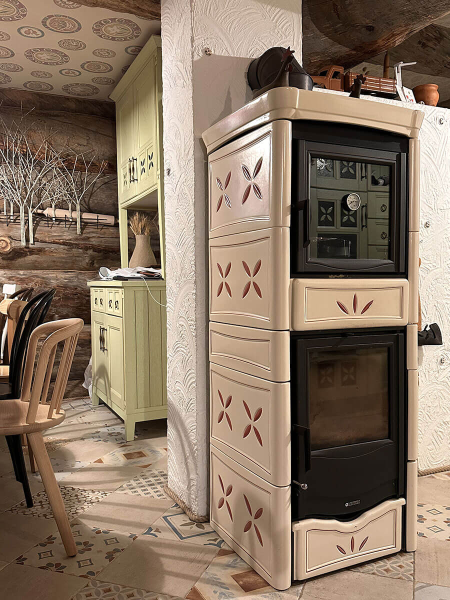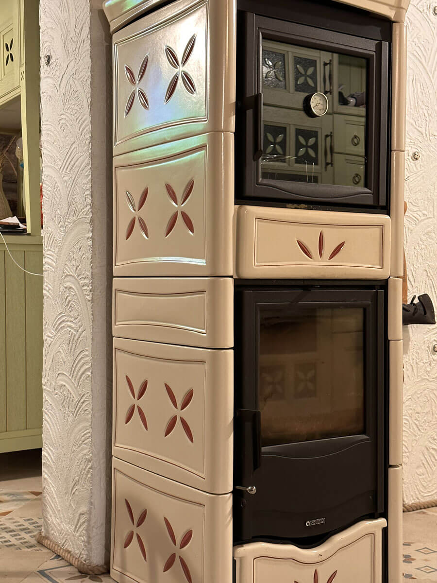 Печи в данном проекте решено было использовать La Nordica: они долго держат тепло, удобны в обслуживании, при этом, благодаря своему дизайну, превосходно вписались в рустикальный стиль загородной усадьбы, являясь изюминкой интерьера. Данная модель Nicoletta оборудована духовым шкафом. Именно её было решено установить в зоне кухни-столовой. Блюда, приготовленные в настоящей печи на дровах, имеют особый вкус и аромат.