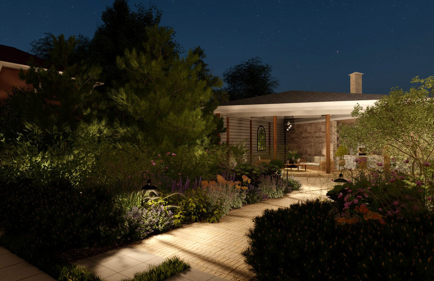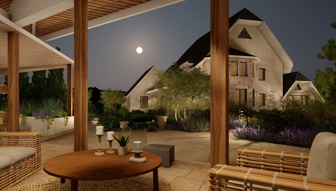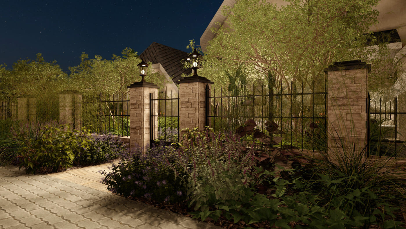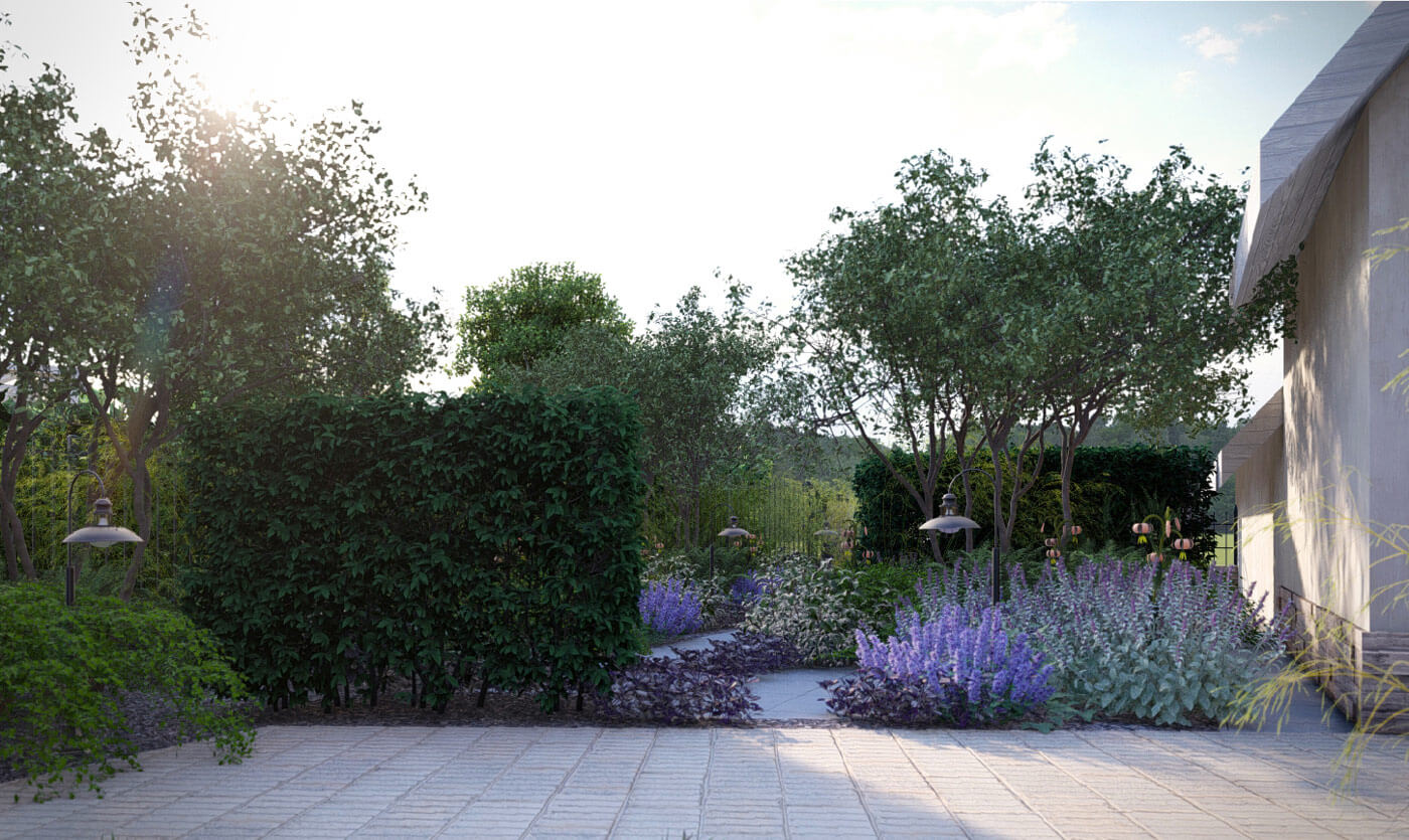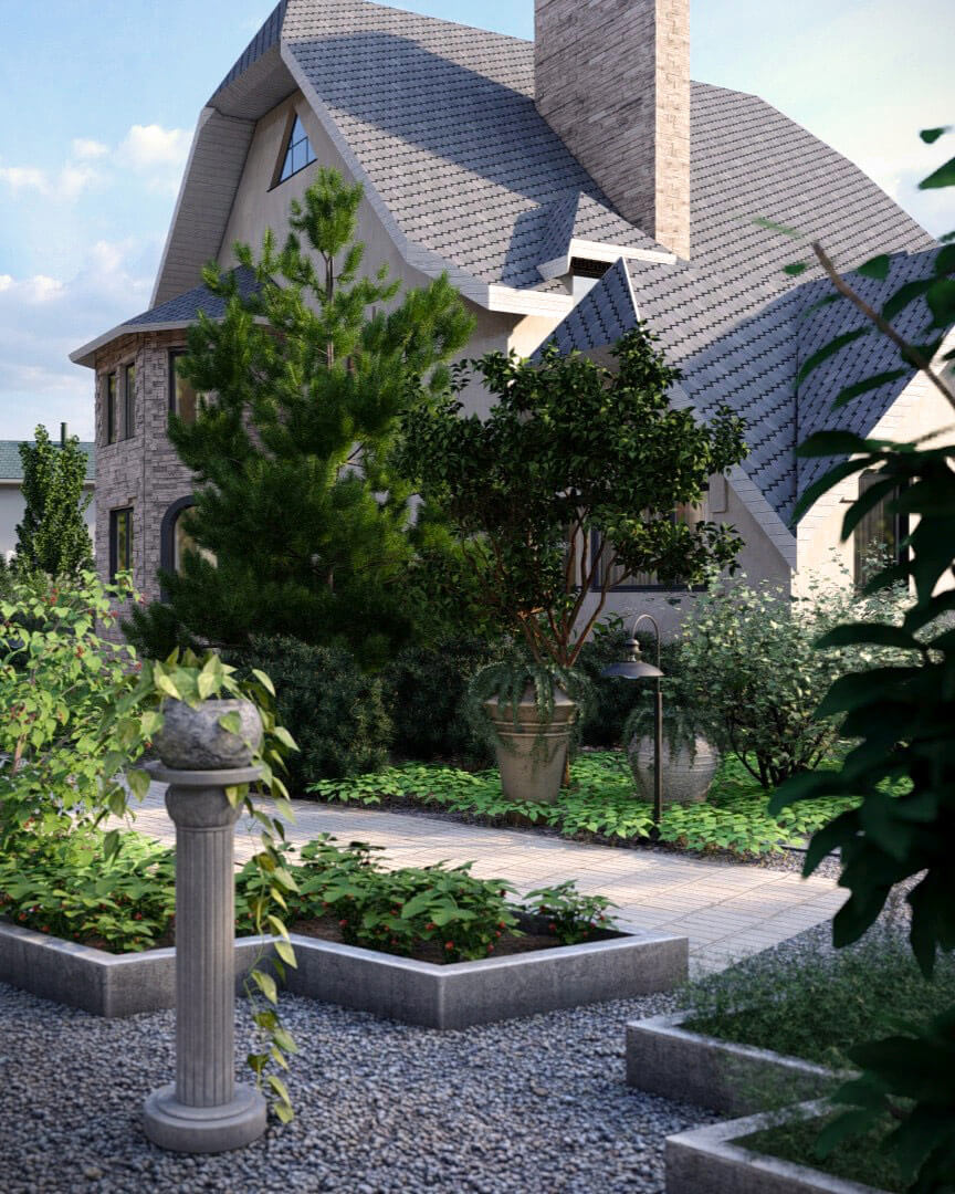 Основная идея для сада вокруг дома заключается в синтезе образа французского дворика с элементами «заброшенного» классического французского сада. Осевой принцип построения сада сохраняется, однако оси смещены и развернуты. Знаменитые французские узорные партеры в этом саду представлены хаотично разбросанными полосами стриженных изгородей, которые «расползлись» и частично преобразились в полосы вечнозеленых насаждений. Слегка небрежные, пышные посадки в сочетании с коваными и стрижеными формами изгородей создают на участке баланс между романтичной небрежностью бретонского дворика и аккуратной строгостью регулярного сада.