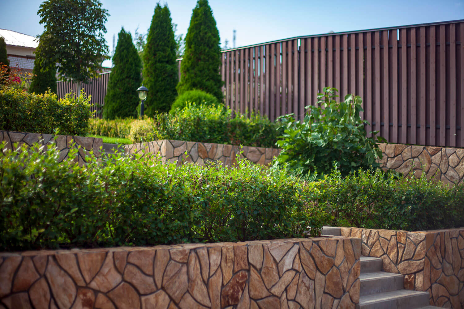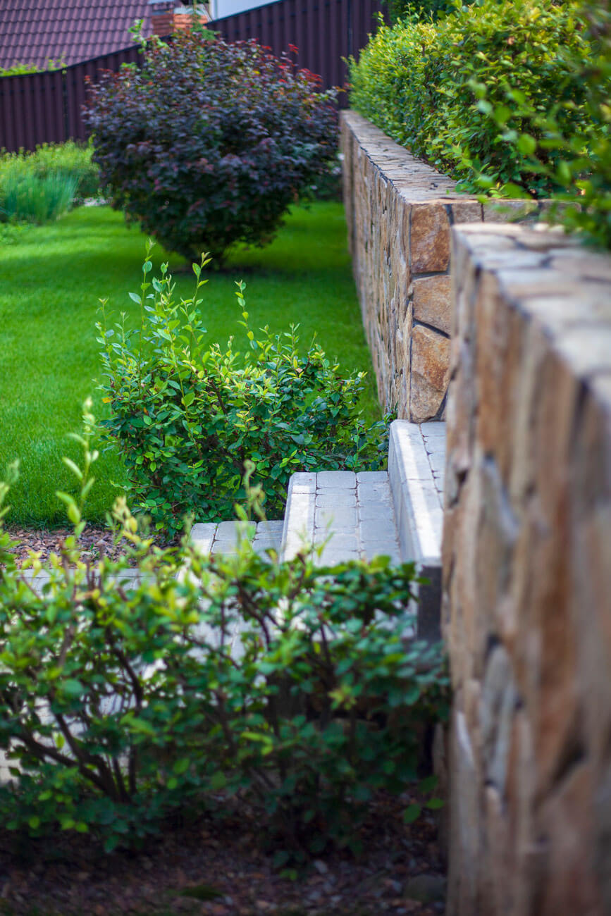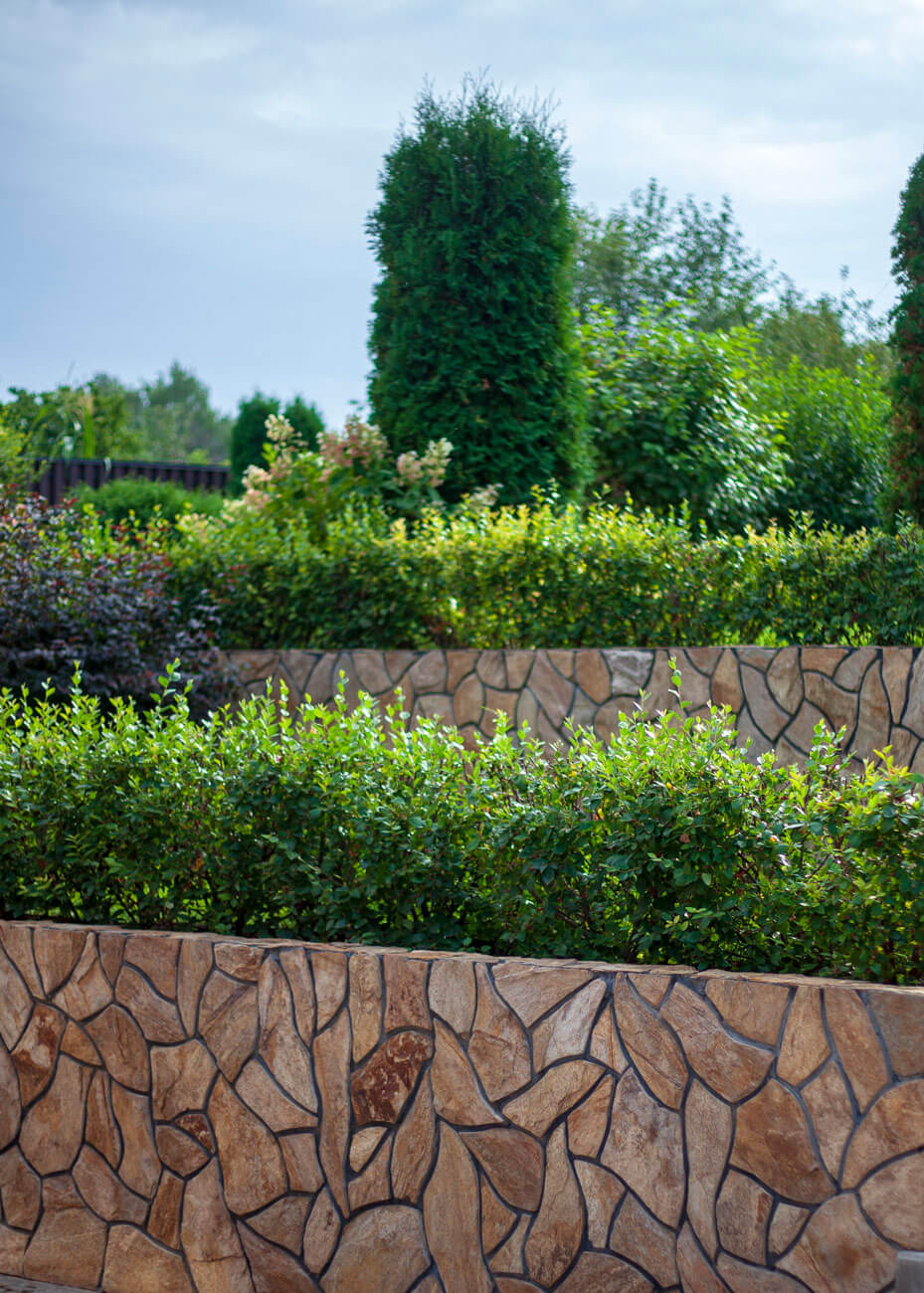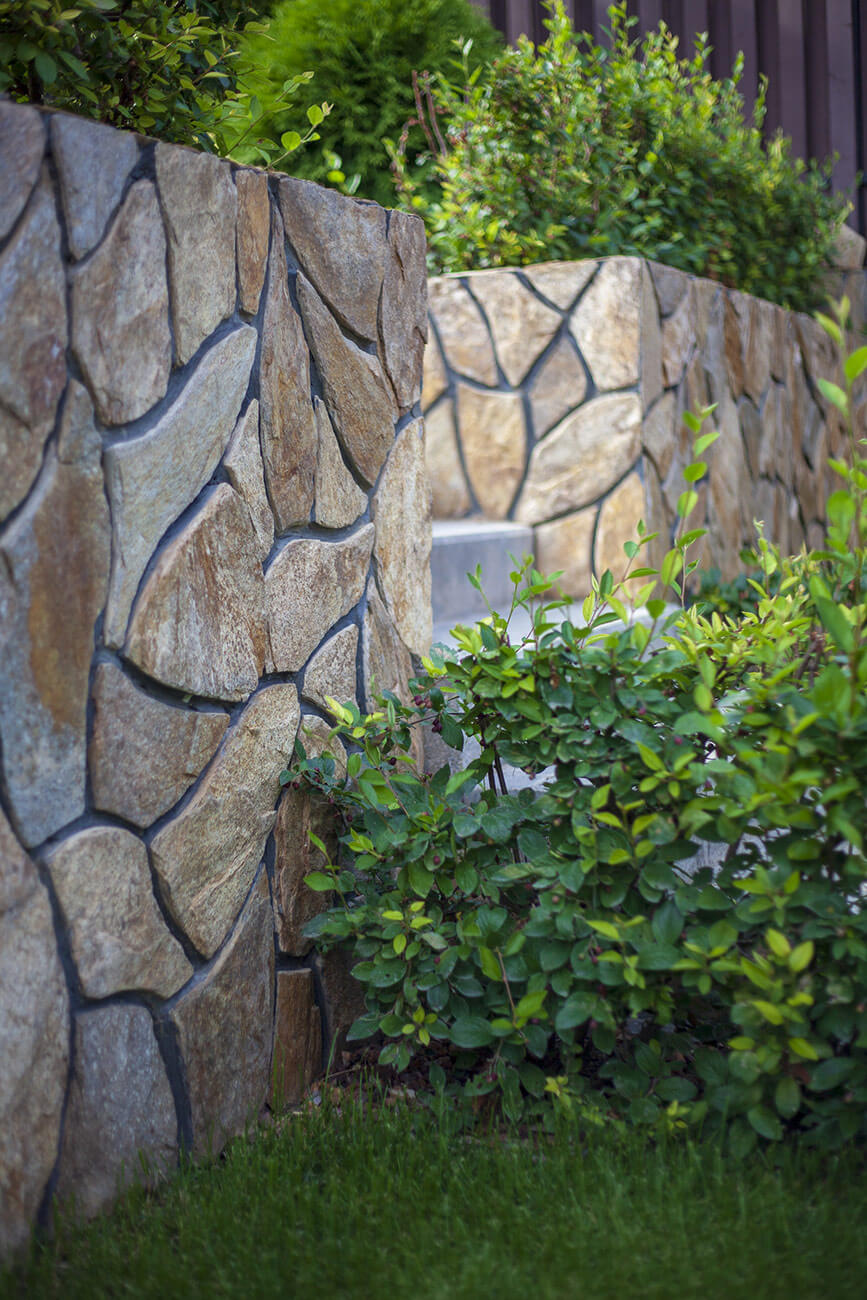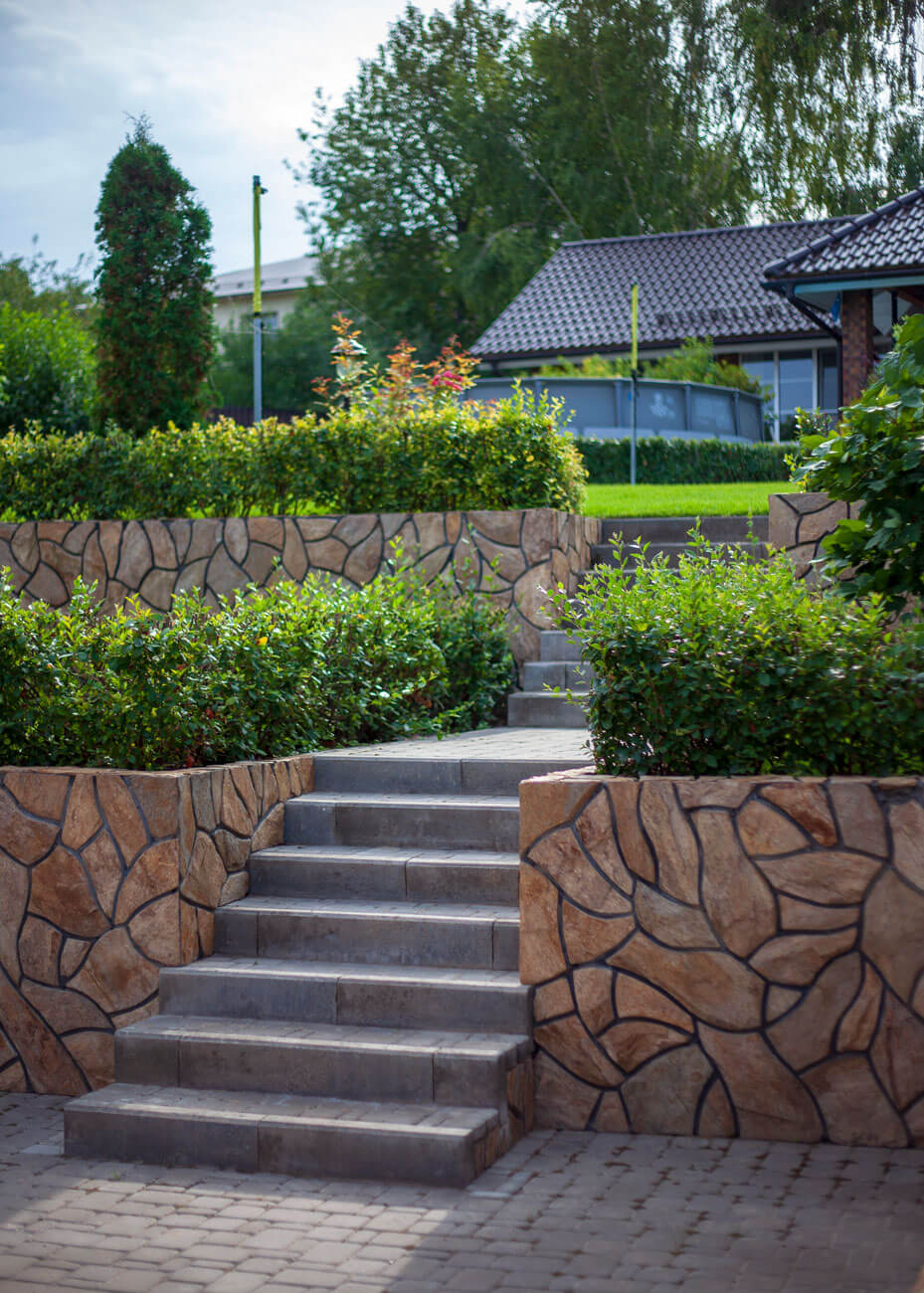 Бетонные подпорные стенки отделывали камнем златолит с применением обработки краевкаменных плит, трудоемкий и длительный процесс обработки каждого камня вывел общую концепцию участка на новый технологичный уровень за счет этого высокие подпорные стенки приобрели легкий утонченный вид.
