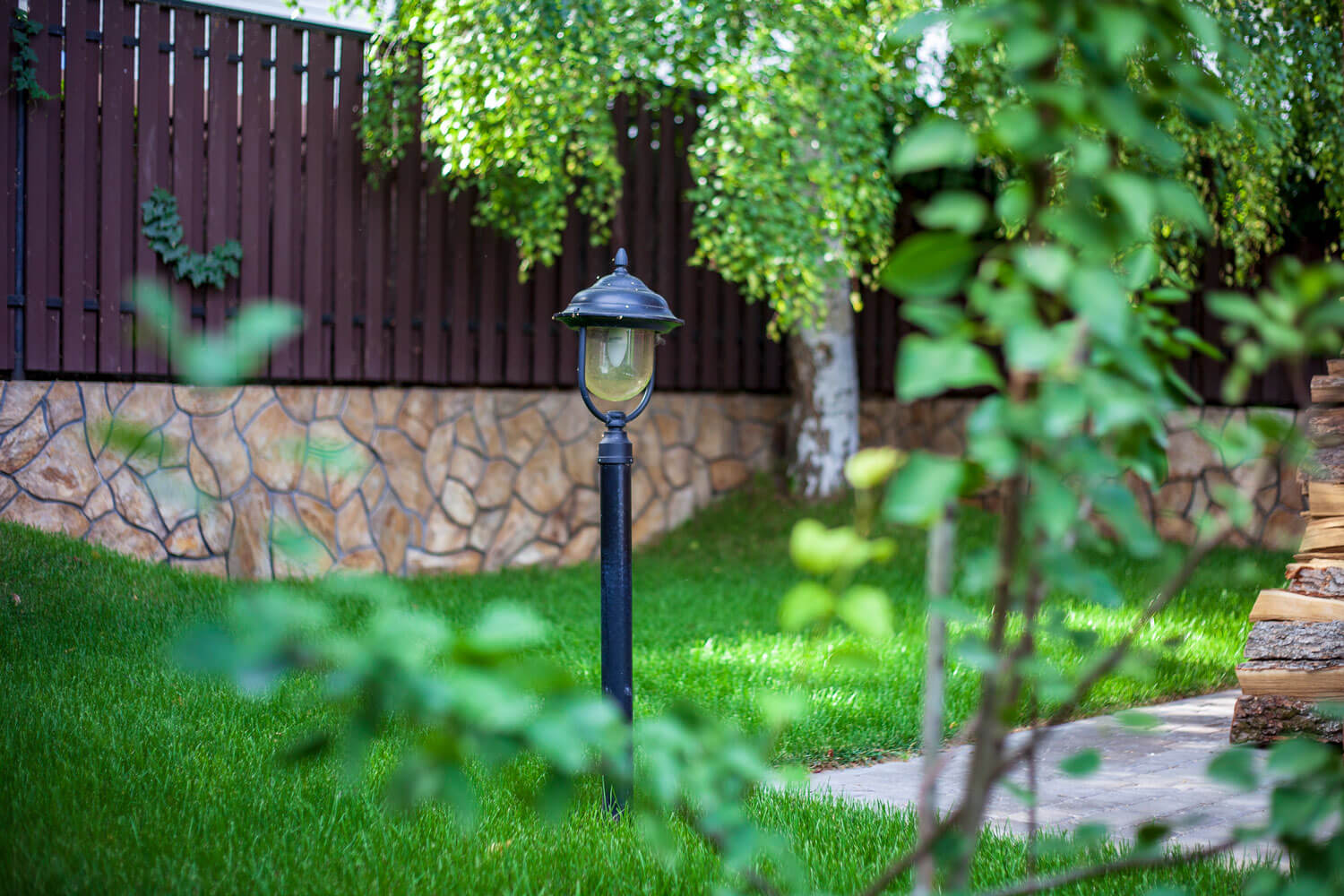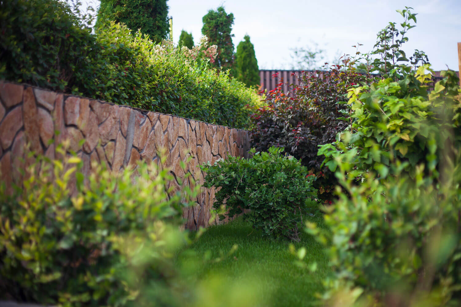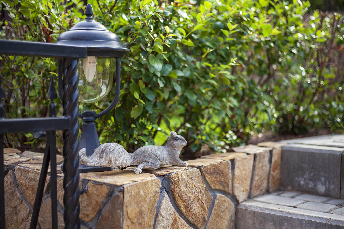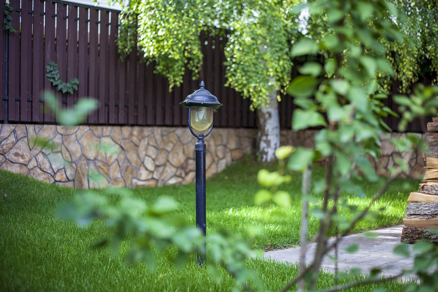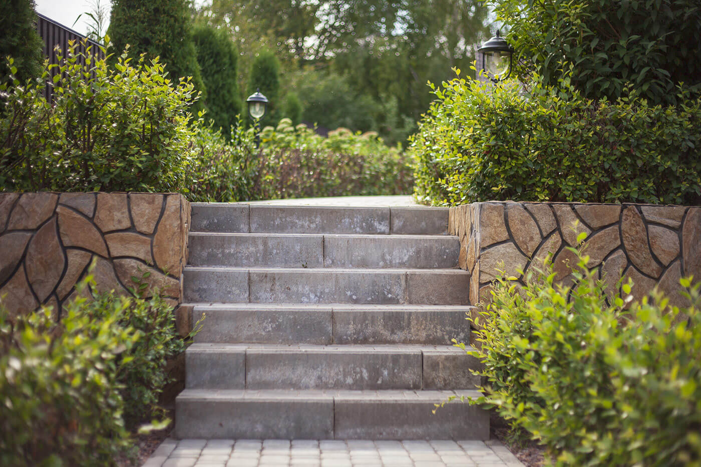 Бетонные подпорные стенки отделывали камнем златолит с применением обработки краевкаменных плит, трудоемкий и длительный процесс обработки каждого камня вывел общую концепцию участка на новый технологичный уровень за счет этого высокие подпорные стенки приобрели легкий утонченный вид.