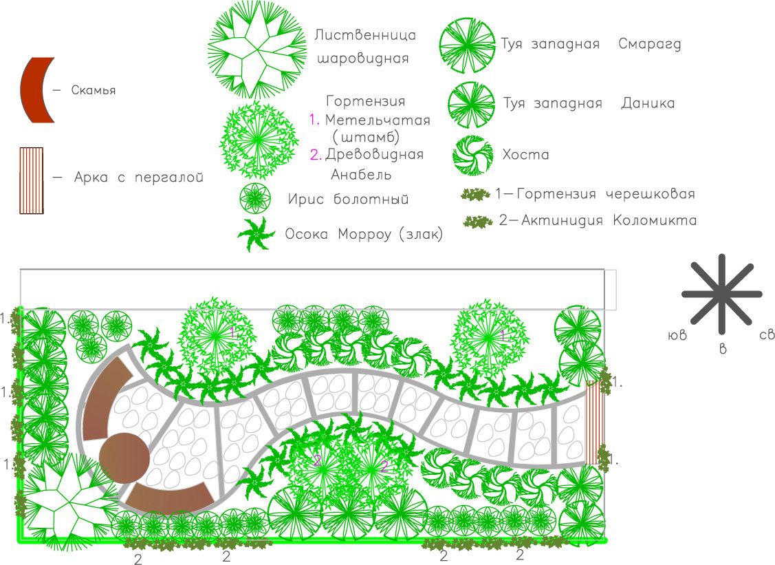 Чтобы придать саду стилистически законченный вид мы использовали следующие растения: ирис аировидный Вариегата, хосту гибридную Wolverine, актинидию Аргута, осоку Морроу.
