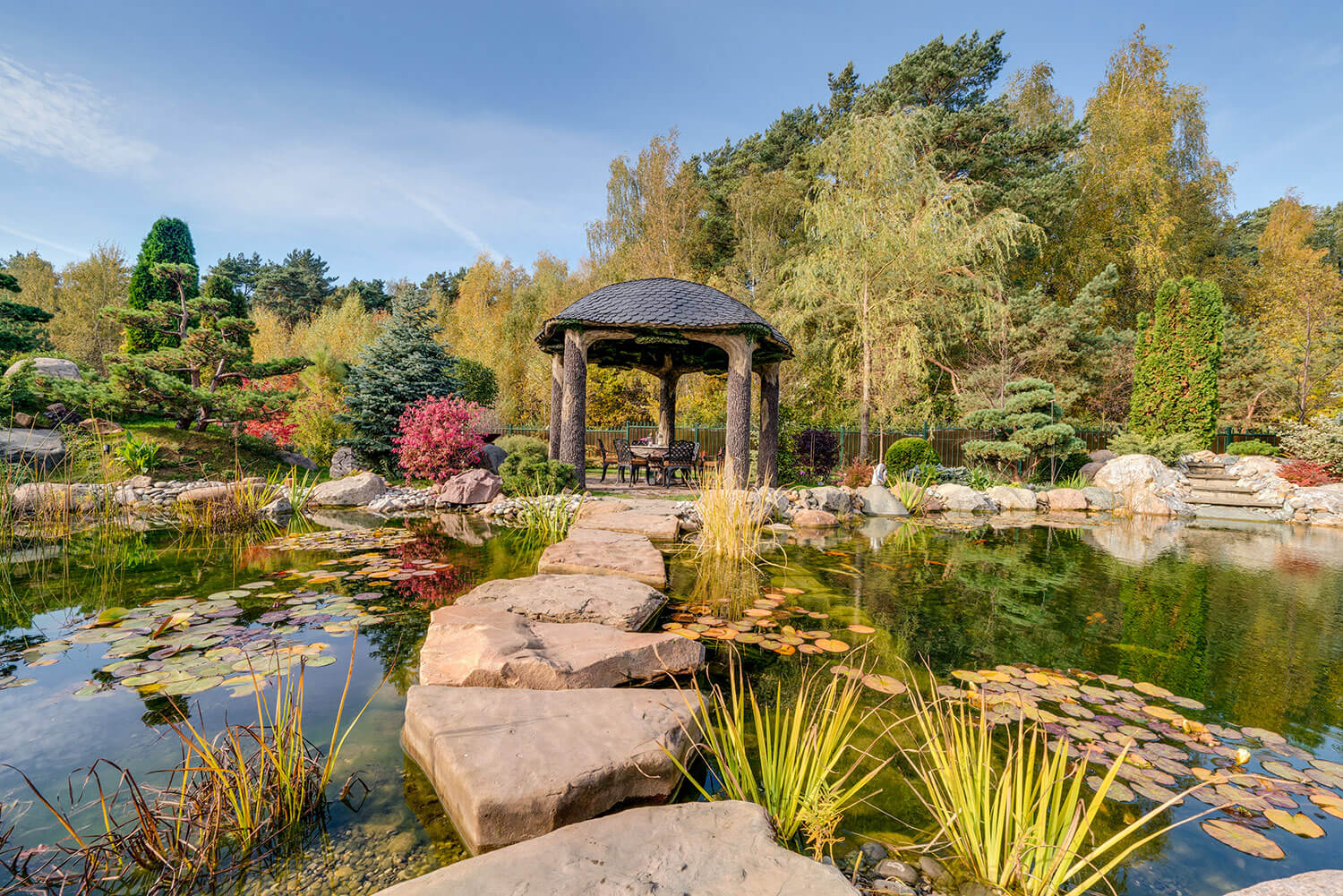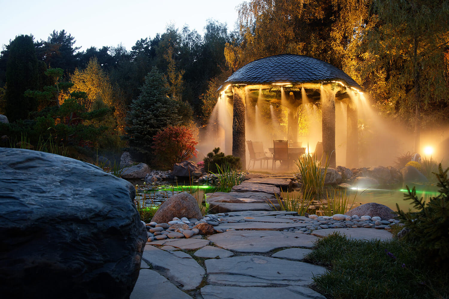 Ротонда в виде переплетенных деревьев с мелкодисперсным распылением воды расположена на берегу комбинированного пруда с водопадами, рыбками, водными растениями.