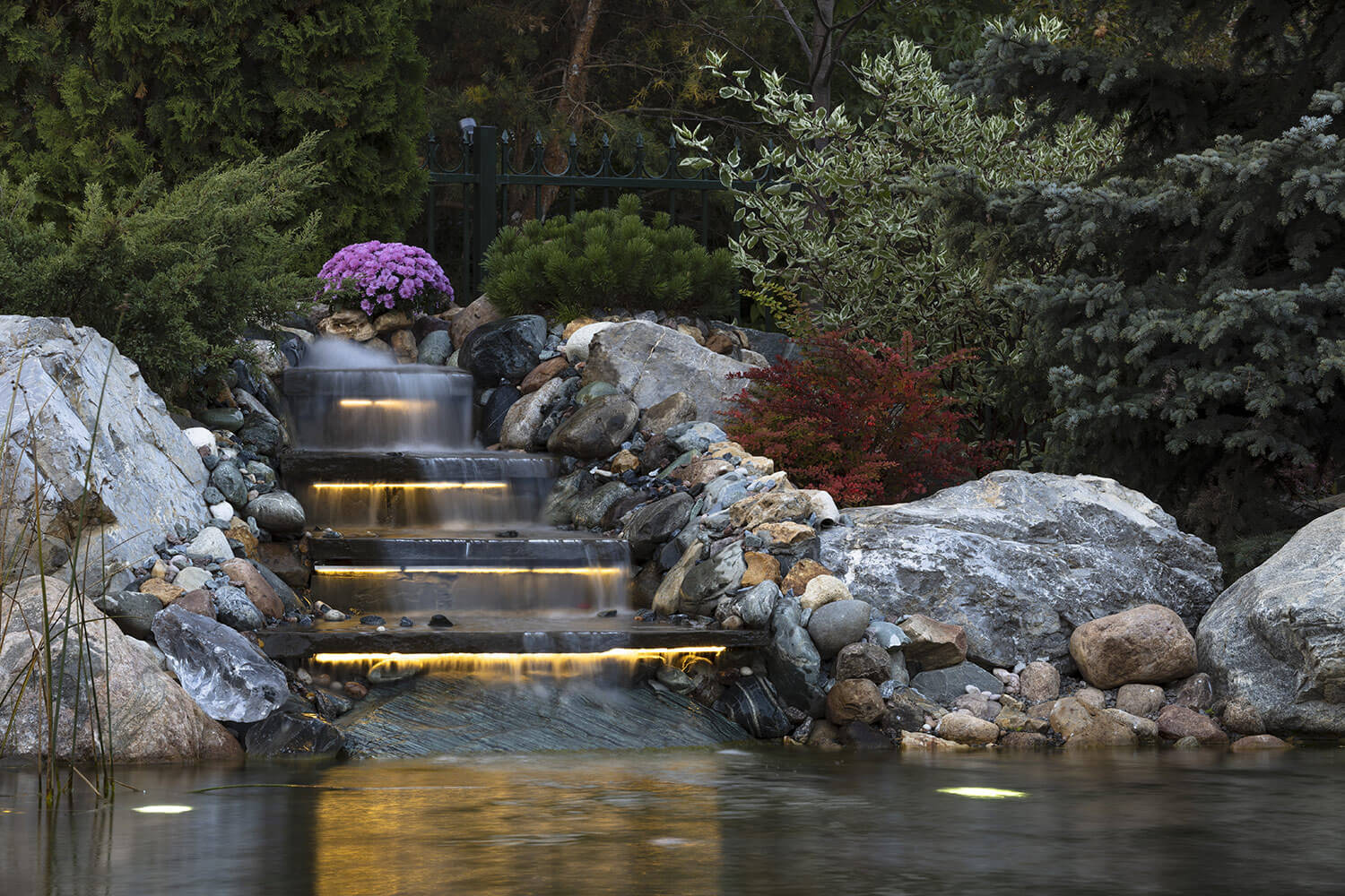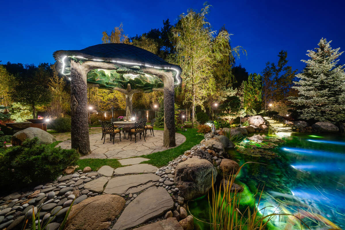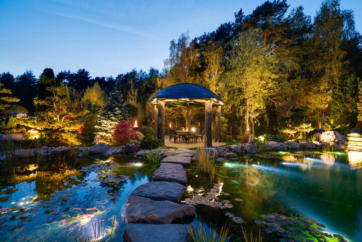 Комбинированная подсветка в ночное время по-новому раскрывает сад, а удаленное управление с мобильных устройств позволяет регулировать цветовую гамму и насыщенность освещения в зависимости от настроения.