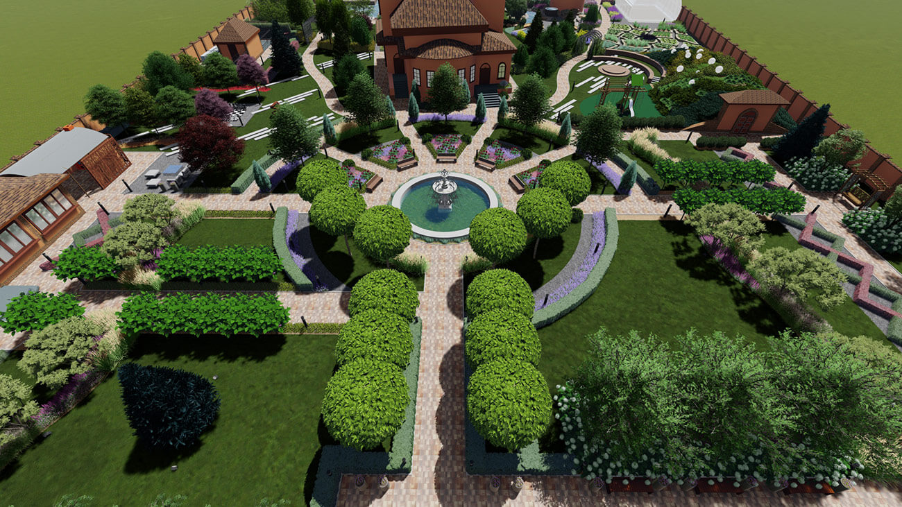Основу регулярной части сада составляет центральный фонтан, вокруг которого расходится система дорожек в виде лучей. По ним удобно можно попасть в любую зону - чайному дому, зоне барбекю, садовым лавочкам, зоне отдыха с качелями или просто прогуляться. Полукруглая лучевая система дорожек визуально центрирует основной дом и зрительно выравнивает его оси. Ковры газона, аккуратно подстриженные кустарники, фонтан и главный дом в комплексе создают атмосферу торжества. Со всех площадок открывается перспективный вид на цветники и лужайки.