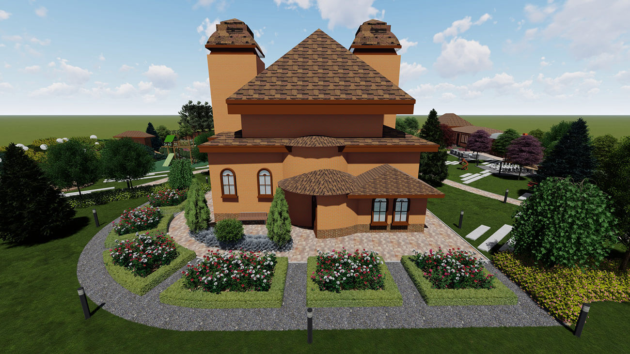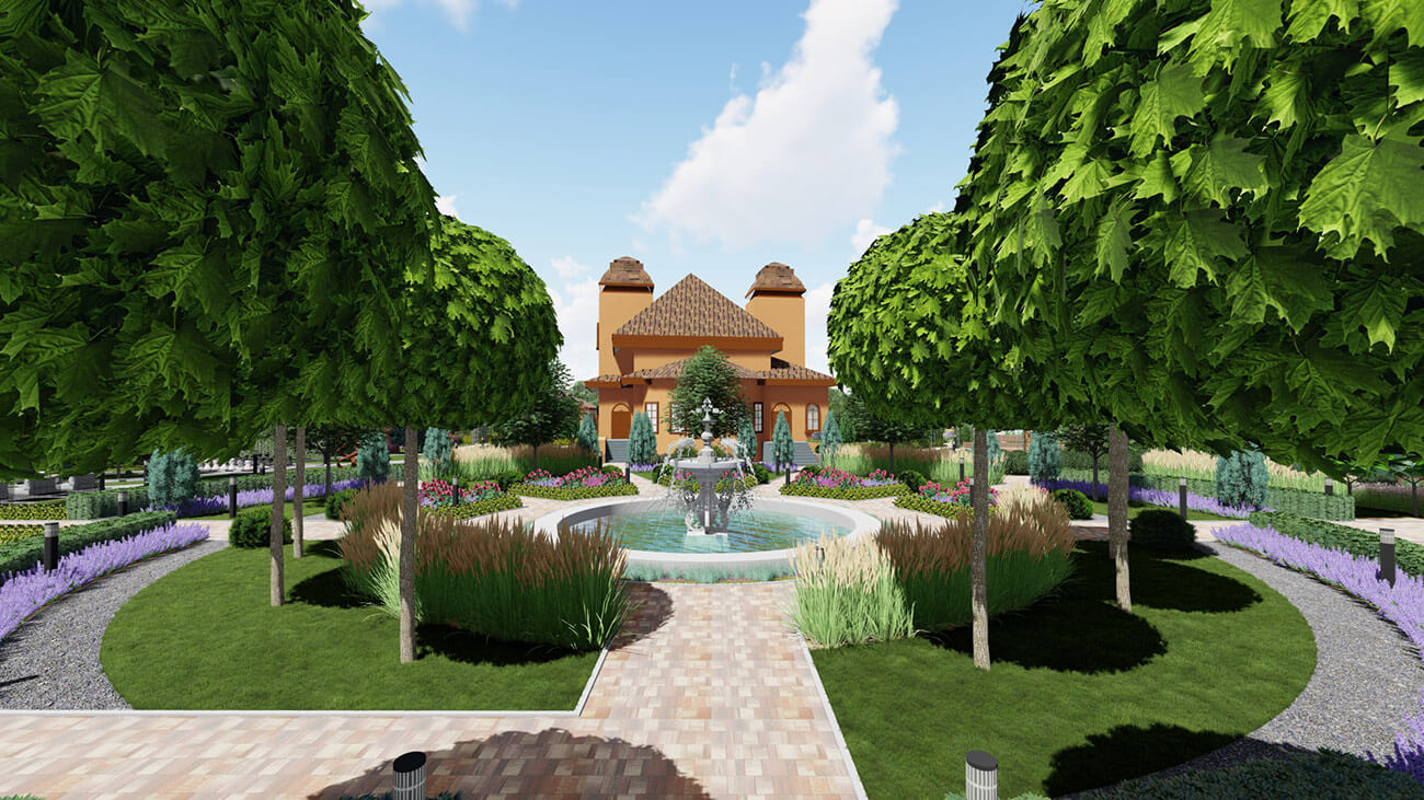 3. Огонь. Это место отдыха с барбекю, уличными шахматами, массивом из деревьев с яркой осенней окраской, цветники, розарий. Стихию усиливают насыщенные оттенки желтого, оранжевого и красного, которые присутствуют в цветниках и розарии.