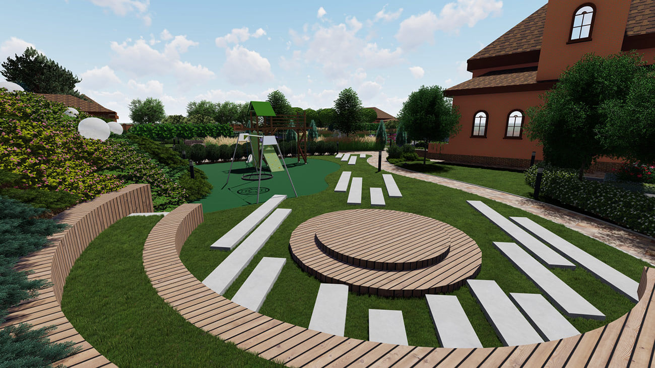 2. Земля. Эта зона включает в себя погреб с холмом, детскую площадку, огород , плодовый сад, теплицу и сад пряных трав. Стихию усиливает геопластика холма из почвопокровных растений и вписанный туда амфитеатр для детской зоны.