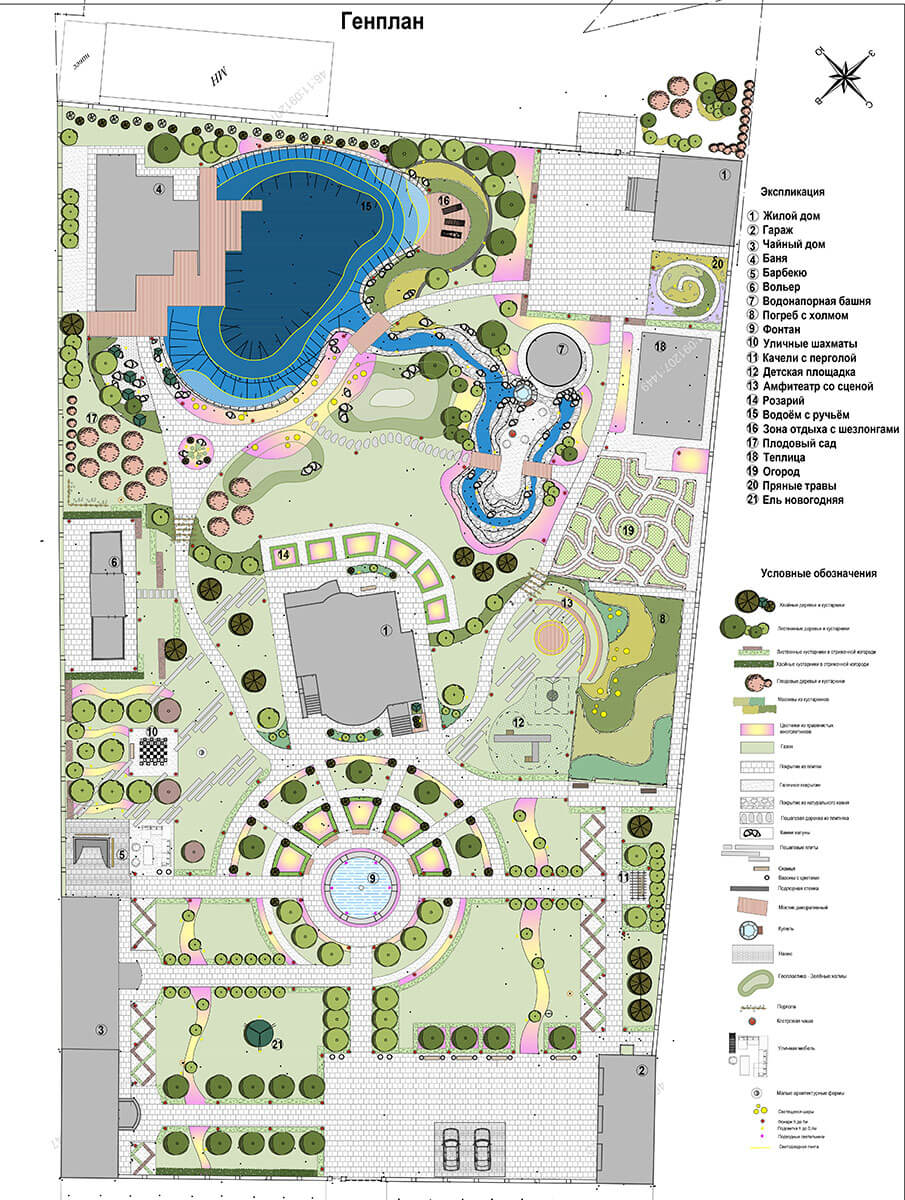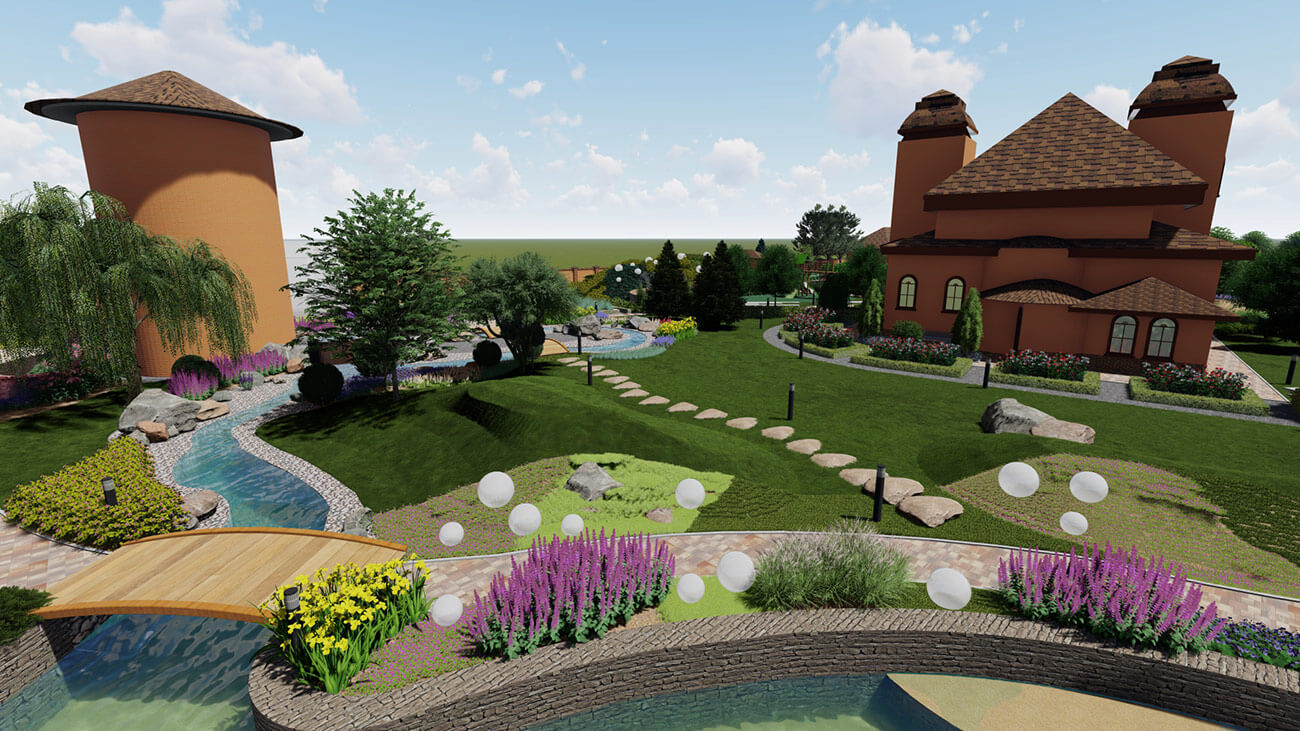 4. Вода. К этой зоне относиться просторный водоём для купания, извилистый ручей с островом где находится купель, водонапорная башня с водопадом. Стихию усиливают шум падающей воды, мостики, декоративная галька, посадки растений с плакучей формой кроны , цветники и миксбордеры в синих, голубых, фиолетовых, белых оттенках.