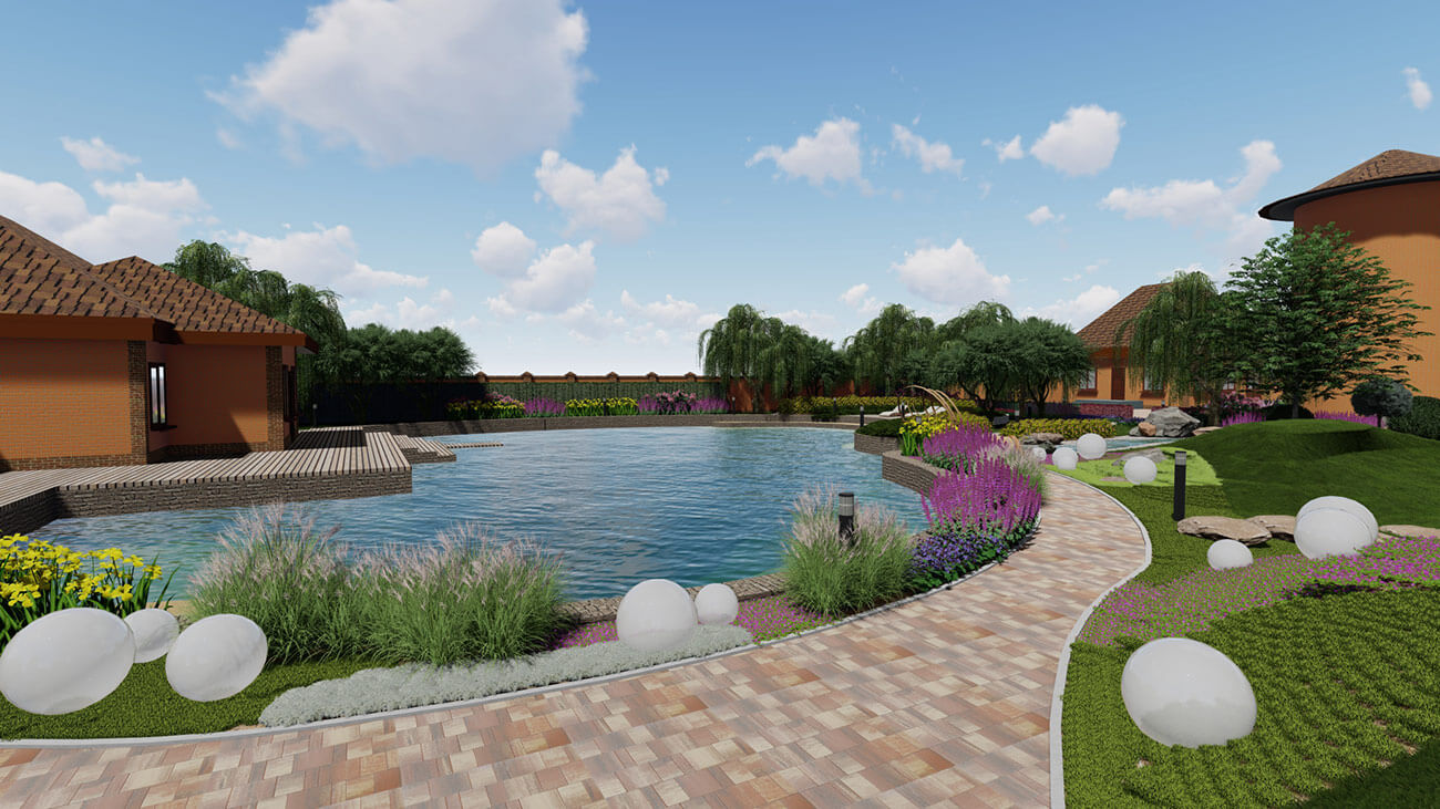 Пейзажная часть сада расположена за домом. Ручей берёт своё начало с водонапорной башни, проходя через каскад мостиков, перетекает в водоём. Со стороны бани предусмотрен большой настил для отдыха у воды. В водоеме сделано несколько террас-ступеней для удобного захода в воду. На противоположном берегу запланирована небольшая площадка для шезлонгов.