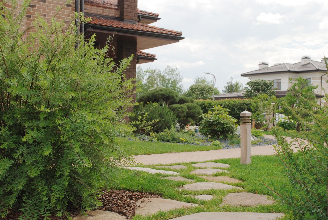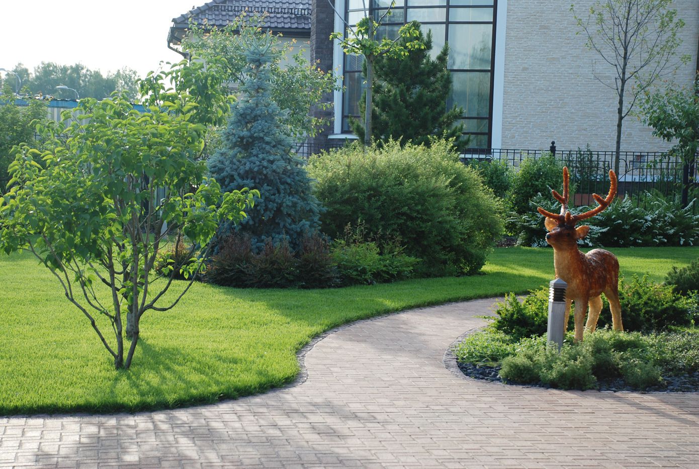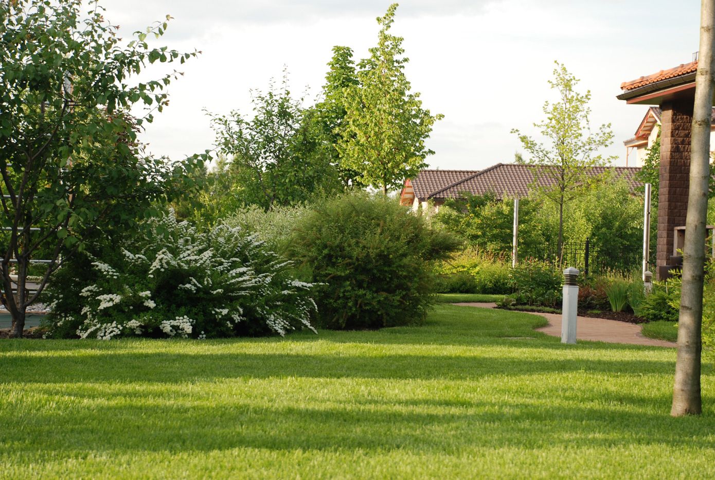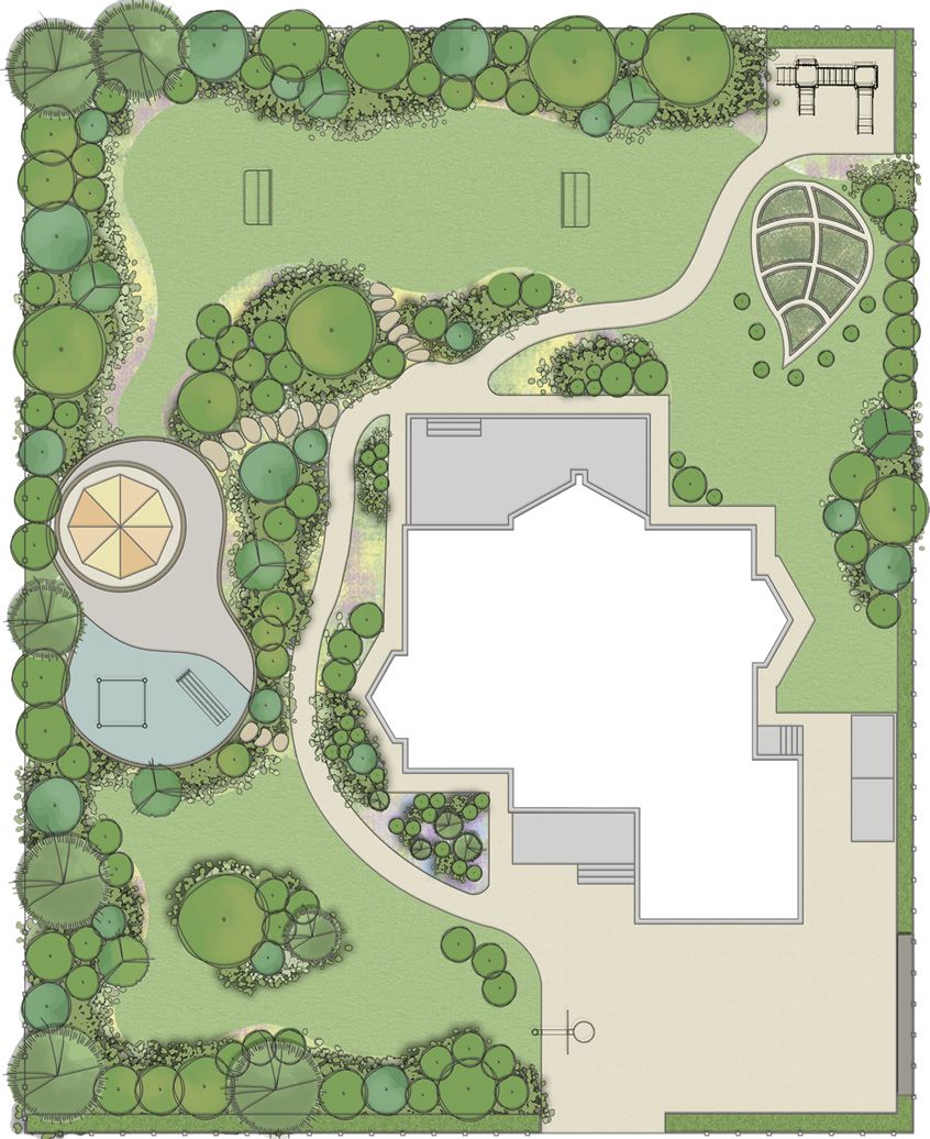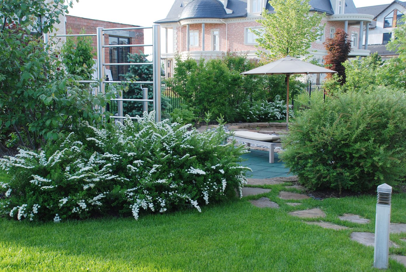 Сад со свободной планировкой на участке площадью 30 соток. Открытый солнечный участок должен стать местом отдыха для всей семьи, состоящей из всех возрастных групп. Большое внимание уделяется детскому досугу: в саду предусмотрена детская площадка, песочница по индивидуальному проекту с углубленной чашей, защищенной от нагрева уличным зонтом. Песочницу окружает покрытие из морской гальки, хождение по которой является профилактикой плоскостопия. Рядом с песочницей располагается небольшой спортивный комплекс на специализированном покрытии для занятий спортом.