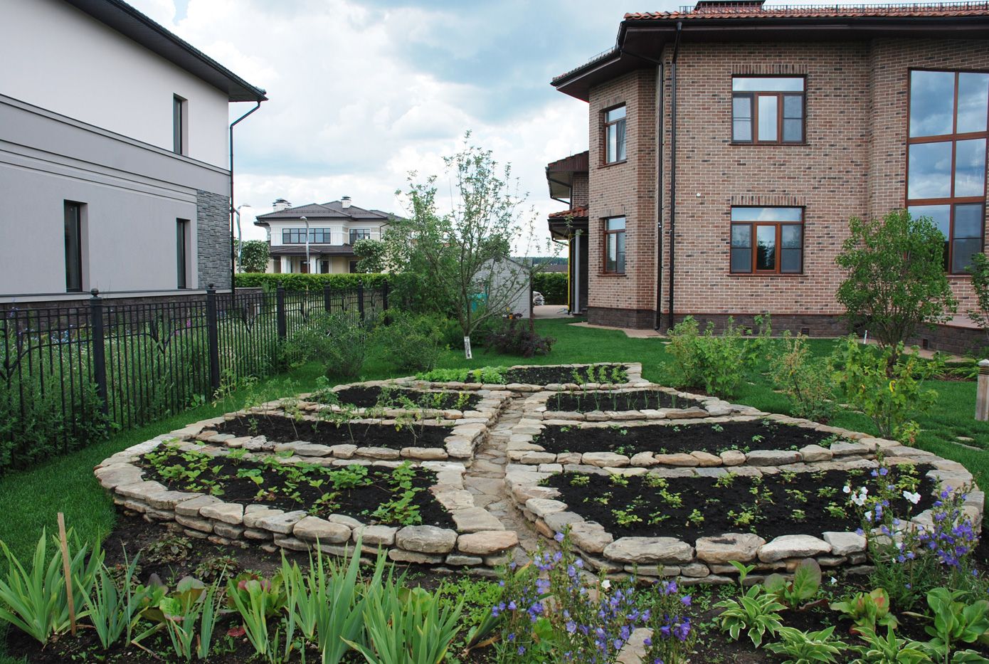 Декоративный огород в форме листа окружают посадки плодовых кустарников. В зоне парковки расположена стена из клинкера, предназначенная для игры в мяч, напротив — баскетбольное кольцо.