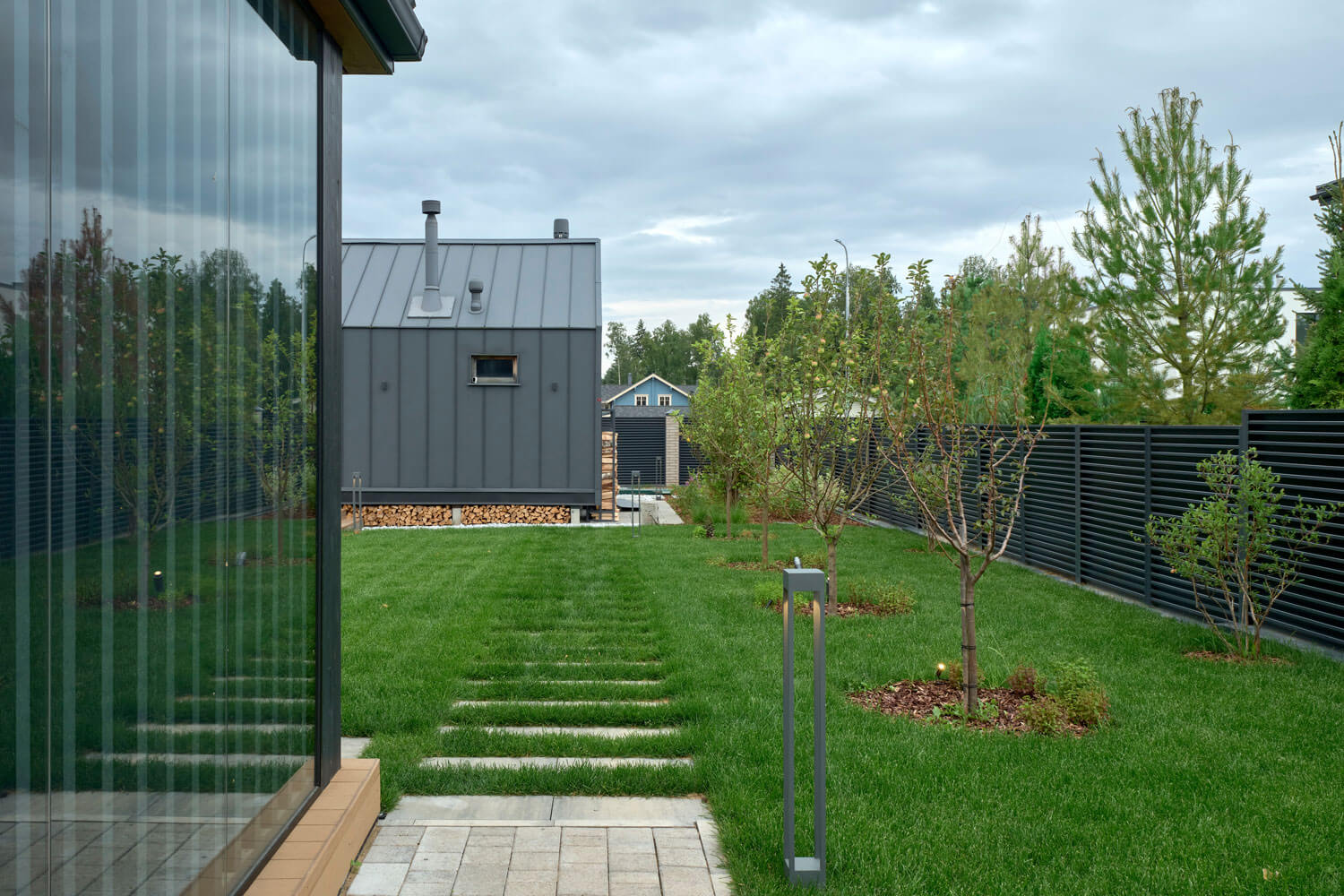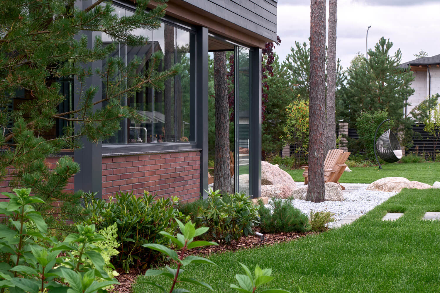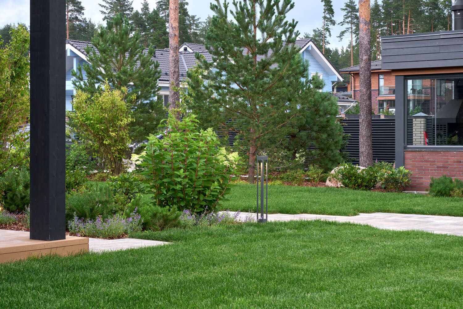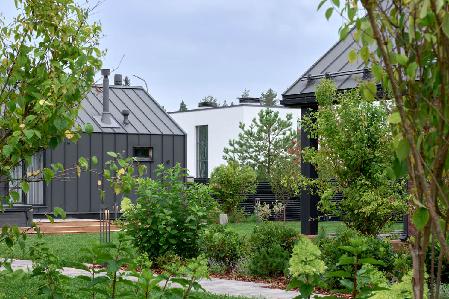 Для проекта мы выбрали скандинавский стиль, немного видоизменив идею: оставили основные компоненты скандинавского направления, но сделали участок с открытой планировкой. Пожеланием заказчиков было открытое и солнечное пространство – максимум газона и минимум плитки. Расположение построек и входов задали направление дорожек, но визуально образовывали перекрестие, которое слишком чопорно читалось бы, для сглаживания этой точки применили несколько приемов: рваный край мощения помог уйти от прямолинейности, миксбордер у дома визуально закрыл узел соединения пошаговой дорожки с основной, а плавная форма лужайки закрепила этот эффект.