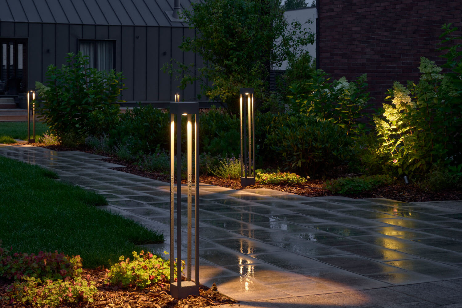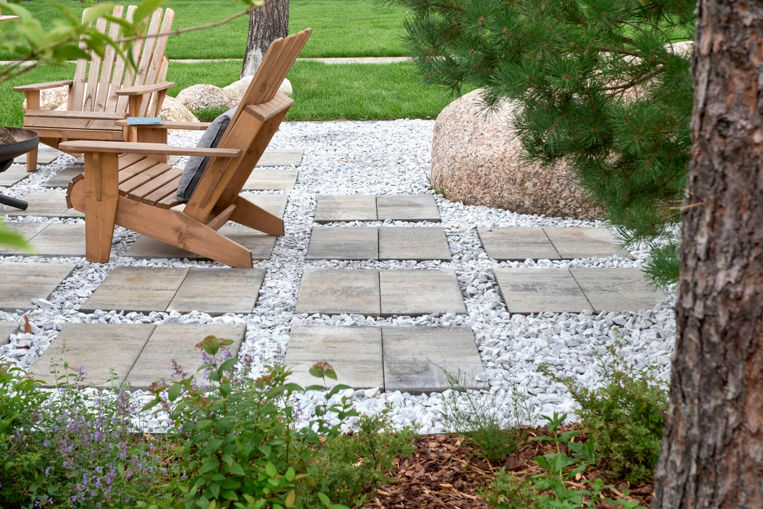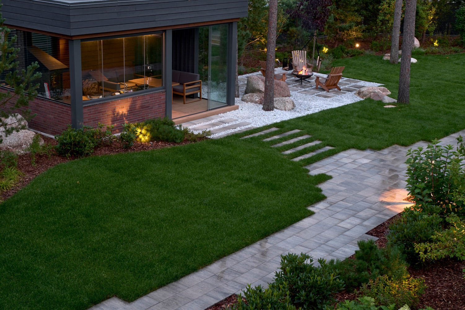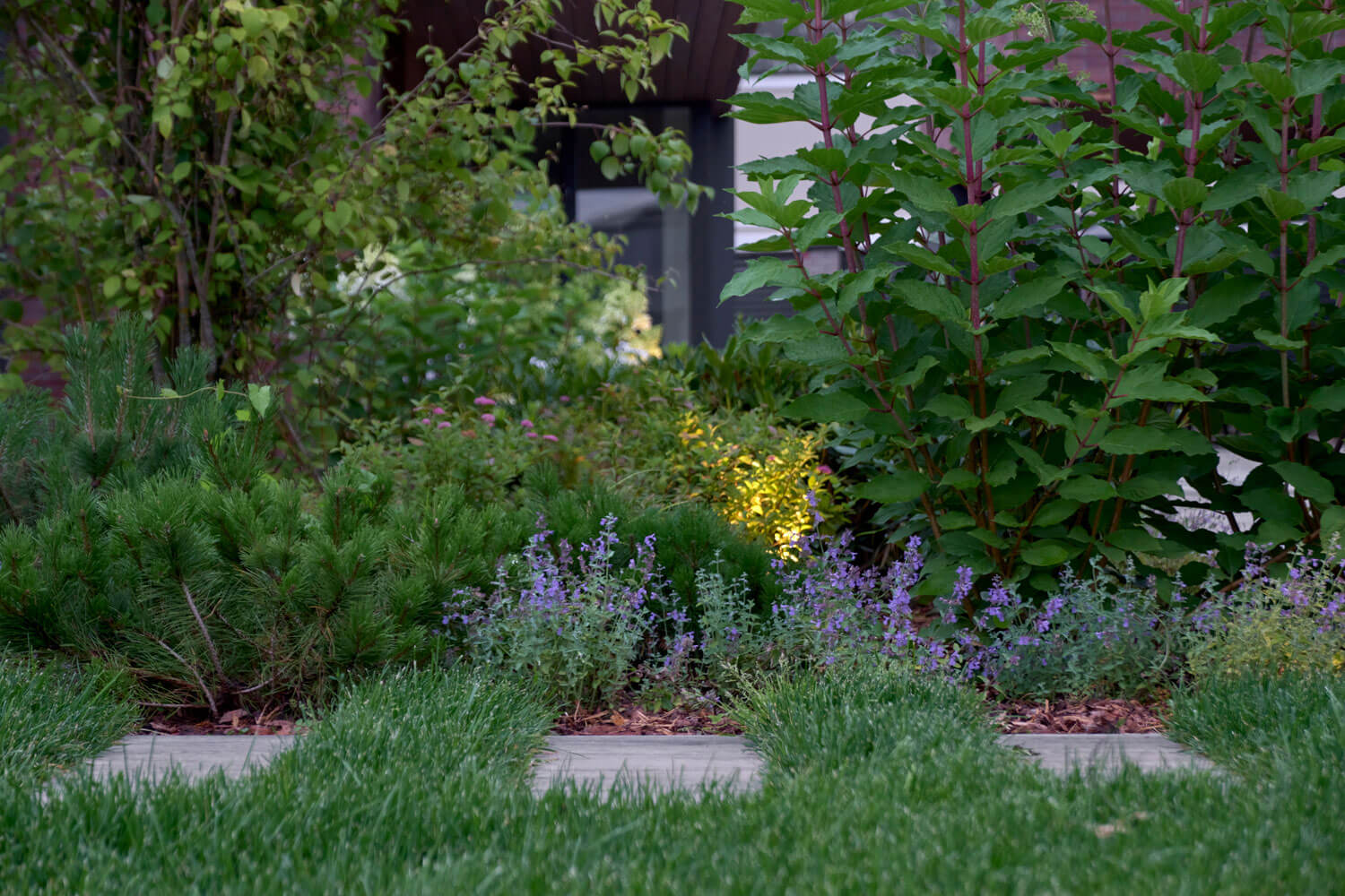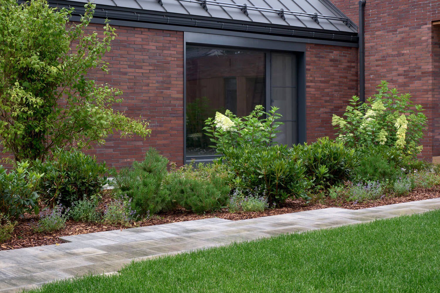 Для проекта мы выбрали скандинавский стиль, немного видоизменив идею: оставили основные компоненты скандинавского направления, но сделали участок с открытой планировкой. Пожеланием заказчиков было открытое и солнечное пространство – максимум газона и минимум плитки. Расположение построек и входов задали направление дорожек, но визуально образовывали перекрестие, которое слишком чопорно читалось бы, для сглаживания этой точки применили несколько приемов: рваный край мощения помог уйти от прямолинейности, миксбордер у дома визуально закрыл узел соединения пошаговой дорожки с основной, а плавная форма лужайки закрепила этот эффект.