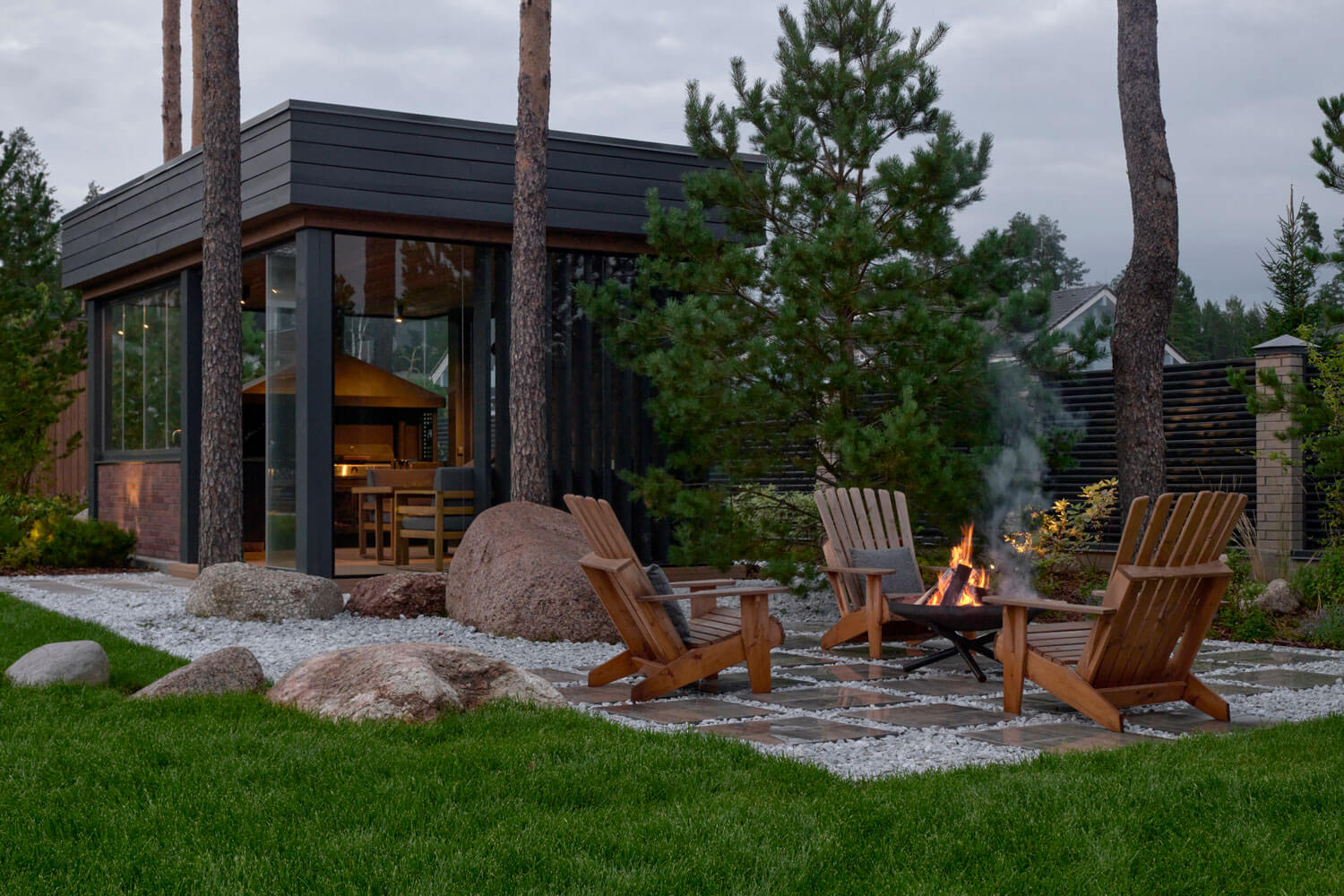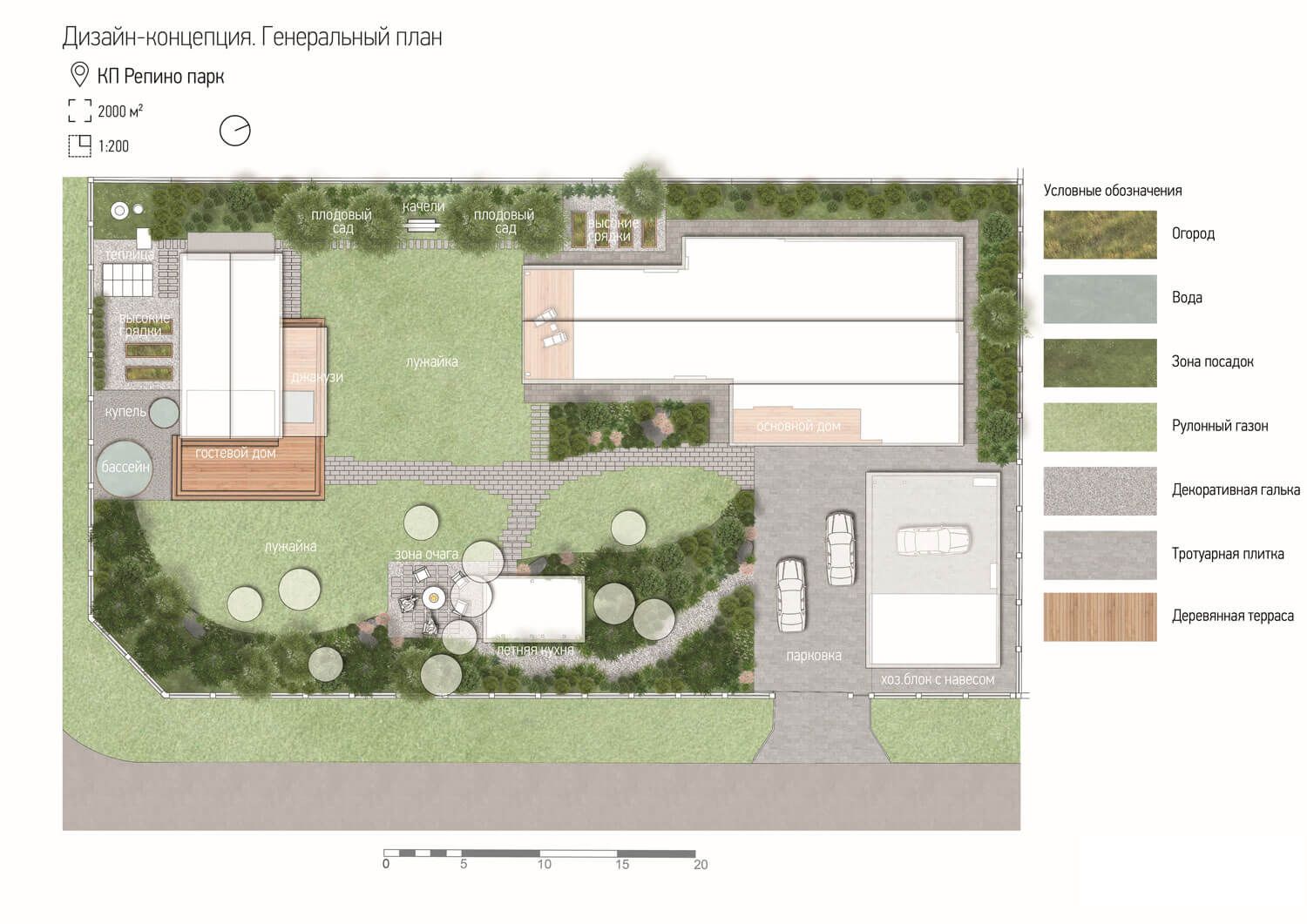 Сад расположен на севере Ленинградской области в коттеджном поселке Репино парк. Когда мы знакомились с территорией, основной и гостевой дома, навес с хозблокоми летняя кухня уже были расположены на участке – они задали нашу исходную точку и стиль проекта. Нашей задачей было объединить размещенные на участке строения в единое целое посредством оформления ландшафта.