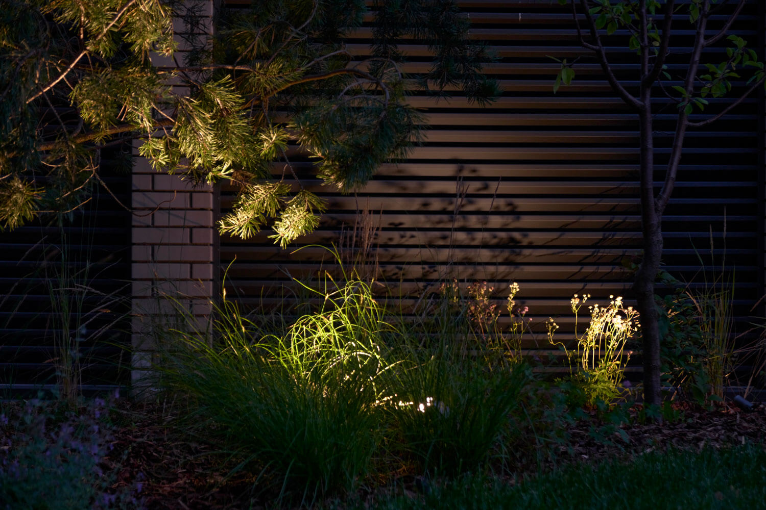 Важным пожеланием была возможность прогулки между посадок, таким образом образовалась «лесная» тропа, расположенная вдоль юго-восточной стороны участка. Тропа начинает свой маршрут от зоны парковки – сквозь черничник петляет дорожка из мраморной крошки, приводя нас к лобному месту, а оттуда продолжается среди посадок. Мы высадили 6-ти метровые сосны вдоль забора, закрыв участок от дороги, на передний план выдвинули высокие кустарники, это создало достаточную ярусность для прогулки.