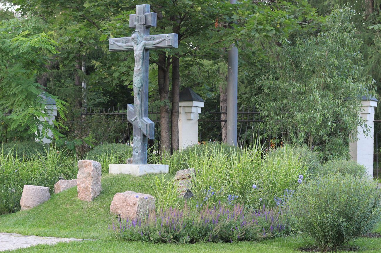 В открытой части парка, в партерах, расположены строгие ковровые посадки, бордюры из барбариса, вензели из кизильника блестящего, розарий. Стриженые формы из бересклета европейского и боярышника однопестичного аккуратно вписаны в кулисную посадку, расположенную вдоль Нарышкинской аллеи. Нежность, сдержанность, скромность — основная тема парка. Ничто не нарушает целостность впечатления, а центр притяжения здесь — храм. В проекте сведены до минимума яркие цвета. Укромная беседка за алтарем — элемент классического регулярного парка. К ней нет дорожки, и это сделано специально для уединенных бесед священников с прихожанами. Лабиринт, расположенный на детской площадке, выступает как декоративный элемент и как аттракцион для детей. Рядом находится большая беседка для посетителей, нависающая над водоемом с рыбками. Вода поступает в водоем через водяную мельницу по деревянному желобу, создавая мягкое журчание. Цветник «новой волны» отделяет детскую площадку от зоны водоема в целях безопасности.