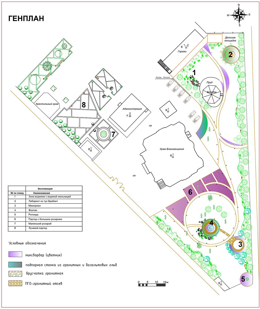 После осмотра территории возникло композиционное решение сада, основанное на кругах: амфитеатр-фонтан, круглая беседка, круглый лабиринт из туи западной «Брабант», вензели в партере. Для реализации идеи был выбран английский стиль, где естественность посадок переплетается с регулярностью классики.