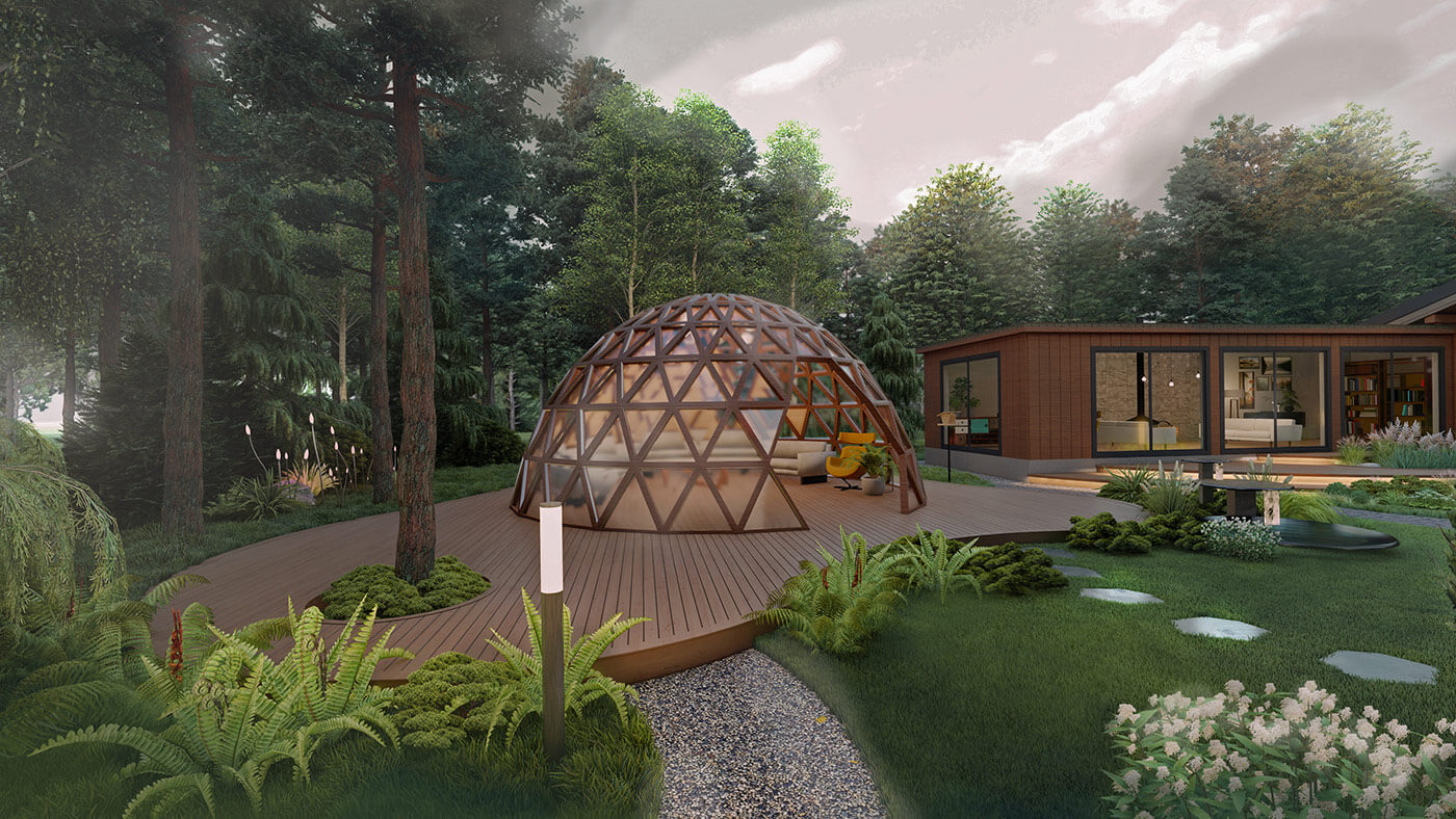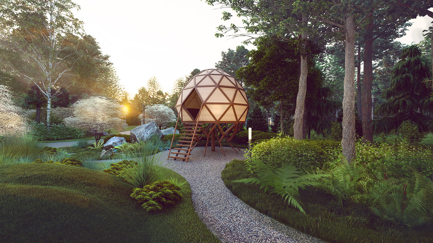Беседка сферической формы выполнена из стекла и дерева (каркас), что позволяет наблюдать за звездным небом в любое время года. Невесомый «домик-улей» дополняют функциональную концепцию проекта, создавая уединенное место слияния с природой, тишиной, место для медитации.
