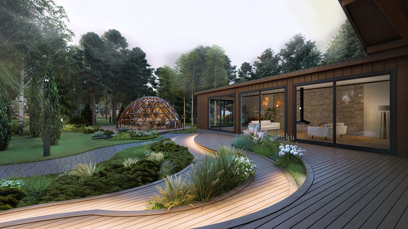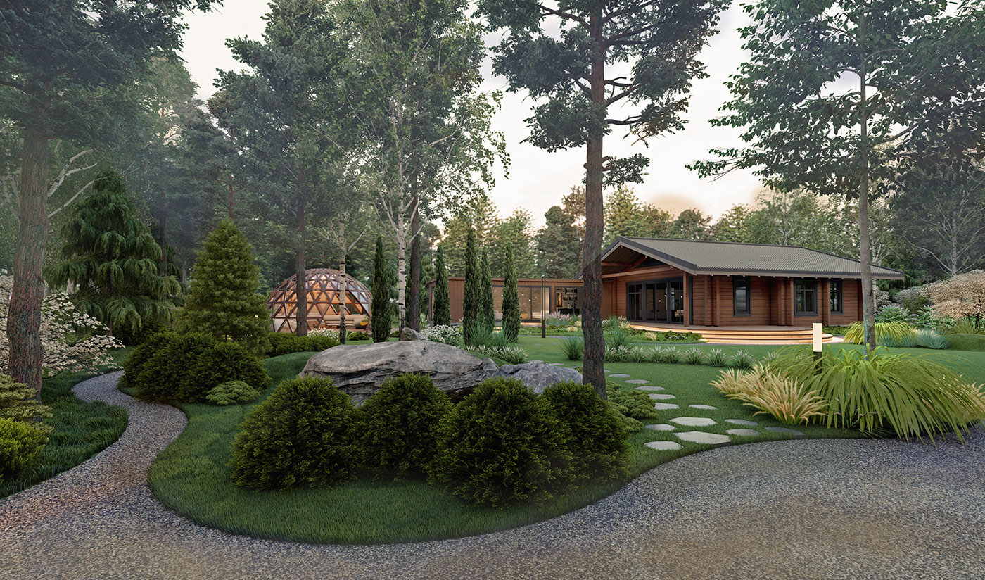 Парковка и маршрут к дому — из шунгита. Дорожки в лесной части служат променадом, они выполнены из мраморной крошки фракцией 10–20 мм, границы постепенно растворяются в природе, подражая лесным тропам.