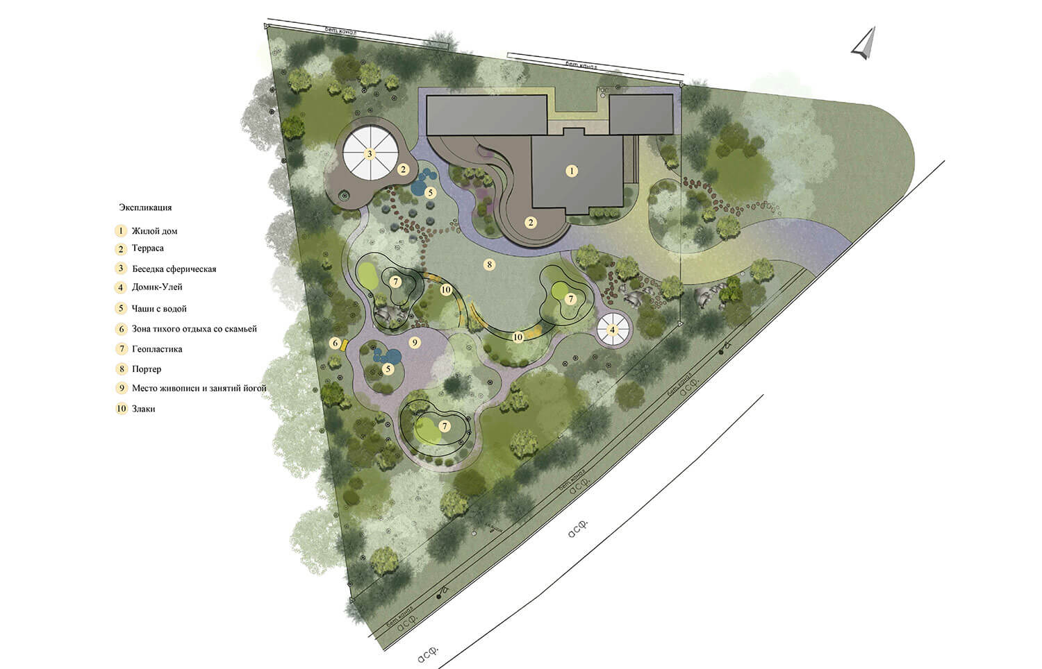 По всему участку расположены звуковые колонки, которые передают природные, лесные звуки. Посадки плодовых растений привлекут на участок птиц.
