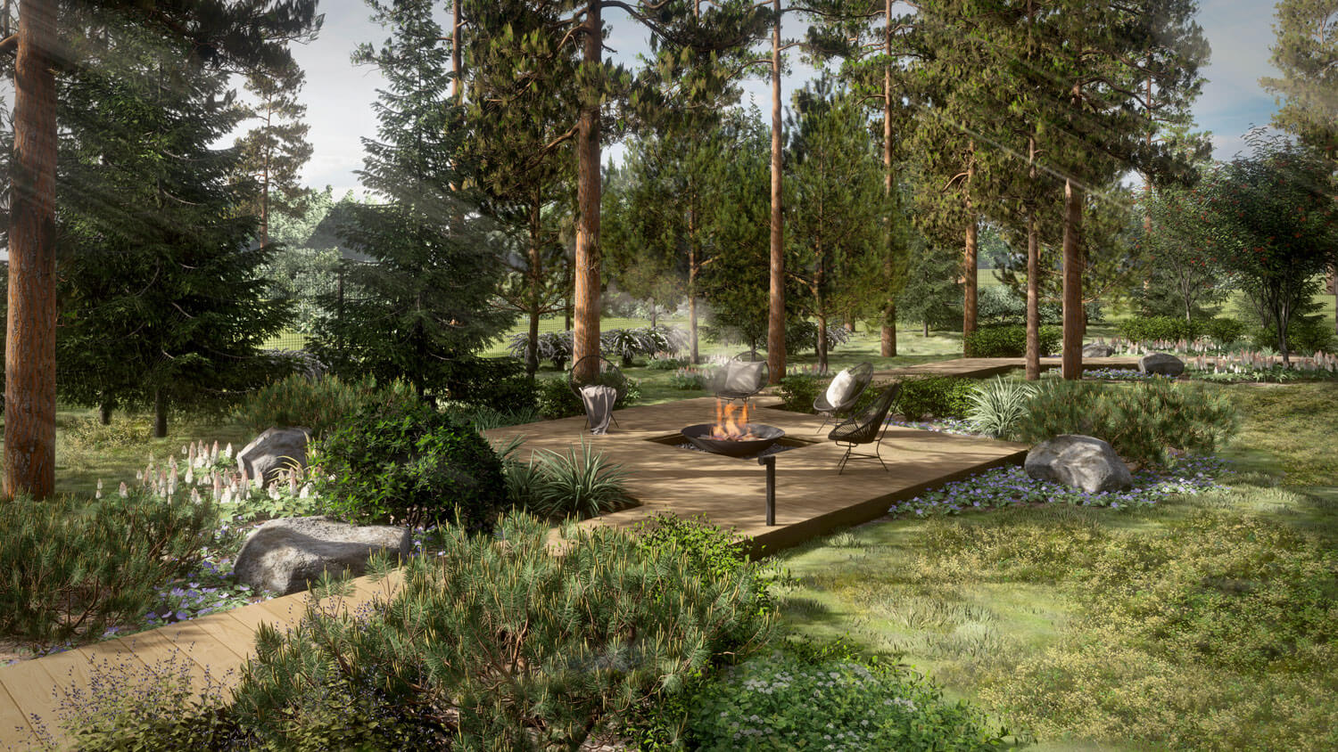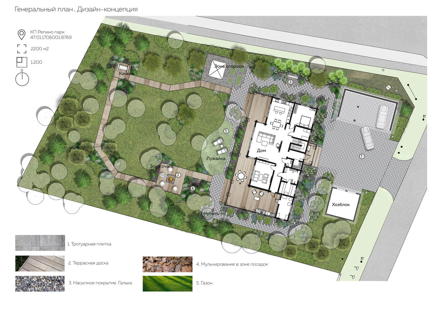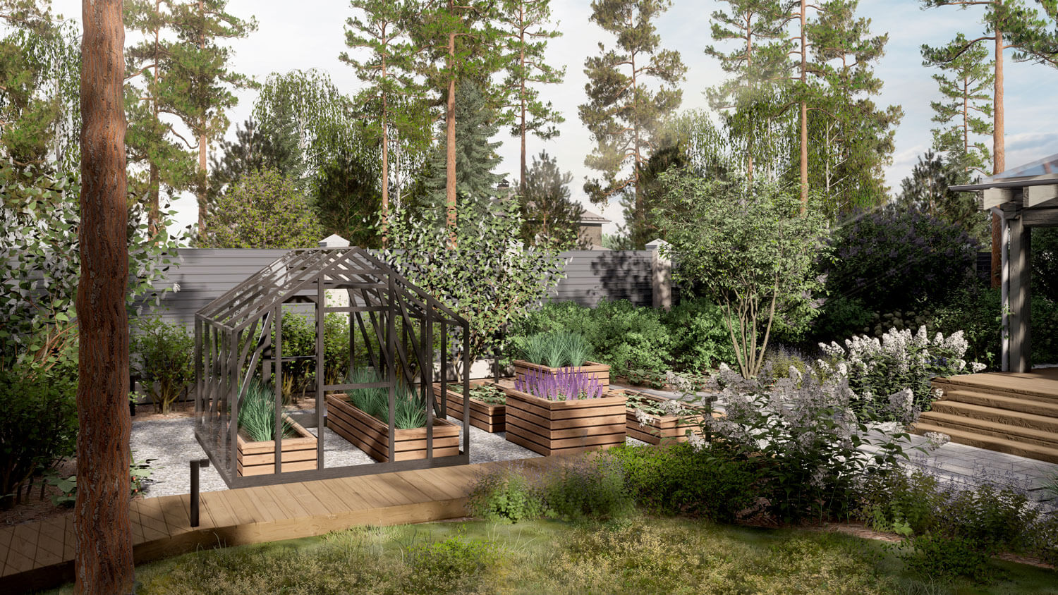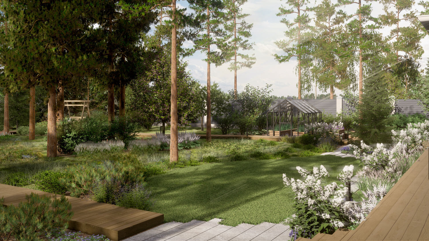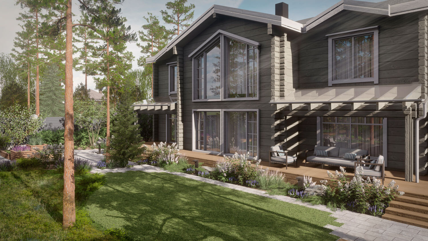 Сад расположен на севере Ленинградской области в коттеджном поселке Репино парк. На территории уже был расположен дом из клееного бруса в классическом стиле, а большую часть участка занимал существующий лес. Нашей задачей было максимально сохранить существующие насаждения и естественный лесной покров, лаконично дополнив их. Из гостиной с панорамными окнами, где любит собираться вся семья, открывается вид на лесную зону участка, поэтому одной из главных задач было подчеркнуть эту видовую точку. При проектировании и был выбран скандинавский стиль, с акцентом на существующий лесной массив.