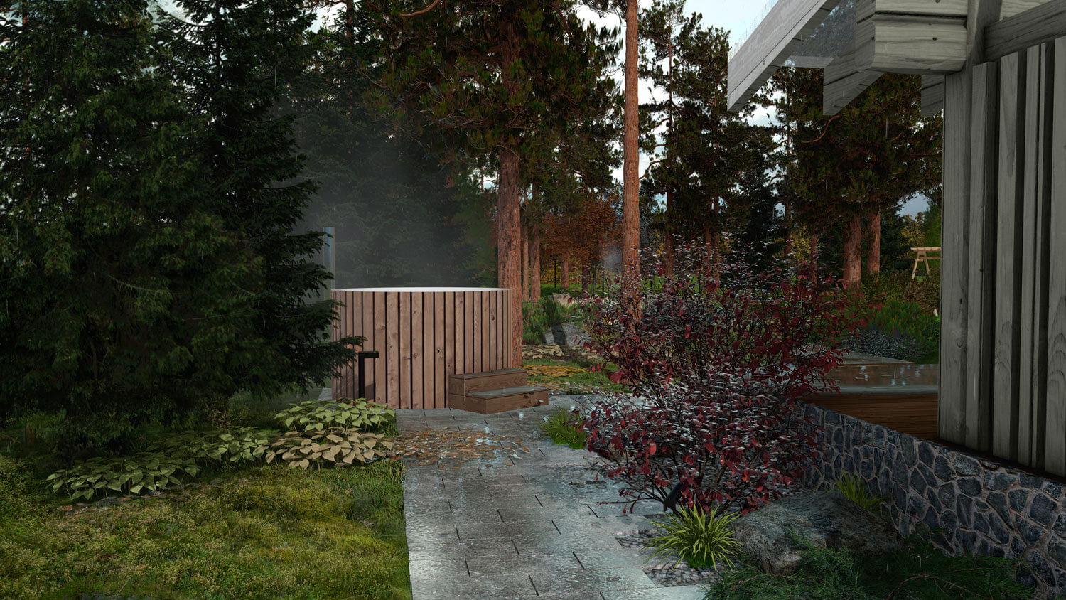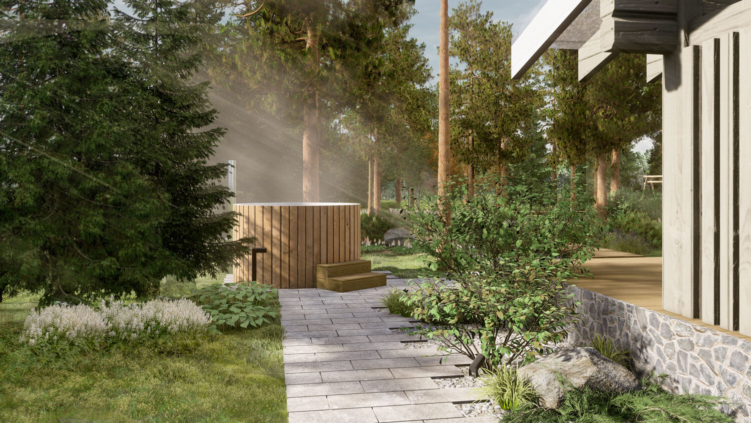 Дорожка по южной стороне дома ведет нас к купели Фурако и террасе дома, которая является переходной точкой к лесной зоне. Террасу аккуратно обрамляет цветник в пастельных тонах, где солируют гортензии, перед ним раскинулась небольшая солнечная лужайка для активного отдыха.