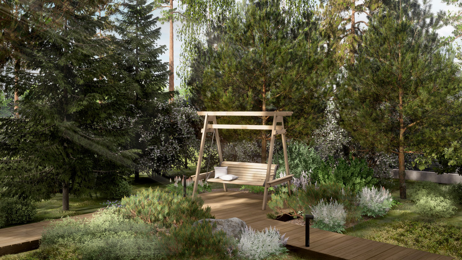 В лесной зоне проложили прогулочный маршрут, выполненный из деревянного настила, с двумя точками для отдыха. Использование настила на сваях позволило минимизировать вмешательство в существующий покров, который мы дополнили массивами брусники. Ближе к дому расположили зону отдыха у костра, очаг разместили в нише, утопленной в настил. Эта зона стала точкой притяжения для вечернего отдыха в кругу семьи и друзей. В глубь участка отнесена вторая точка прогулочного маршрута, образуя приватную зону для тихого отдыха на качелях, где приятно спрятаться в тени сосен и елей в знойный летний день.