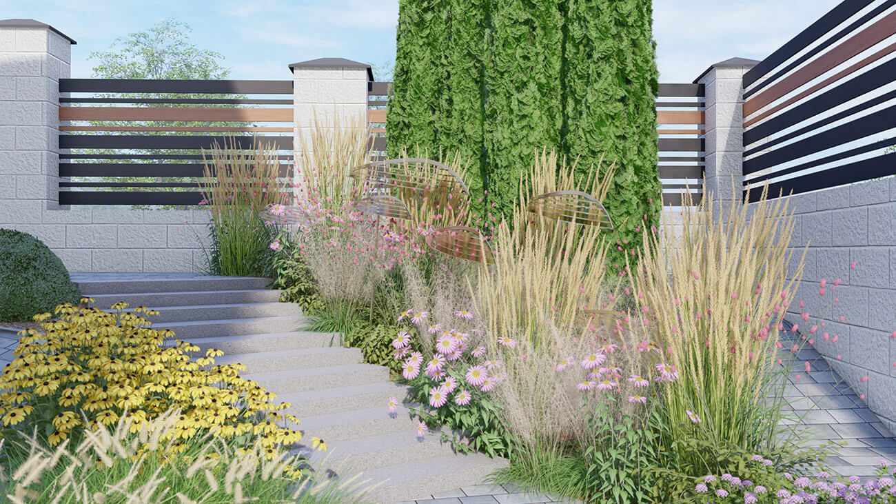 Идея мозаики и ветра чувствуется уже в верхней, парадной части территории: это формы крон деревьев, линии посадок растений с малыми архитектурными формами в виде стай рыб, несущихся к дому, а затем, в волне из злаков вдоль лестницы, к приватной, нижней части сада: откуда им совсем недалеко до полноводной реки.