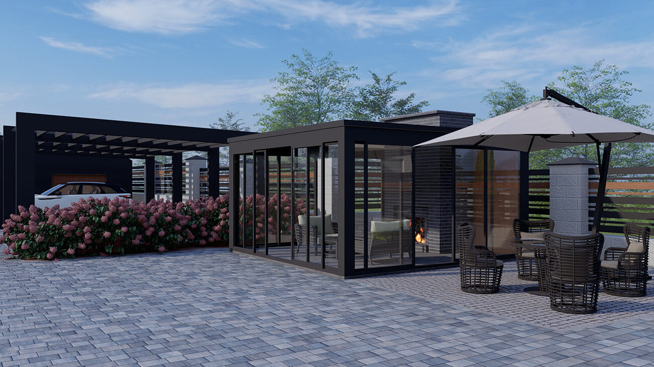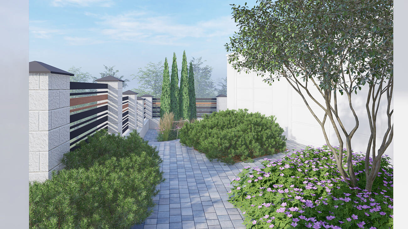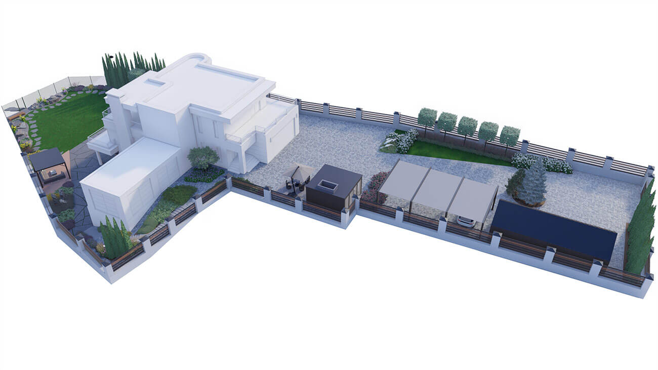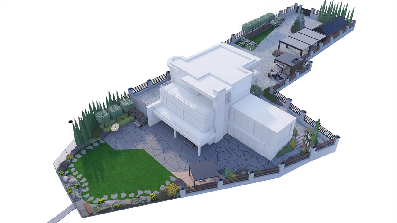 Верхняя часть достаточно функциональна: это и комплекс хозяйственного помещения для автотехники малых размеров, садовой техники, а также навеса для трех автомобилей: ведь основной гараж, на 2 машины, находится в доме. Беседка, патио и пара грядок — будет местом притяжения для приема гостей. Напротив — зона для молодежных посиделок. Два входа в дом: крыльцо и вход в зимний сад находятся среди растений, и являются отличным местом для транзитного наслаждения садом.