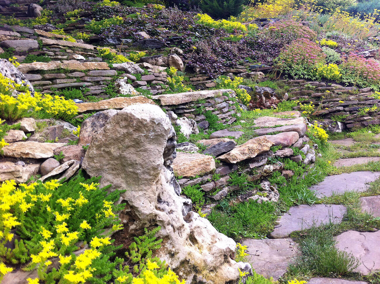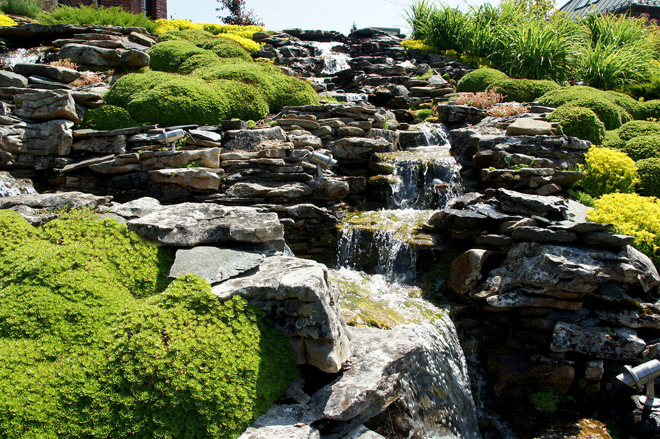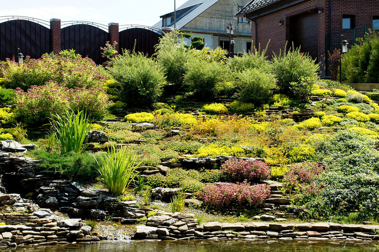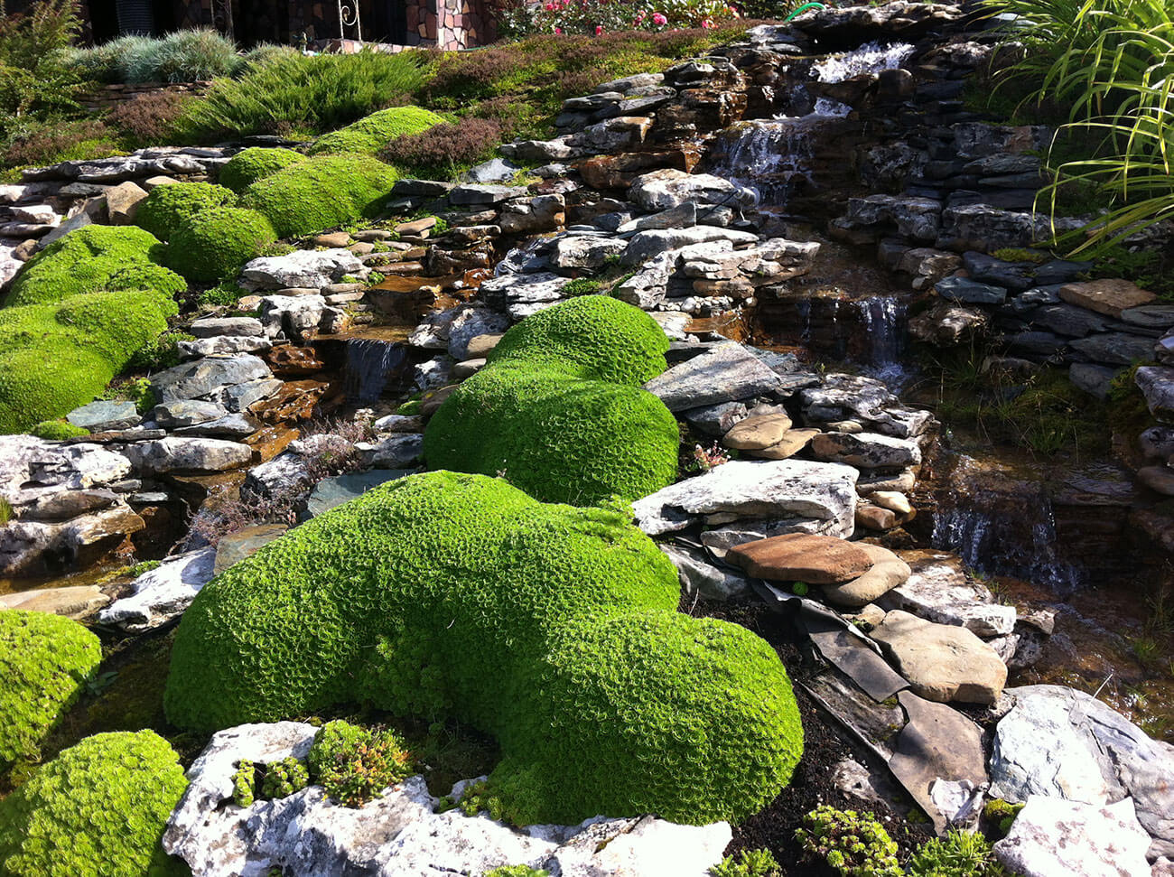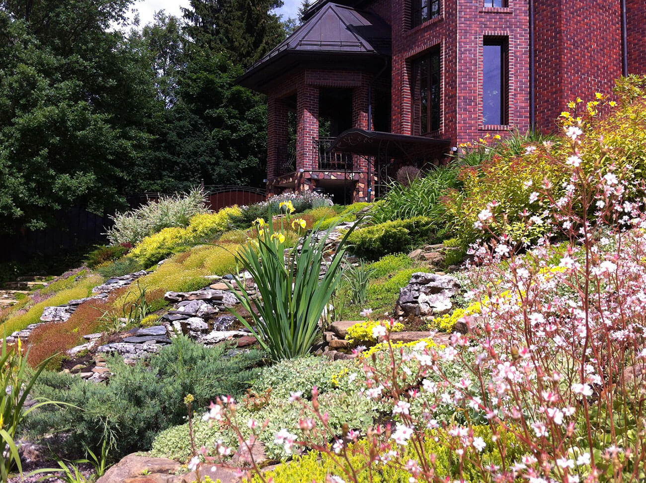 Почвопокровные очитки, флоксы разрастаются, придавая знакомому участку совершенно новый сказочный вид. В зависимости от того, какие растения начинают цвести, склон окрашивается в разные яркие цвета, а журчание воды создает ощущение того, что вы находитесь в горной местности.