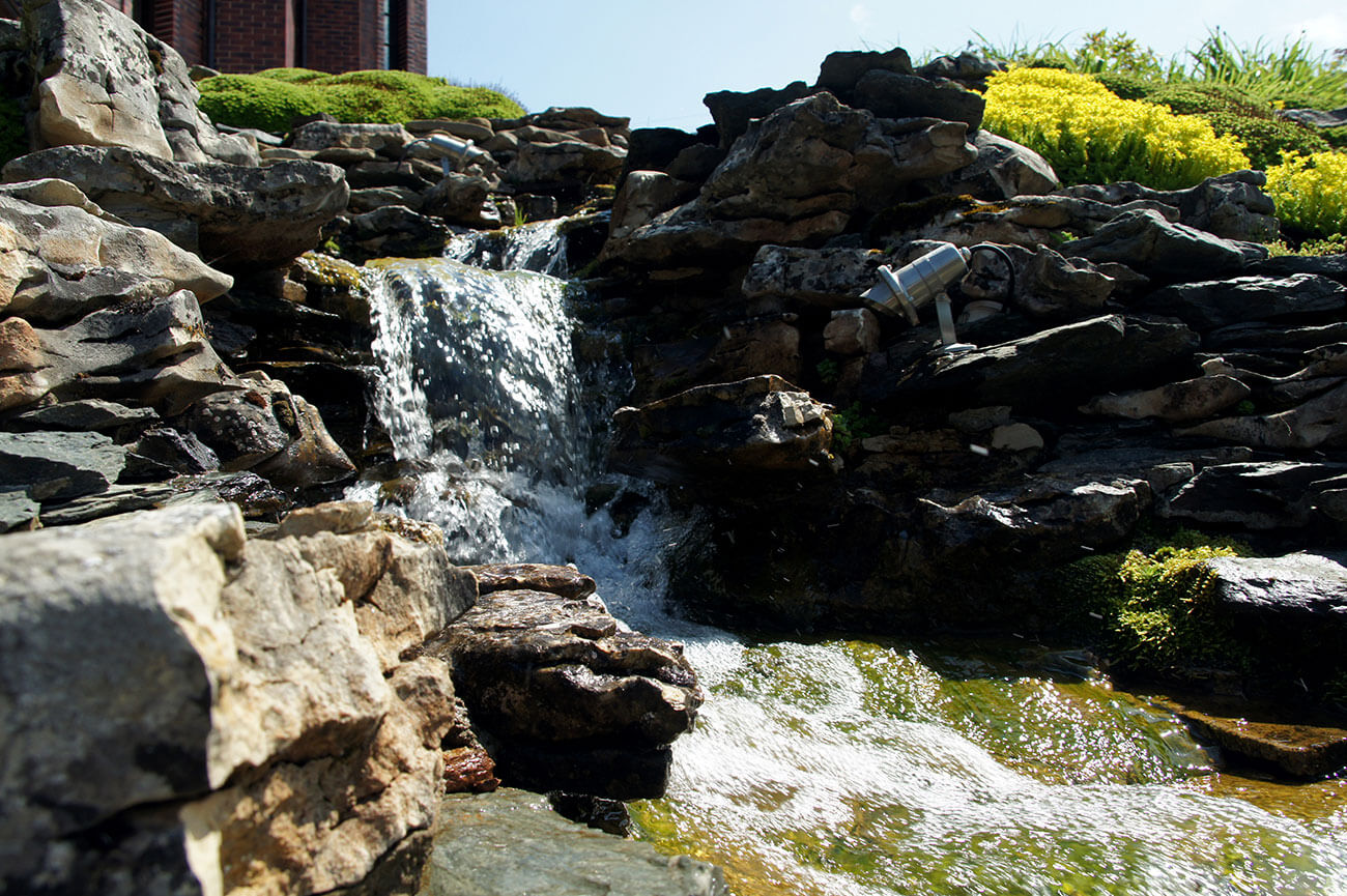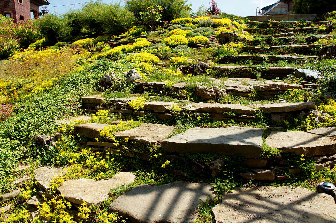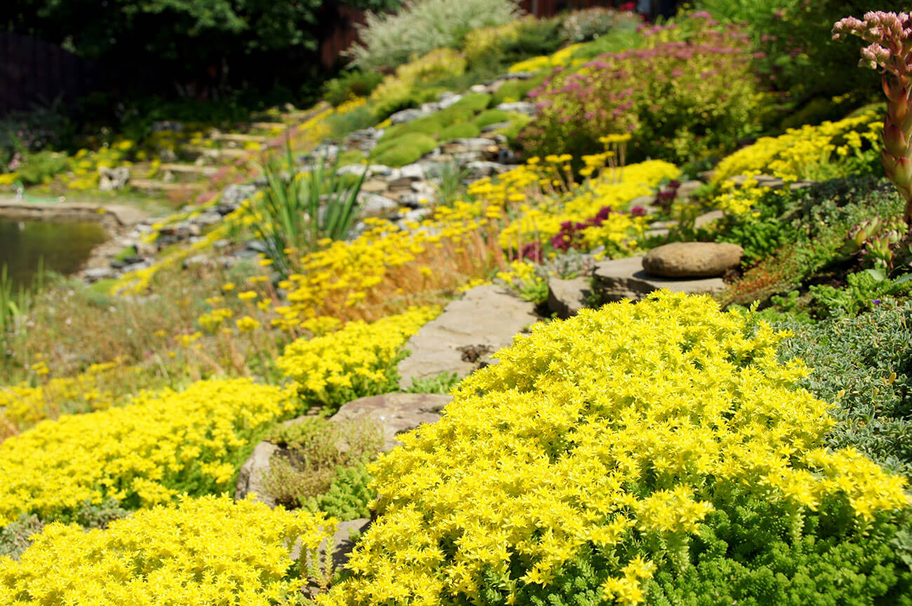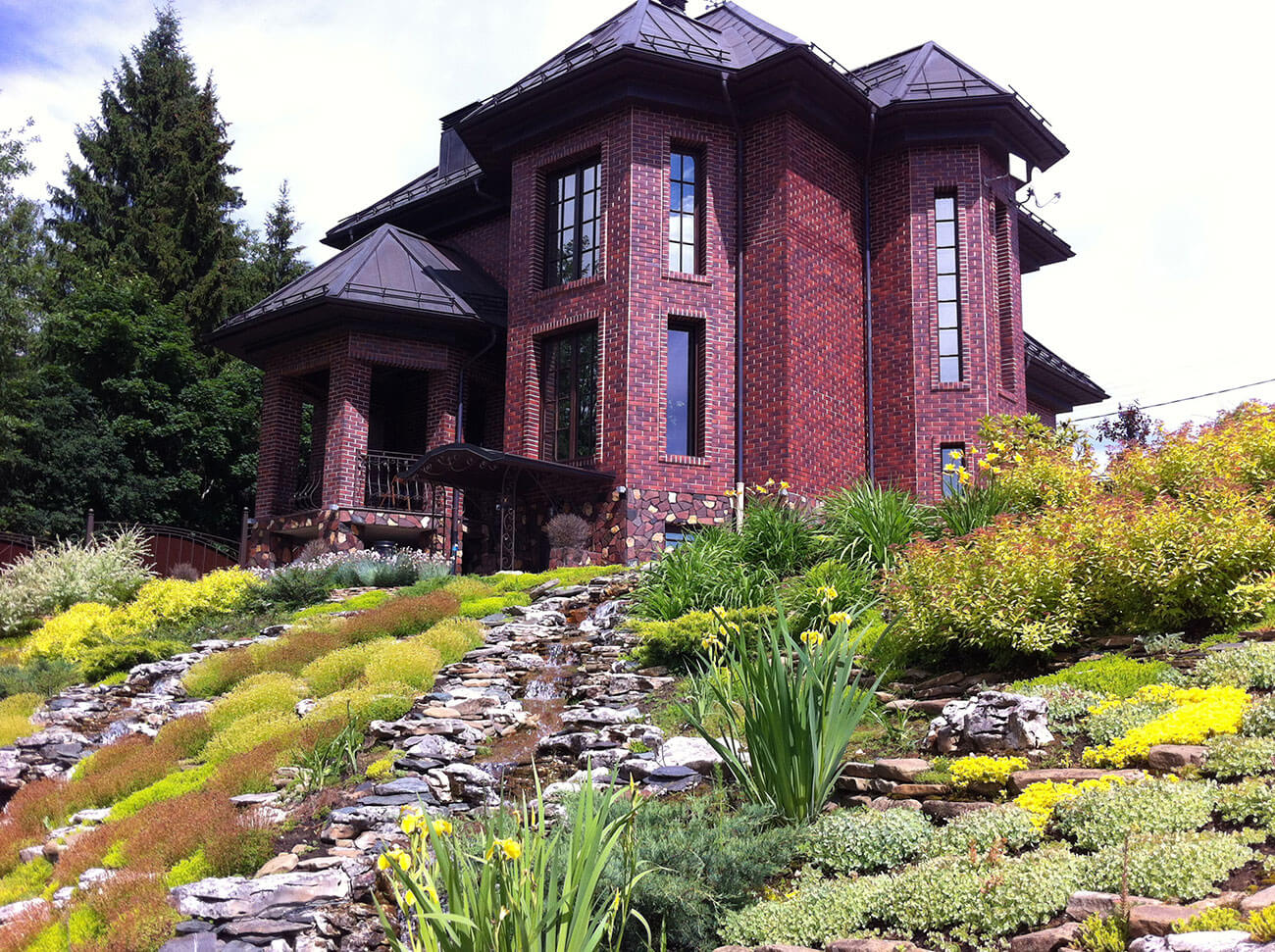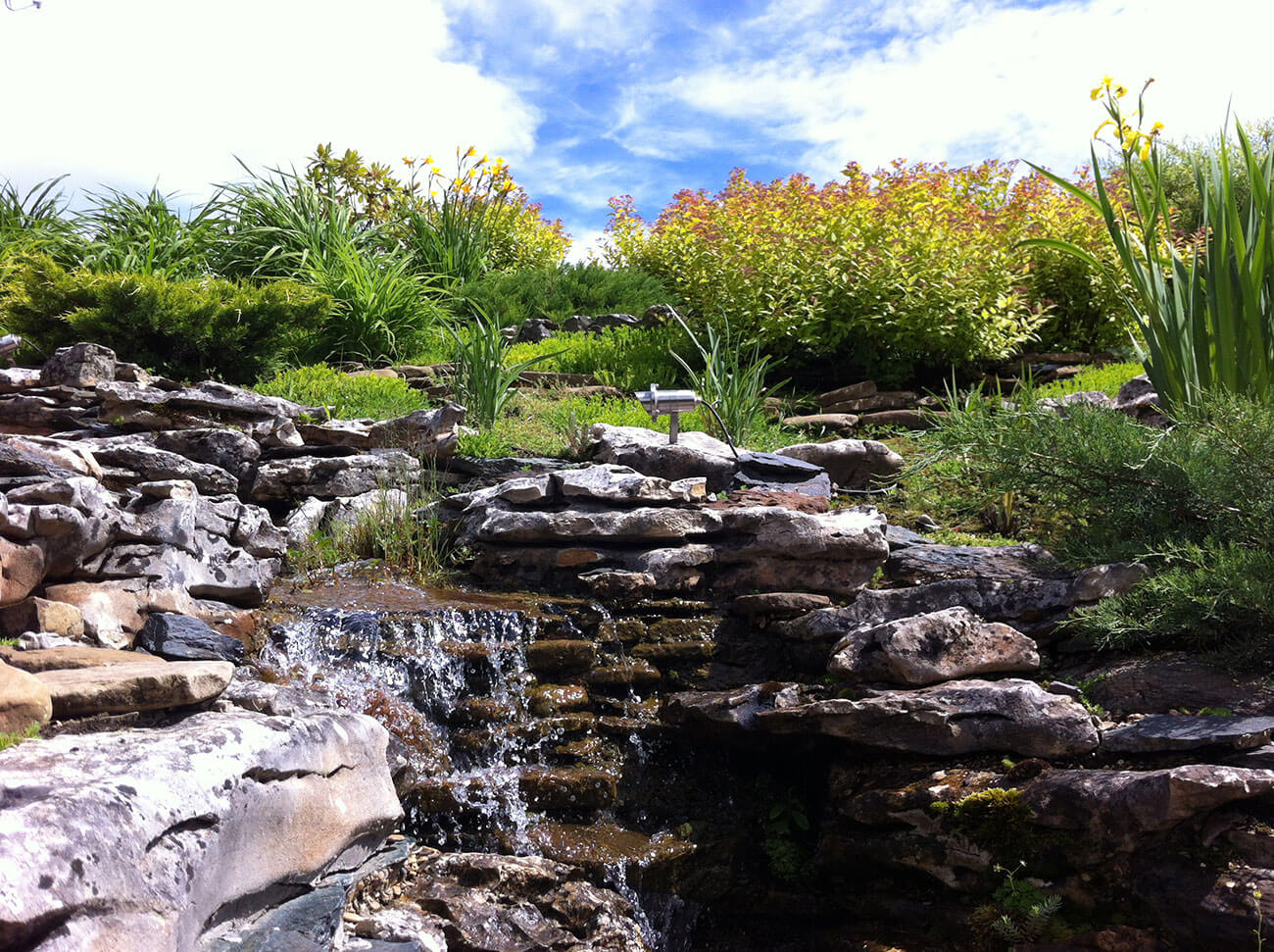 Почвопокровные очитки, флоксы разрастаются, придавая знакомому участку совершенно новый сказочный вид. В зависимости от того, какие растения начинают цвести, склон окрашивается в разные яркие цвета, а журчание воды создает ощущение того, что вы находитесь в горной местности.