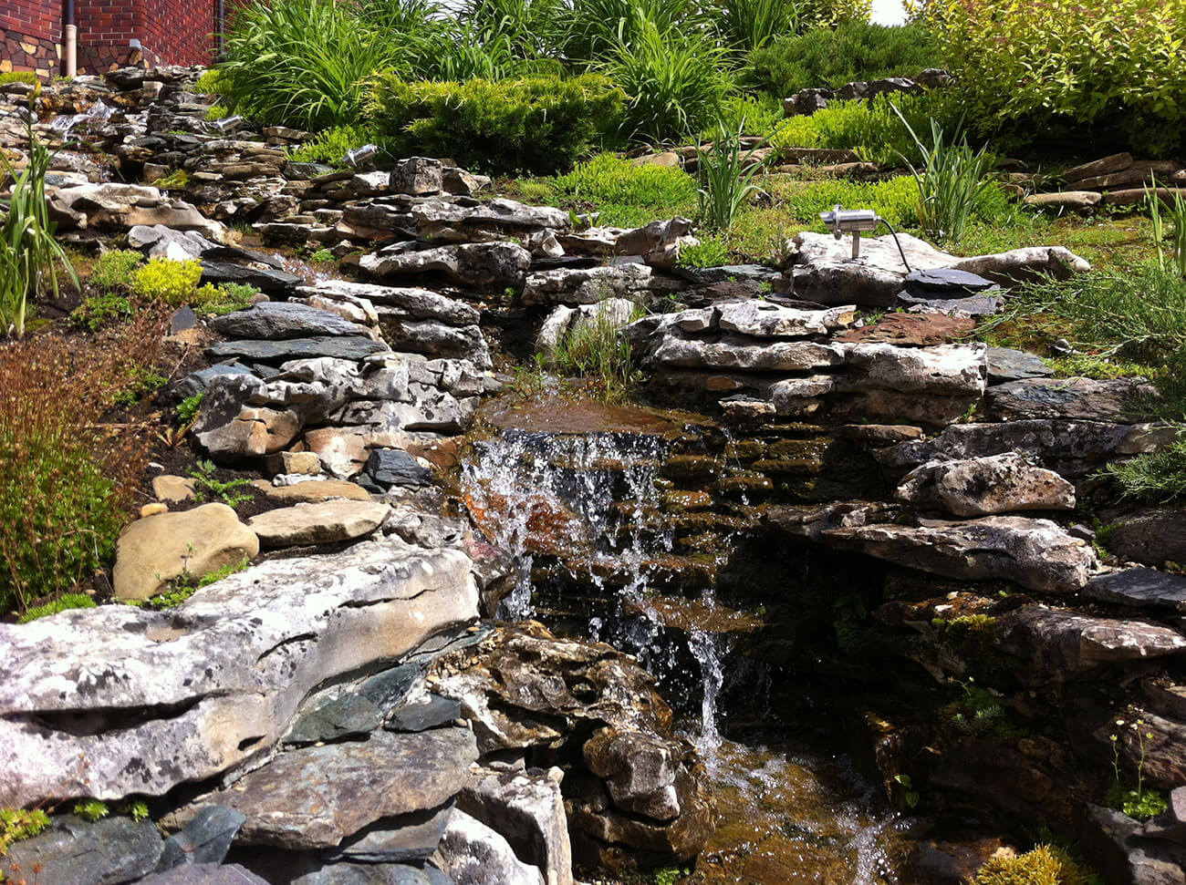 Для оптимизации пространства участок был разделен на два крупных сегмента и террасирован подпорной стеной. На нижнем ярусе устроили природный водоем (глубина 3 м) с террасами и удобной подводной лестницей. По склону над водоемом возвели комплекс каскадов для максимально эффектного вида и аэрации воды в водоеме. Для формирования склона использовали сочетания различных видов сланца, которые создали эффект естественности. Вставки из валунов «эльбрус» дополнили картину. Склон был засажен куртинами многолетних пряных и почвопокровных растений для удержания грунта и эффектного цветения в течении всего сезона.