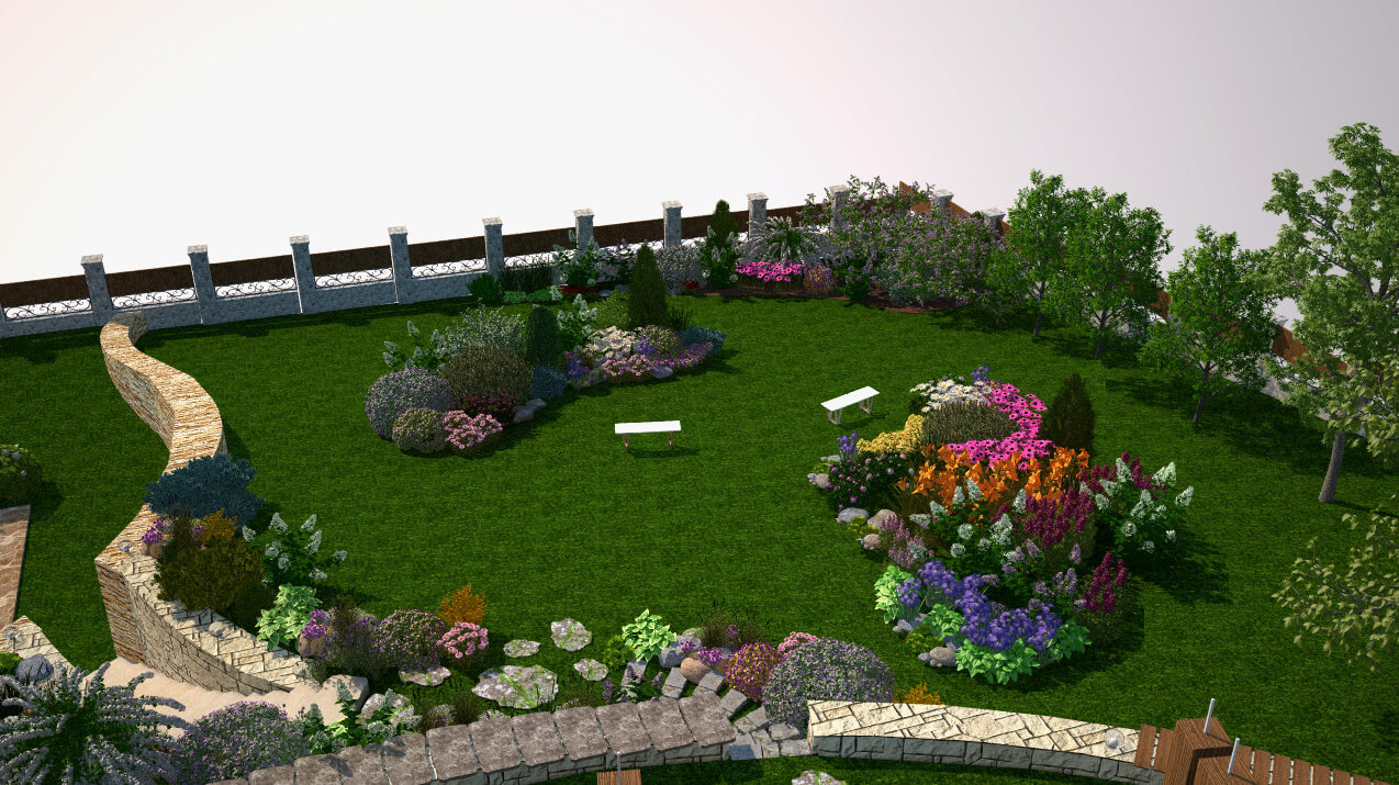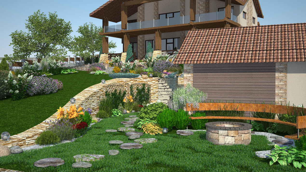 Сад на участке с естественным уклоном