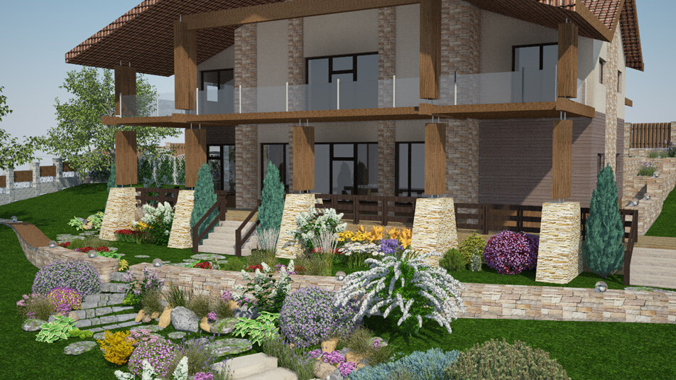 В конечном счете, когда проект обрел свой законченный вид, все в нем стало настолько гармонично и последовательно, что казалось, что так и было придумано изначально. Сочетание подпорных стенок и естественных уклонов, дорожек из камня, дерева, пошаговых элементов огромного количества декоративно-лиственных и цветущих растений — все это сделало проект одновременно и очень насыщенным и в то же время природным и естественным.