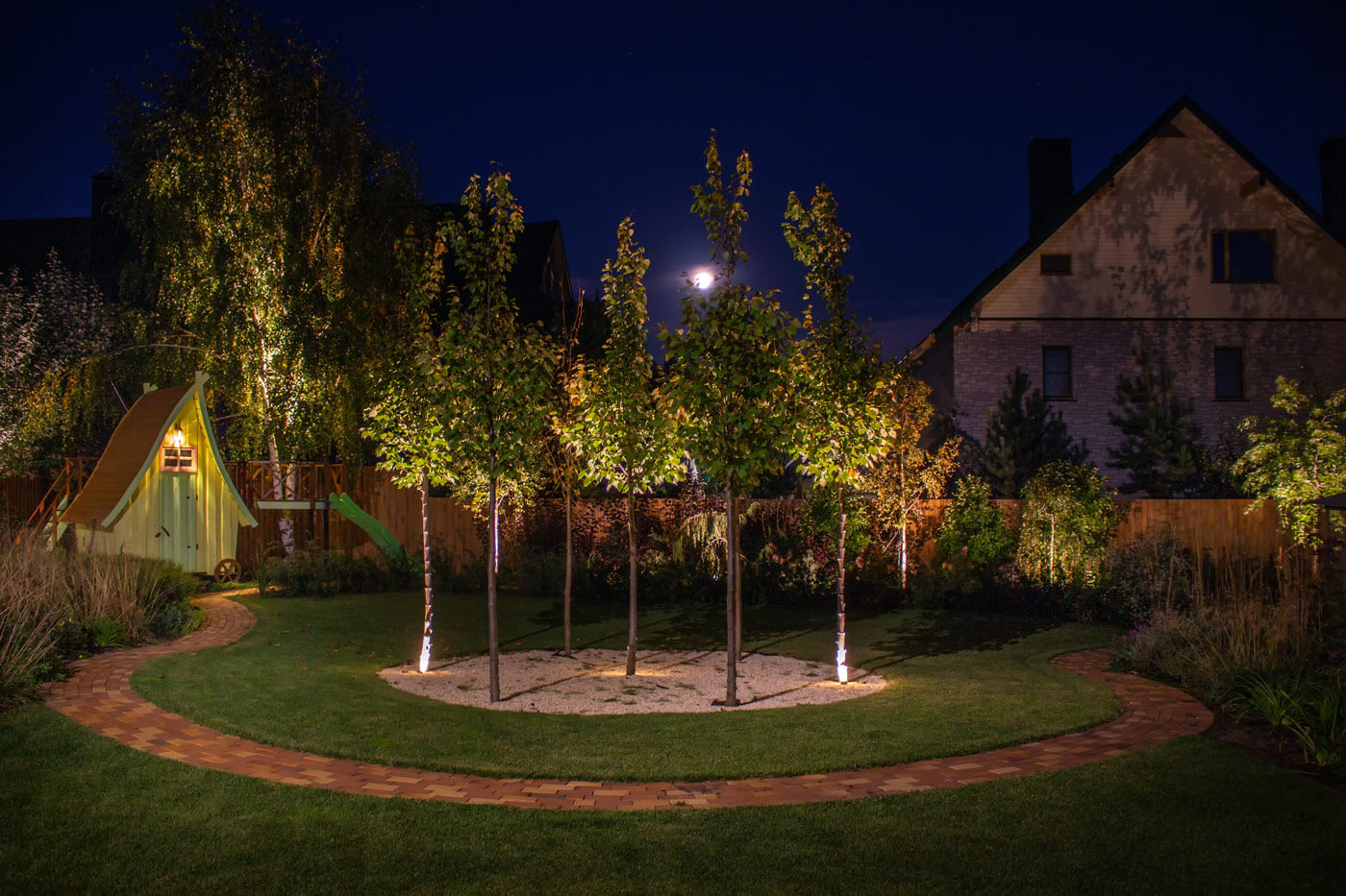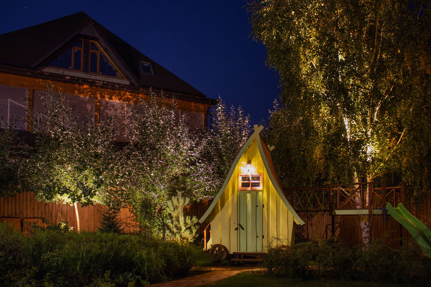В Саду расположен уютный детский домик, площадка и веревочный мостик. Прообразом для детской зоны служит сказочный домик Элли.