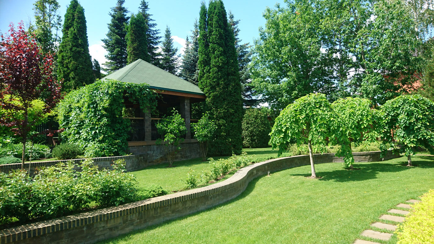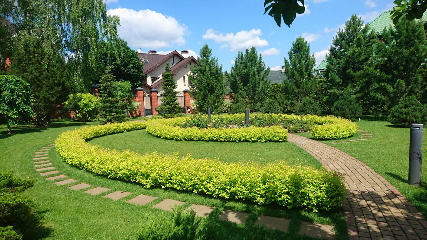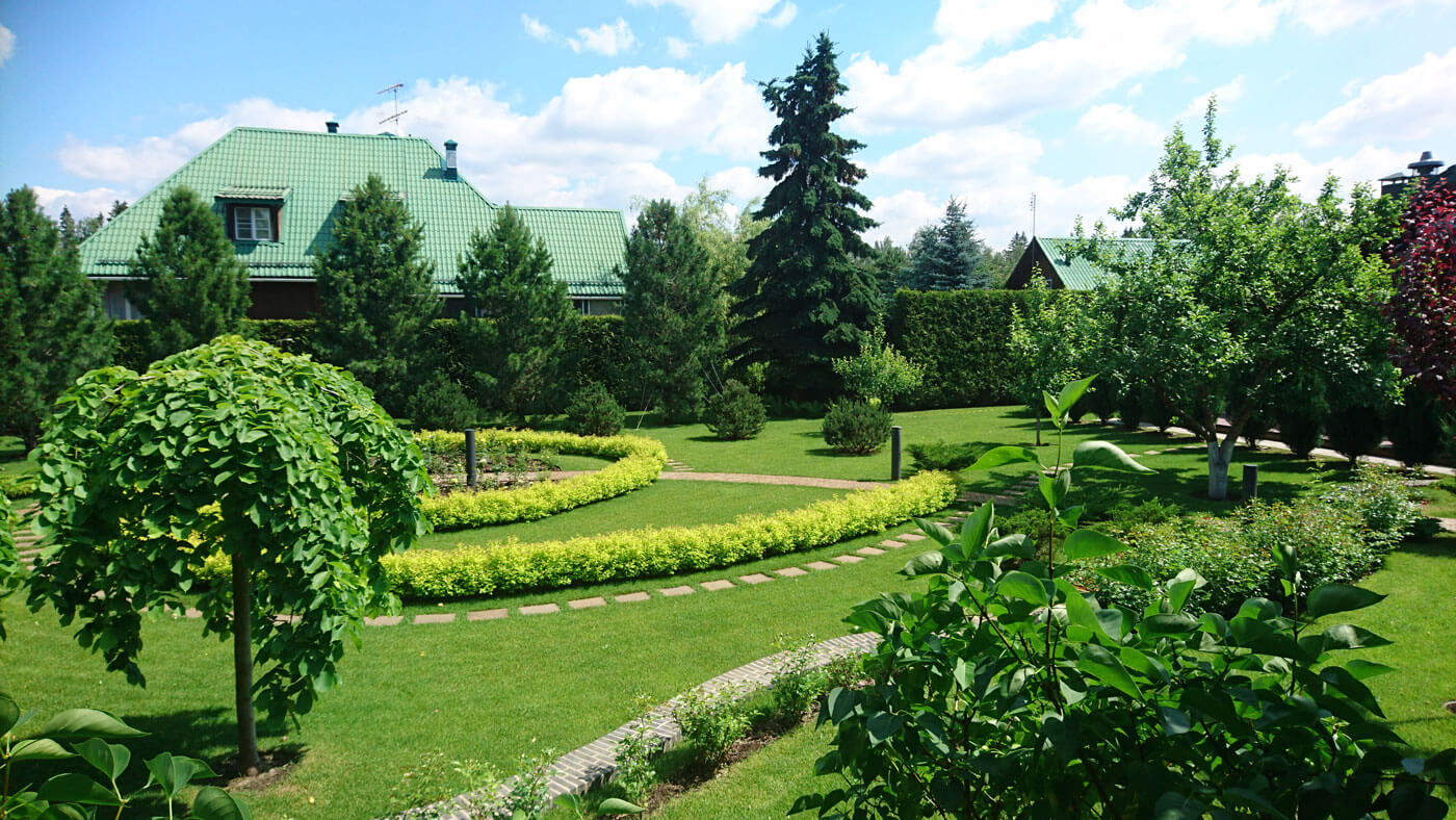 В основу проекта был положен тренд функционального использования территории. Хозяева и гости заходят в сад из боковой калитки и попадают в беседку. Открывающийся вид может вскружить голову. Внизу на поляне светится спираль из спиреи «Golden Princess» в центре её клумба «Солнце», которая сияет весной тюльпанами жёлтыми «Monte Сarlo», а летом желтыми розами группы флорибунда. В орбиту движения вписаны сосны горные, вязы «Пендула», пихты, сосны кедровые. Поляна лежит, как арена для действия, приглашая детей пробежаться по дорожке, а взрослых – прогуляться и полюбоваться растениями.