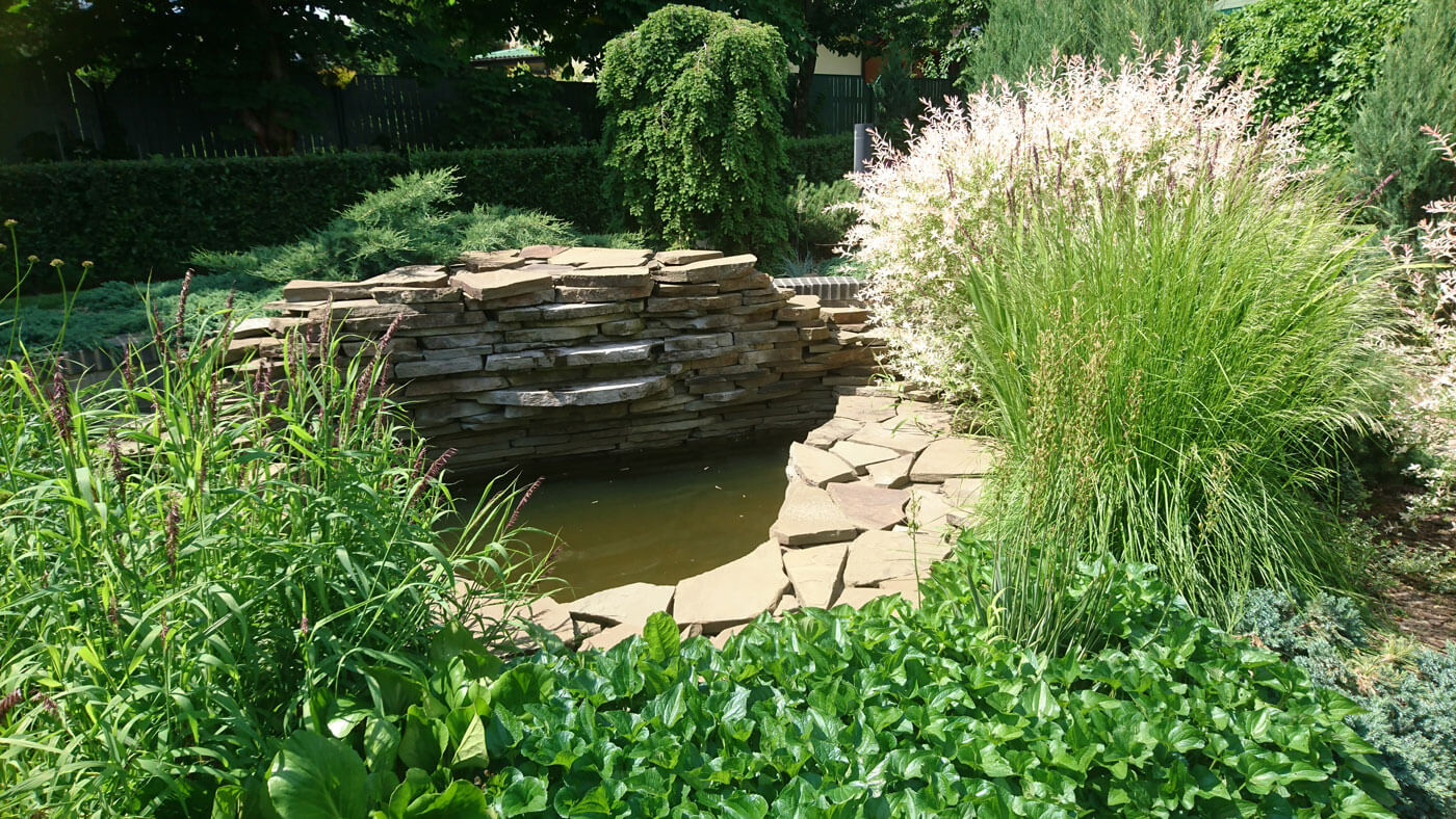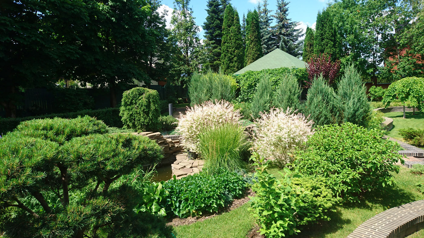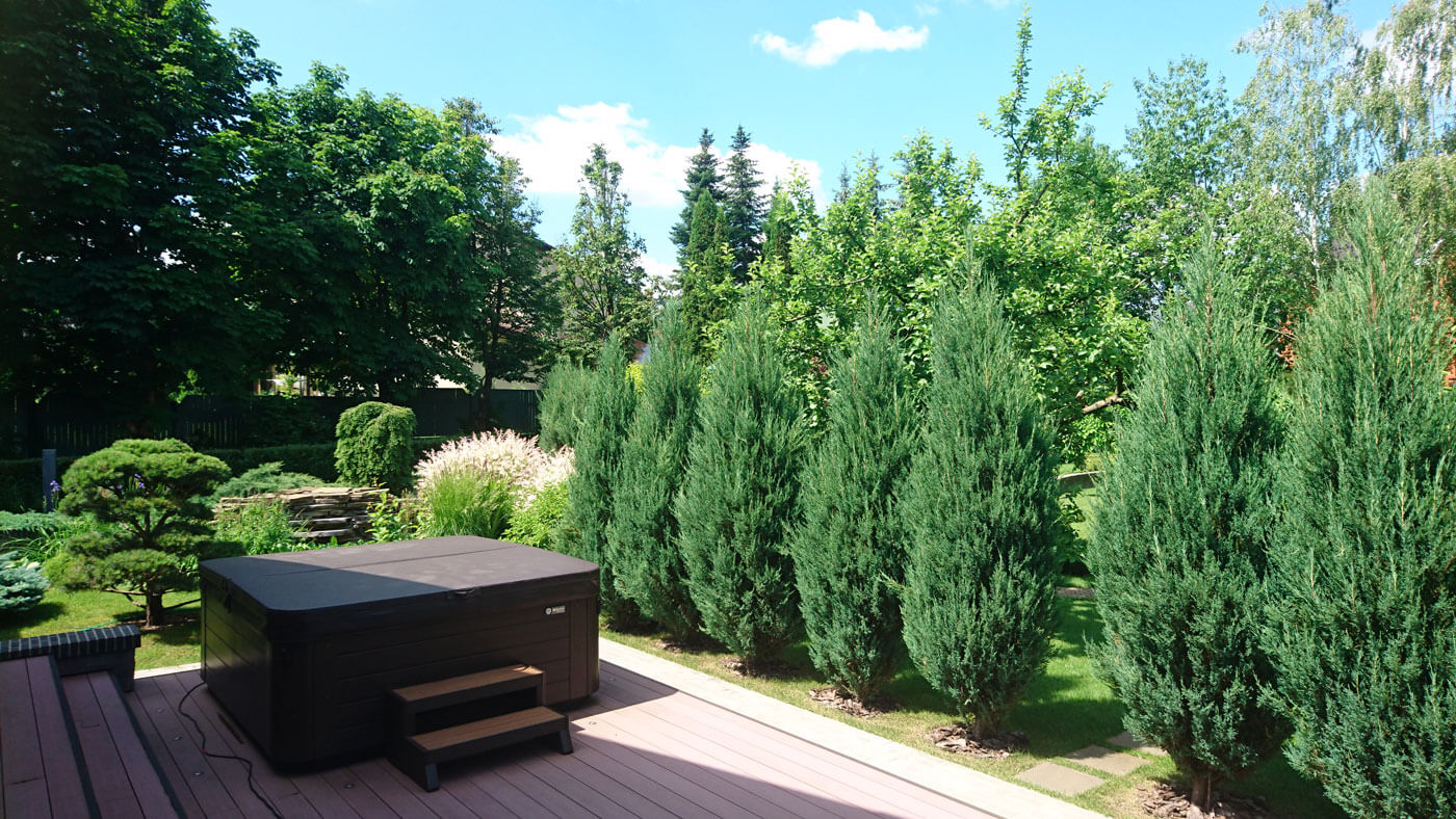 От беседки направо дорожка ведёт к бане – в интимную зону, закрытую можжевельником скальным «Blue Arrow». На террасе у бани размещена купель, где можно нежиться под журчание небольшого водопада, разглядывая живописные травы у водоёма, бонсай, яркое пятно ивы «Hakuro-NishiKi», и вдыхать фитонциды можжевельников. С каскадом воды перекликается стоящая над ним тсуга канадская «Пендула».