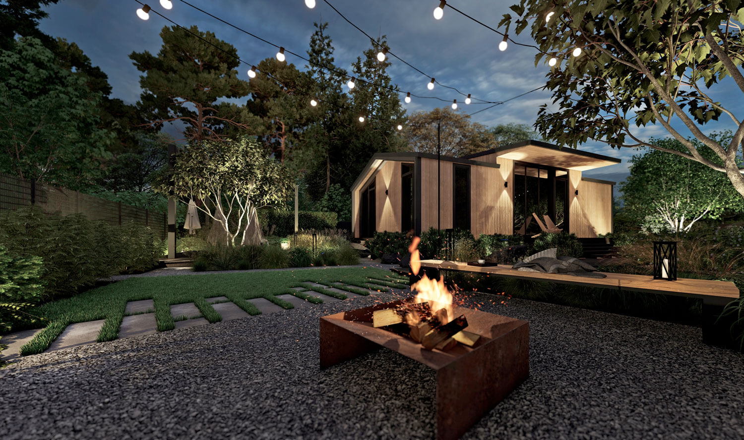 В проекте использованы камни и сосны как отсылка к природным лесам Карелии. Место отдыха у очага напоминает о лесах Сибири.