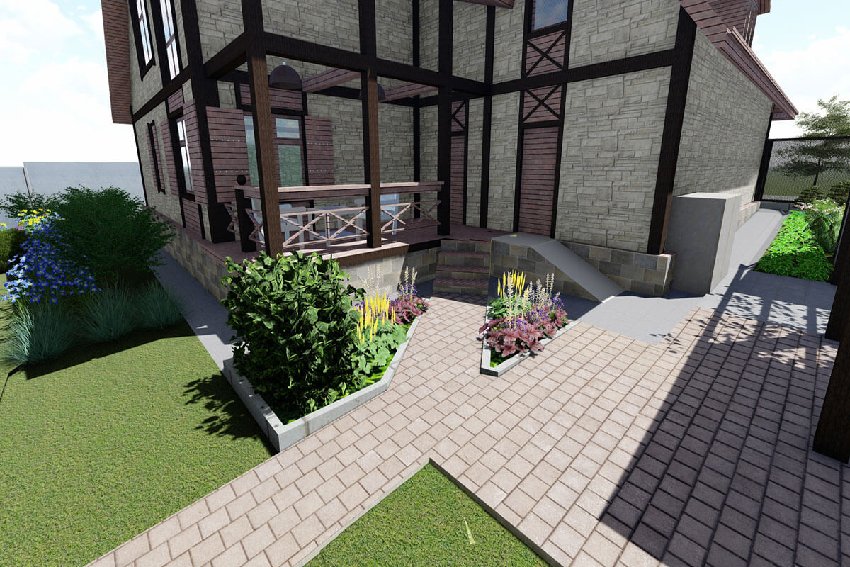Материал мощения — качественная бетонная плитка в серых тонах.