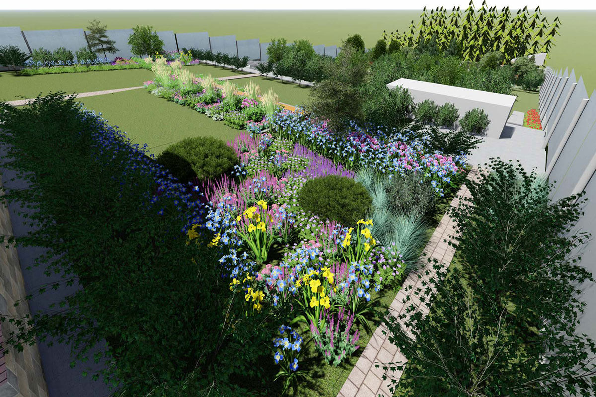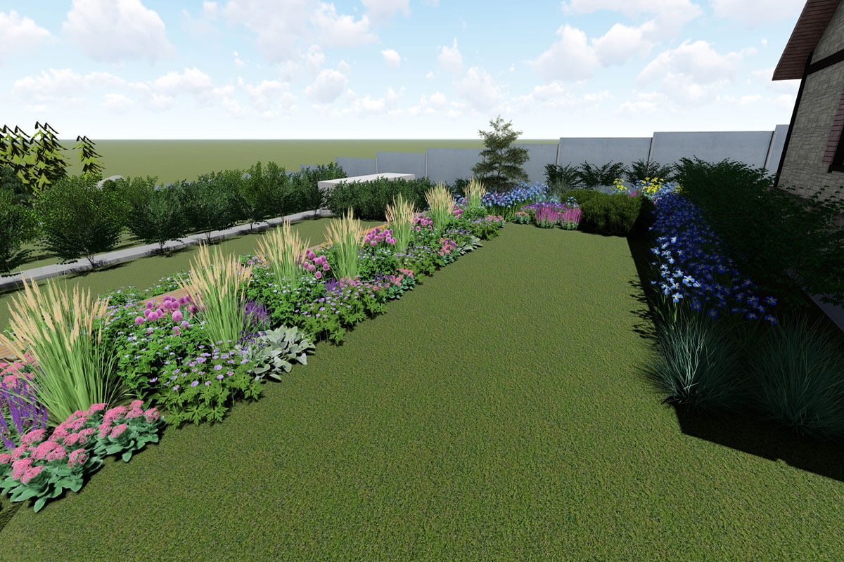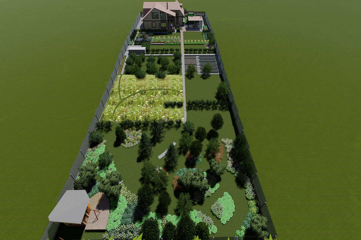 Благодаря перпендикулярным линиям относительно продольной оси участка, маскируется его большая протяженность по длине при сравнительно малой ширине, поэтому участок визуально будет казаться шире. За счет этих линий участок делится на три зоны. Каждая зона имеет свой характер и выполняет свою функцию.