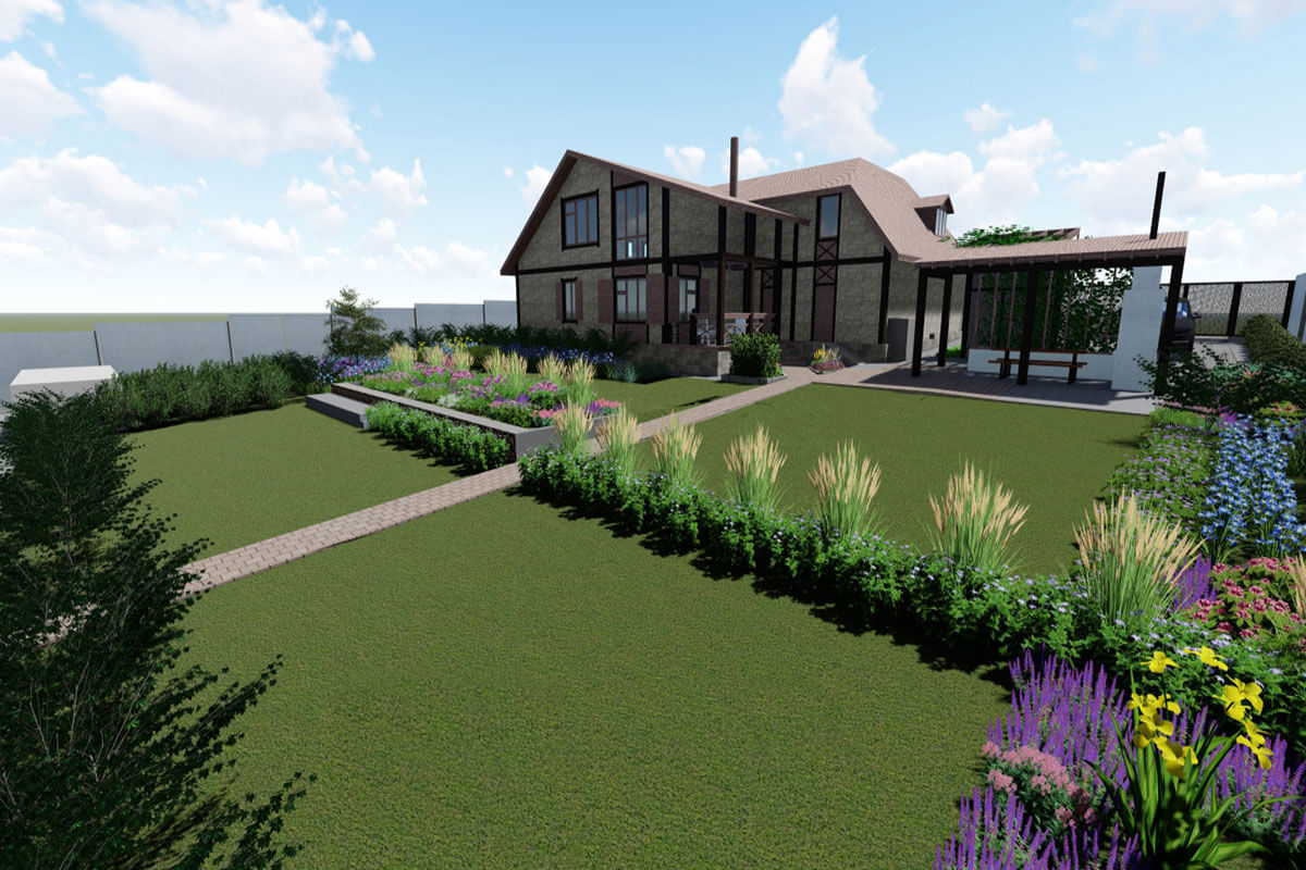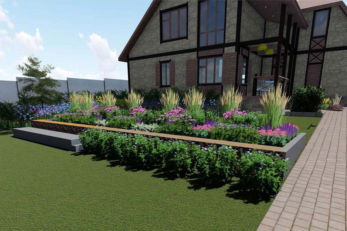 Первая зона — это зона регулярного сада с беседкой. Эта зона носит функциональный характер. Здесь хозяева проводят большую часть времени в саду, поэтому она достаточно уединенная и удобная в использовании за счет геометрического характера планировки. Уединенность создают массивы кустарников и смешанные блоки многолетников. Посадки вейника вдоль поперечной линии подпорной стенки создают некую ажурную вуаль между соседними зонами, создавая ненавязчивую камерность придомовой территории. Цветники составлены из структурных видов многолетников и сопутствующих видов, которые обеспечивают сезонную динамику посадкам.