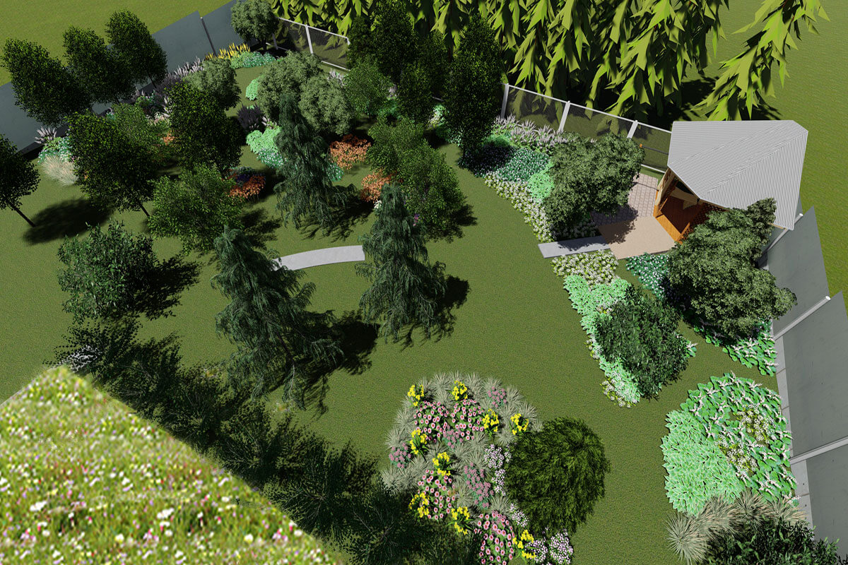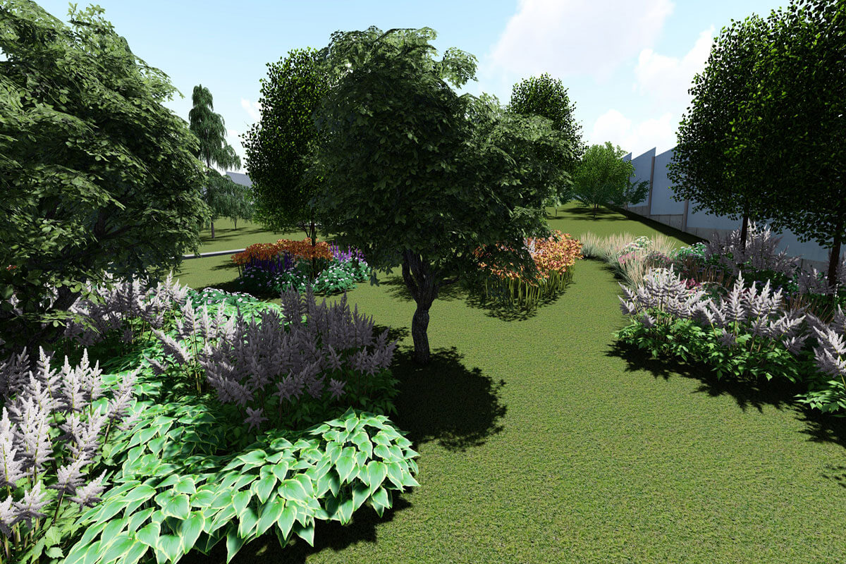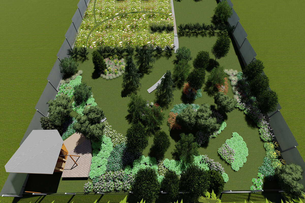Третья зона — пейзажный сад «Разнотравье», в котором сохранены существующие посадки хвойных и лиственных деревьев, естественное травяное покрытие. Посадки дополнены природными цветниками и цветущим лугом. Для этой части сада предусмотрены скошенные тропинки, утопающие в зеленой траве крупноформатные плиты, которые то исчезают, то вновь появляются на пути следования к нижней беседке. Здесь все природно и естественно, чтобы не нарушить слияние этой части сада с существующим лесом за границей участка.