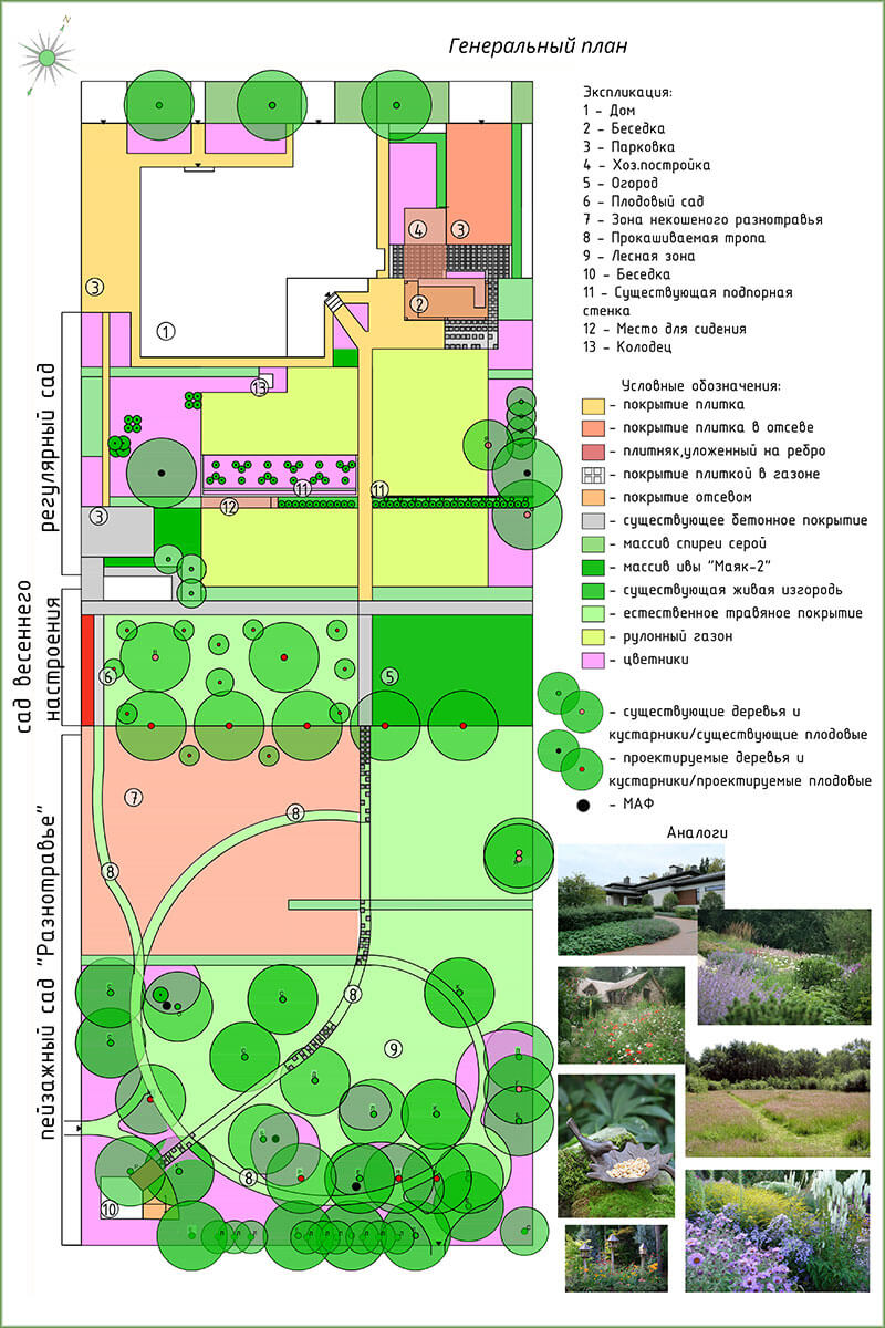 В основу планировочного решения легли существующие линии подпорных стенок, а также линии огорода и поперечной относительно оси участка бетонной дорожки. Их линии подчеркнуты посадками деревьев, живыми изгородями и цветниками.