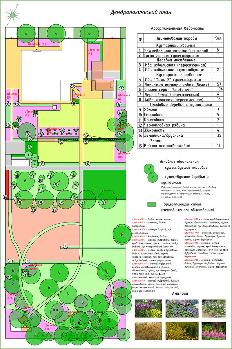 Участок достаточно вытянутый (80 м в длину) и относительно узкий (32 м в ширину) с перепадом высот 5 см на 1 м. В саду имелись две беседки, две подпорные стенки, огород, бетонные дорожки, росли некоторые многолетники, которые были учтены и включены в проектируемые цветники, и древесные насаждения в конце участка.