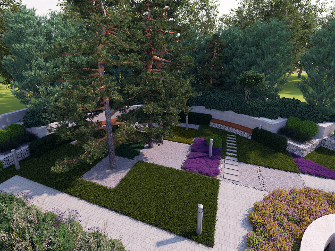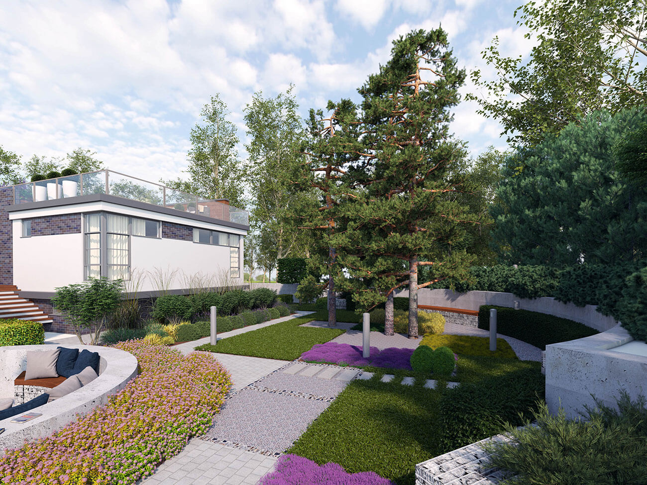 Дом с интересным архитектурным решением занимал большую площадь и делил участок на входную зону и внутренний сад. На участке росли сосны. Учитывая значительный перепад высот до 2 м, спроектировали террасы и подпорные стены с местами для посадок различных растений. Этот прием добавил саду объема и интересных видовых точек. В качестве материала для террас были использованы архитектурный бетон, габионы, кортен, эрклез.