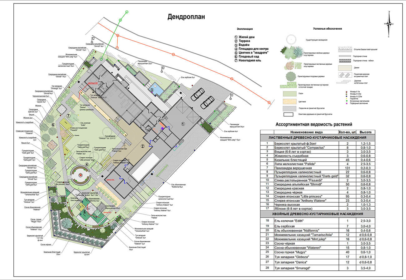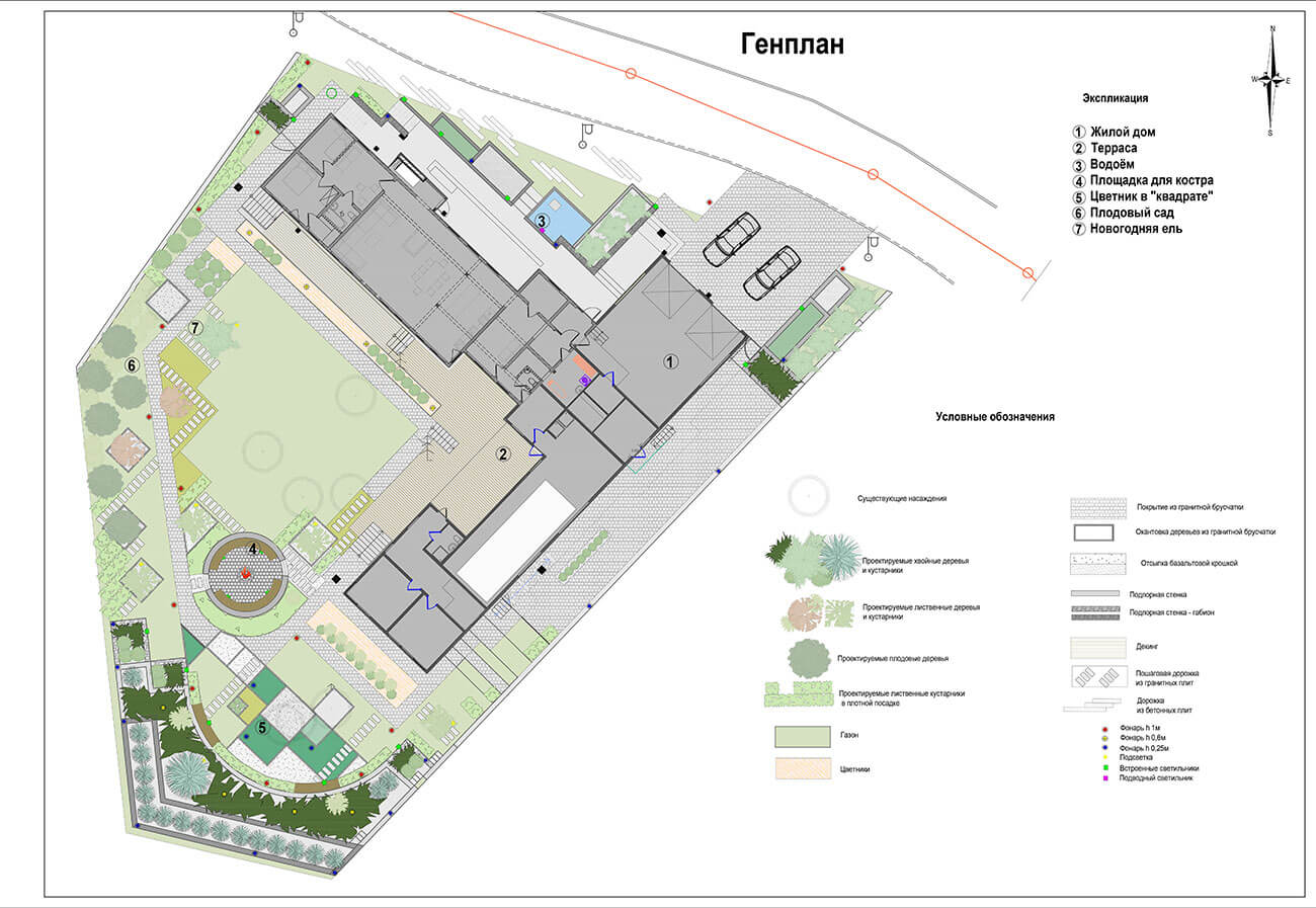 Внутренний сад спланирован с прогулочным маршрутом, ведущим мимо плодового сада к центральной зоне отдыха с кострищем и подпорным стенкам в южной части участка. Кострище планировалось сделать ниже уровня грунта и несколькими ступенями вниз и полукруглыми лавочками из габионов. В центре — <a target=
