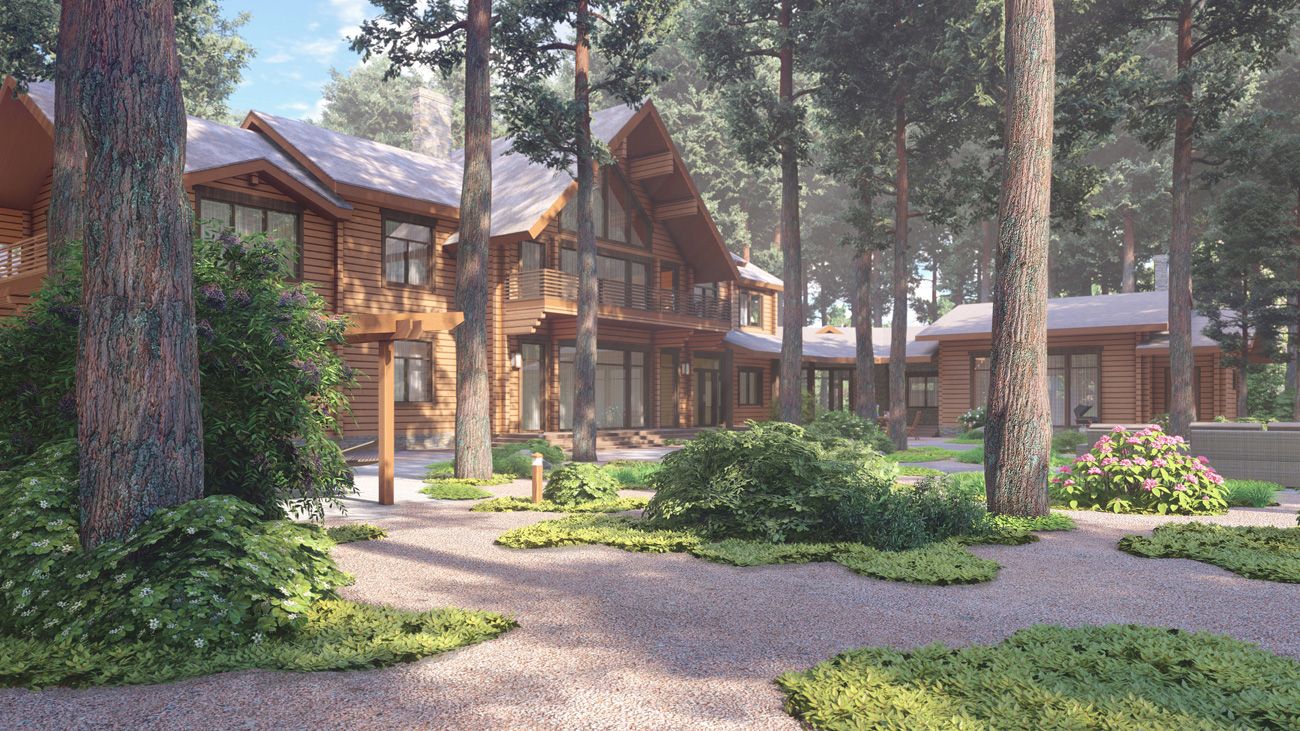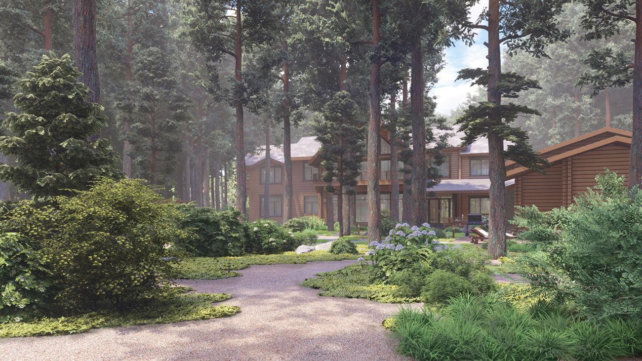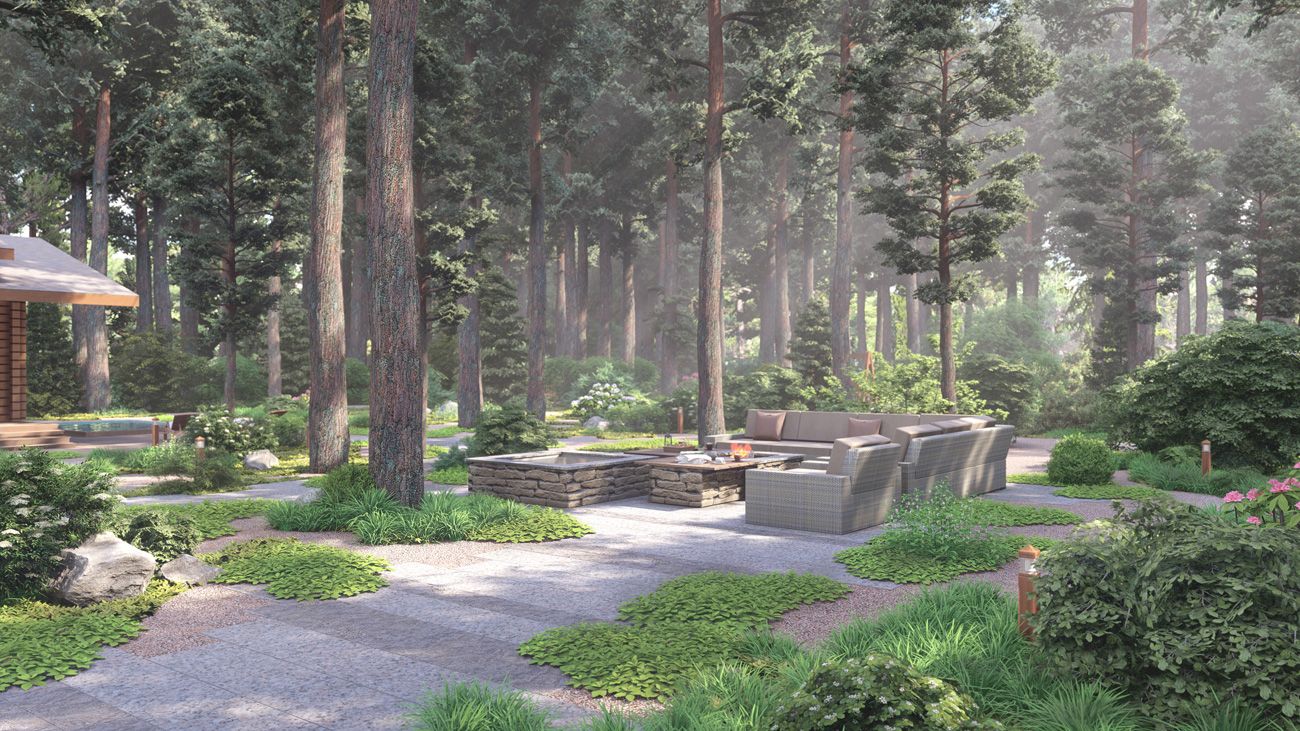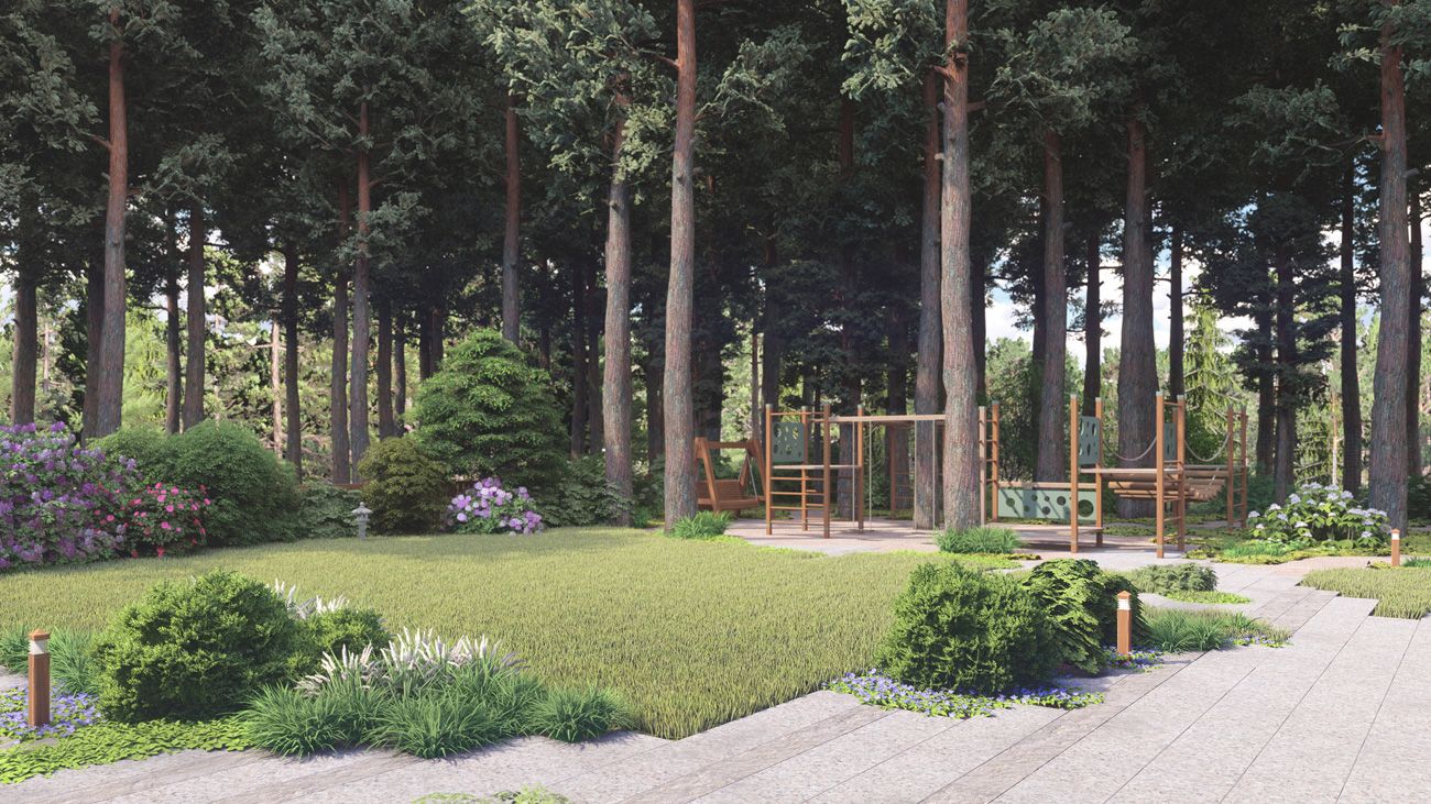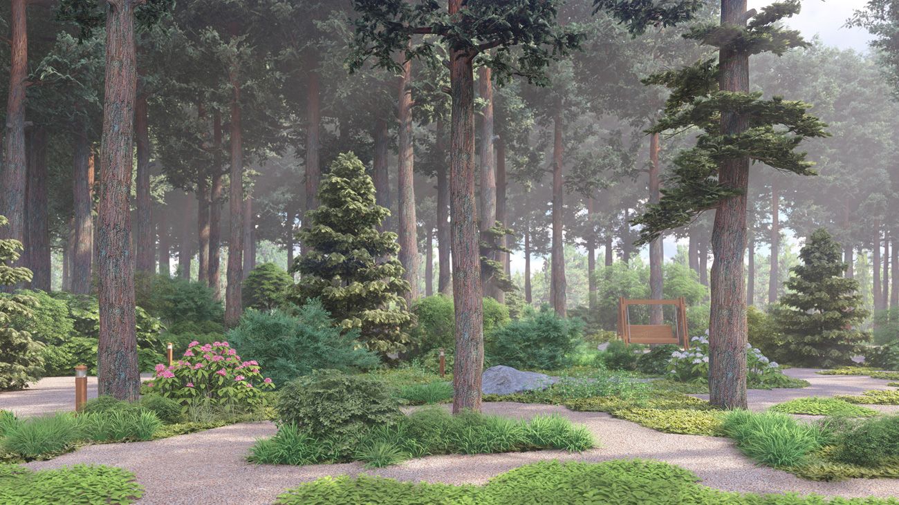 Для создания «лесных маршрутов» используются лиственные и хвойные почвопокровные теневыносливые кустарники, карликовые формы ели обыкновенной, можжевельника, микробиоты, кизильника, рододендрона. Средний ярус создают бересклеты, рододендроны, гортензии. Локально высаживаются деревья: клен гиннала, рябина, тсуга канадская, ель обыкновенная. Массивы из многолетних травянистых растений представлены геранью, шалфеем, гвоздикой, тиареллой, шиловидными флоксами и др. Особое место занимают массивы вересков, брусники и эрики.